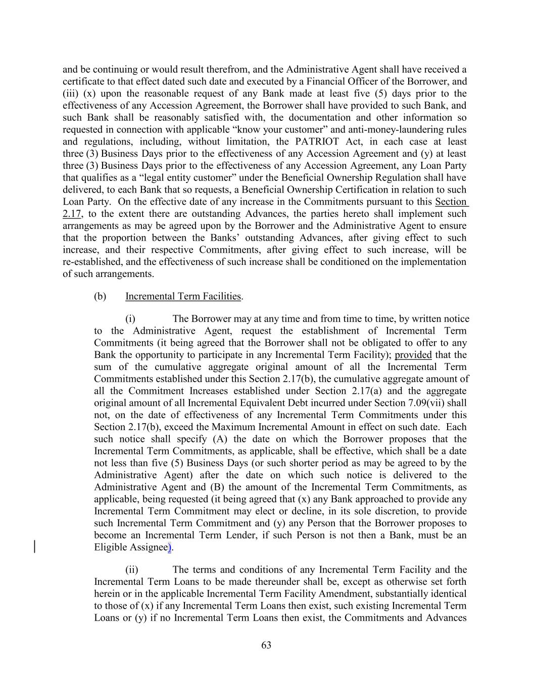 and be continuing or would result therefrom, and the Administrative Agent shall have received a certificate to that effect dated such date and executed by a Financial Officer of the Borrower, and (iii) (x) upon the reasonable request of any Bank made at least five (5) days prior to the effectiveness of any Accession Agreement, the Borrower shall have provided to such Bank, and such Bank shall be reasonably satisfied with, the documentation and other information so requested in connection with applicable “know your customer” and anti-money-laundering rules and regulations, including, without limitation, the PATRIOT Act, in each case at least three (3) Business Days prior to the effectiveness of any Accession Agreement and (y) at least three (3) Business Days prior to the effectiveness of any Accession Agreement, any Loan Party that qualifies as a “legal entity customer” under the Beneficial Ownership Regulation shall have delivered, to each Bank that so requests, a Beneficial Ownership Certification in relation to such Loan Party. On the effective date of any increase in the Commitments pursuant to this Section 2.17, to the extent there are outstanding Advances, the parties hereto shall implement such arrangements as may be agreed upon by the Borrower and the Administrative Agent to ensure that the proportion between the Banks’ outstanding Advances, after giving effect to such increase, and their respective Commitments, after giving effect to such increase, will be re-established, and the effectiveness of such increase shall be conditioned on the implementation of such arrangements. (b) Incremental Term Facilities. (i) The Borrower may at any time and from time to time, by written notice to the Administrative Agent, request the establishment of Incremental Term Commitments (it being agreed that the Borrower shall not be obligated to offer to any Bank the opportunity to participate in any Incremental Term Facility); provided that the sum of the cumulative aggregate original amount of all the Incremental Term Commitments established under this Section 2.17(b), the cumulative aggregate amount of all the Commitment Increases established under Section 2.17(a) and the aggregate original amount of all Incremental Equivalent Debt incurred under Section 7.09(vii) shall not, on the date of effectiveness of any Incremental Term Commitments under this Section 2.17(b), exceed the Maximum Incremental Amount in effect on such date. Each such notice shall specify (A) the date on which the Borrower proposes that the Incremental Term Commitments, as applicable, shall be effective, which shall be a date not less than five (5) Business Days (or such shorter period as may be agreed to by the Administrative Agent) after the date on which such notice is delivered to the Administrative Agent and (B) the amount of the Incremental Term Commitments, as applicable, being requested (it being agreed that (x) any Bank approached to provide any Incremental Term Commitment may elect or decline, in its sole discretion, to provide such Incremental Term Commitment and (y) any Person that the Borrower proposes to become an Incremental Term Lender, if such Person is not then a Bank, must be an Eligible Assignee). (ii) The terms and conditions of any Incremental Term Facility and the Incremental Term Loans to be made thereunder shall be, except as otherwise set forth herein or in the applicable Incremental Term Facility Amendment, substantially identical to those of (x) if any Incremental Term Loans then exist, such existing Incremental Term Loans or (y) if no Incremental Term Loans then exist, the Commitments and Advances 63