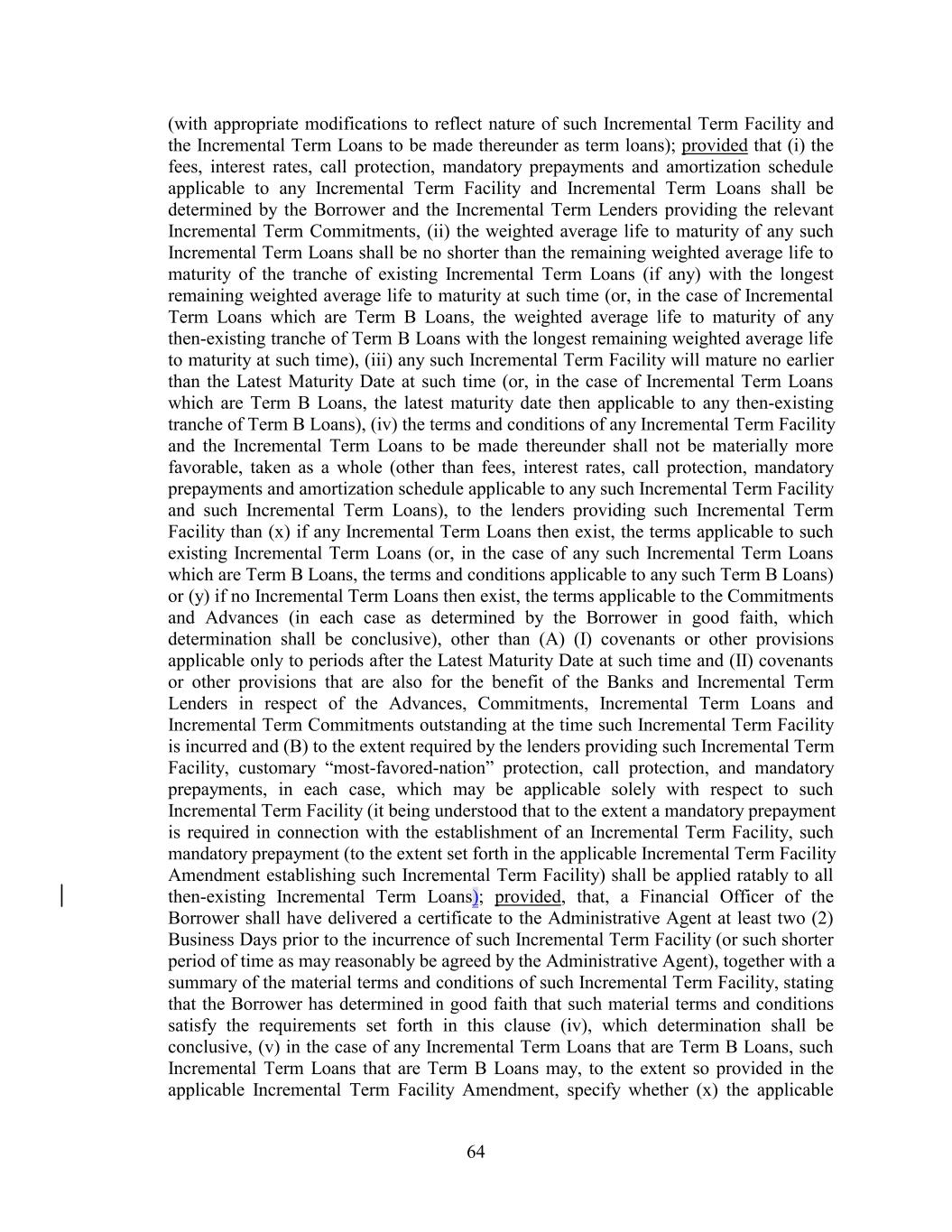 (with appropriate modifications to reflect nature of such Incremental Term Facility and the Incremental Term Loans to be made thereunder as term loans); provided that (i) the fees, interest rates, call protection, mandatory prepayments and amortization schedule applicable to any Incremental Term Facility and Incremental Term Loans shall be determined by the Borrower and the Incremental Term Lenders providing the relevant Incremental Term Commitments, (ii) the weighted average life to maturity of any such Incremental Term Loans shall be no shorter than the remaining weighted average life to maturity of the tranche of existing Incremental Term Loans (if any) with the longest remaining weighted average life to maturity at such time (or, in the case of Incremental Term Loans which are Term B Loans, the weighted average life to maturity of any then-existing tranche of Term B Loans with the longest remaining weighted average life to maturity at such time), (iii) any such Incremental Term Facility will mature no earlier than the Latest Maturity Date at such time (or, in the case of Incremental Term Loans which are Term B Loans, the latest maturity date then applicable to any then-existing tranche of Term B Loans), (iv) the terms and conditions of any Incremental Term Facility and the Incremental Term Loans to be made thereunder shall not be materially more favorable, taken as a whole (other than fees, interest rates, call protection, mandatory prepayments and amortization schedule applicable to any such Incremental Term Facility and such Incremental Term Loans), to the lenders providing such Incremental Term Facility than (x) if any Incremental Term Loans then exist, the terms applicable to such existing Incremental Term Loans (or, in the case of any such Incremental Term Loans which are Term B Loans, the terms and conditions applicable to any such Term B Loans) or (y) if no Incremental Term Loans then exist, the terms applicable to the Commitments and Advances (in each case as determined by the Borrower in good faith, which determination shall be conclusive), other than (A) (I) covenants or other provisions applicable only to periods after the Latest Maturity Date at such time and (II) covenants or other provisions that are also for the benefit of the Banks and Incremental Term Lenders in respect of the Advances, Commitments, Incremental Term Loans and Incremental Term Commitments outstanding at the time such Incremental Term Facility is incurred and (B) to the extent required by the lenders providing such Incremental Term Facility, customary “most-favored-nation” protection, call protection, and mandatory prepayments, in each case, which may be applicable solely with respect to such Incremental Term Facility (it being understood that to the extent a mandatory prepayment is required in connection with the establishment of an Incremental Term Facility, such mandatory prepayment (to the extent set forth in the applicable Incremental Term Facility Amendment establishing such Incremental Term Facility) shall be applied ratably to all then-existing Incremental Term Loans); provided, that, a Financial Officer of the Borrower shall have delivered a certificate to the Administrative Agent at least two (2) Business Days prior to the incurrence of such Incremental Term Facility (or such shorter period of time as may reasonably be agreed by the Administrative Agent), together with a summary of the material terms and conditions of such Incremental Term Facility, stating that the Borrower has determined in good faith that such material terms and conditions satisfy the requirements set forth in this clause (iv), which determination shall be conclusive, (v) in the case of any Incremental Term Loans that are Term B Loans, such Incremental Term Loans that are Term B Loans may, to the extent so provided in the applicable Incremental Term Facility Amendment, specify whether (x) the applicable 64
