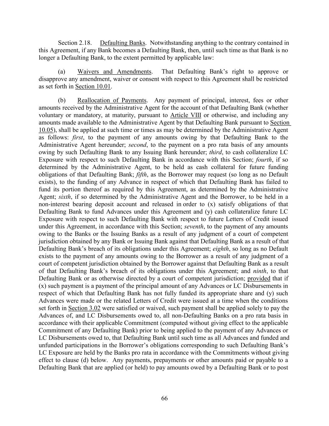 Section 2.18. Defaulting Banks. Notwithstanding anything to the contrary contained in this Agreement, if any Bank becomes a Defaulting Bank, then, until such time as that Bank is no longer a Defaulting Bank, to the extent permitted by applicable law: (a) Waivers and Amendments. That Defaulting Bank’s right to approve or disapprove any amendment, waiver or consent with respect to this Agreement shall be restricted as set forth in Section 10.01. (b) Reallocation of Payments. Any payment of principal, interest, fees or other amounts received by the Administrative Agent for the account of that Defaulting Bank (whether voluntary or mandatory, at maturity, pursuant to Article VIII or otherwise, and including any amounts made available to the Administrative Agent by that Defaulting Bank pursuant to Section 10.05), shall be applied at such time or times as may be determined by the Administrative Agent as follows: first, to the payment of any amounts owing by that Defaulting Bank to the Administrative Agent hereunder; second, to the payment on a pro rata basis of any amounts owing by such Defaulting Bank to any Issuing Bank hereunder; third, to cash collateralize LC Exposure with respect to such Defaulting Bank in accordance with this Section; fourth, if so determined by the Administrative Agent, to be held as cash collateral for future funding obligations of that Defaulting Bank; fifth, as the Borrower may request (so long as no Default exists), to the funding of any Advance in respect of which that Defaulting Bank has failed to fund its portion thereof as required by this Agreement, as determined by the Administrative Agent; sixth, if so determined by the Administrative Agent and the Borrower, to be held in a non-interest bearing deposit account and released in order to (x) satisfy obligations of that Defaulting Bank to fund Advances under this Agreement and (y) cash collateralize future LC Exposure with respect to such Defaulting Bank with respect to future Letters of Credit issued under this Agreement, in accordance with this Section; seventh, to the payment of any amounts owing to the Banks or the Issuing Banks as a result of any judgment of a court of competent jurisdiction obtained by any Bank or Issuing Bank against that Defaulting Bank as a result of that Defaulting Bank’s breach of its obligations under this Agreement; eighth, so long as no Default exists to the payment of any amounts owing to the Borrower as a result of any judgment of a court of competent jurisdiction obtained by the Borrower against that Defaulting Bank as a result of that Defaulting Bank’s breach of its obligations under this Agreement; and ninth, to that Defaulting Bank or as otherwise directed by a court of competent jurisdiction; provided that if (x) such payment is a payment of the principal amount of any Advances or LC Disbursements in respect of which that Defaulting Bank has not fully funded its appropriate share and (y) such Advances were made or the related Letters of Credit were issued at a time when the conditions set forth in Section 3.02 were satisfied or waived, such payment shall be applied solely to pay the Advances of, and LC Disbursements owed to, all non-Defaulting Banks on a pro rata basis in accordance with their applicable Commitment (computed without giving effect to the applicable Commitment of any Defaulting Bank) prior to being applied to the payment of any Advances or LC Disbursements owed to, that Defaulting Bank until such time as all Advances and funded and unfunded participations in the Borrower’s obligations corresponding to such Defaulting Bank’s LC Exposure are held by the Banks pro rata in accordance with the Commitments without giving effect to clause (d) below. Any payments, prepayments or other amounts paid or payable to a Defaulting Bank that are applied (or held) to pay amounts owed by a Defaulting Bank or to post 66