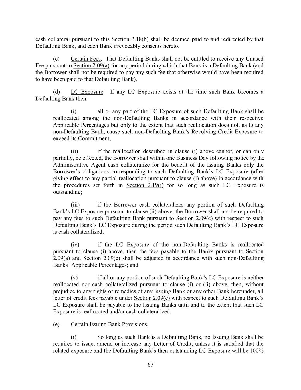 cash collateral pursuant to this Section 2.18(b) shall be deemed paid to and redirected by that Defaulting Bank, and each Bank irrevocably consents hereto. (c) Certain Fees. That Defaulting Banks shall not be entitled to receive any Unused Fee pursuant to Section 2.09(a) for any period during which that Bank is a Defaulting Bank (and the Borrower shall not be required to pay any such fee that otherwise would have been required to have been paid to that Defaulting Bank). (d) LC Exposure. If any LC Exposure exists at the time such Bank becomes a Defaulting Bank then: (i) all or any part of the LC Exposure of such Defaulting Bank shall be reallocated among the non-Defaulting Banks in accordance with their respective Applicable Percentages but only to the extent that such reallocation does not, as to any non-Defaulting Bank, cause such non-Defaulting Bank’s Revolving Credit Exposure to exceed its Commitment; (ii) if the reallocation described in clause (i) above cannot, or can only partially, be effected, the Borrower shall within one Business Day following notice by the Administrative Agent cash collateralize for the benefit of the Issuing Banks only the Borrower’s obligations corresponding to such Defaulting Bank’s LC Exposure (after giving effect to any partial reallocation pursuant to clause (i) above) in accordance with the procedures set forth in Section 2.19(j) for so long as such LC Exposure is outstanding; (iii) if the Borrower cash collateralizes any portion of such Defaulting Bank’s LC Exposure pursuant to clause (ii) above, the Borrower shall not be required to pay any fees to such Defaulting Bank pursuant to Section 2.09(c) with respect to such Defaulting Bank’s LC Exposure during the period such Defaulting Bank’s LC Exposure is cash collateralized; (iv) if the LC Exposure of the non-Defaulting Banks is reallocated pursuant to clause (i) above, then the fees payable to the Banks pursuant to Section 2.09(a) and Section 2.09(c) shall be adjusted in accordance with such non-Defaulting Banks’ Applicable Percentages; and (v) if all or any portion of such Defaulting Bank’s LC Exposure is neither reallocated nor cash collateralized pursuant to clause (i) or (ii) above, then, without prejudice to any rights or remedies of any Issuing Bank or any other Bank hereunder, all letter of credit fees payable under Section 2.09(c) with respect to such Defaulting Bank’s LC Exposure shall be payable to the Issuing Banks until and to the extent that such LC Exposure is reallocated and/or cash collateralized. (e) Certain Issuing Bank Provisions. (i) So long as such Bank is a Defaulting Bank, no Issuing Bank shall be required to issue, amend or increase any Letter of Credit, unless it is satisfied that the related exposure and the Defaulting Bank’s then outstanding LC Exposure will be 100% 67