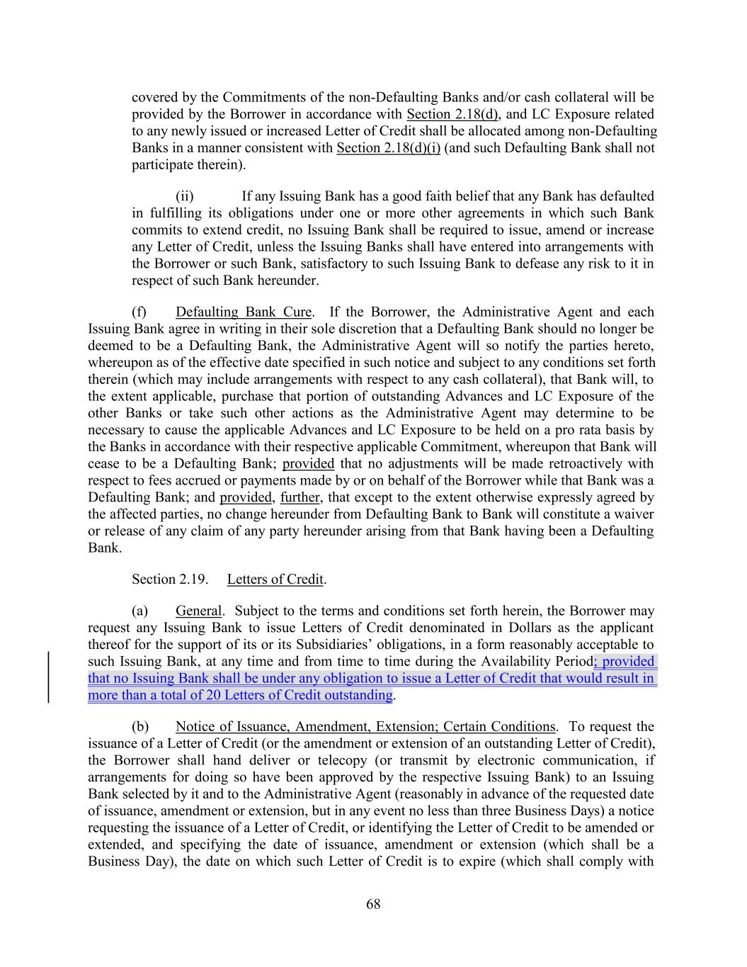 covered by the Commitments of the non-Defaulting Banks and/or cash collateral will be provided by the Borrower in accordance with Section 2.18(d), and LC Exposure related to any newly issued or increased Letter of Credit shall be allocated among non-Defaulting Banks in a manner consistent with Section 2.18(d)(i) (and such Defaulting Bank shall not participate therein). (ii) If any Issuing Bank has a good faith belief that any Bank has defaulted in fulfilling its obligations under one or more other agreements in which such Bank commits to extend credit, no Issuing Bank shall be required to issue, amend or increase any Letter of Credit, unless the Issuing Banks shall have entered into arrangements with the Borrower or such Bank, satisfactory to such Issuing Bank to defease any risk to it in respect of such Bank hereunder. (f) Defaulting Bank Cure. If the Borrower, the Administrative Agent and each Issuing Bank agree in writing in their sole discretion that a Defaulting Bank should no longer be deemed to be a Defaulting Bank, the Administrative Agent will so notify the parties hereto, whereupon as of the effective date specified in such notice and subject to any conditions set forth therein (which may include arrangements with respect to any cash collateral), that Bank will, to the extent applicable, purchase that portion of outstanding Advances and LC Exposure of the other Banks or take such other actions as the Administrative Agent may determine to be necessary to cause the applicable Advances and LC Exposure to be held on a pro rata basis by the Banks in accordance with their respective applicable Commitment, whereupon that Bank will cease to be a Defaulting Bank; provided that no adjustments will be made retroactively with respect to fees accrued or payments made by or on behalf of the Borrower while that Bank was a Defaulting Bank; and provided, further, that except to the extent otherwise expressly agreed by the affected parties, no change hereunder from Defaulting Bank to Bank will constitute a waiver or release of any claim of any party hereunder arising from that Bank having been a Defaulting Bank. Section 2.19. Letters of Credit. (a) General. Subject to the terms and conditions set forth herein, the Borrower may request any Issuing Bank to issue Letters of Credit denominated in Dollars as the applicant thereof for the support of its or its Subsidiaries’ obligations, in a form reasonably acceptable to such Issuing Bank, at any time and from time to time during the Availability Period; provided that no Issuing Bank shall be under any obligation to issue a Letter of Credit that would result in more than a total of 20 Letters of Credit outstanding. (b) Notice of Issuance, Amendment, Extension; Certain Conditions. To request the issuance of a Letter of Credit (or the amendment or extension of an outstanding Letter of Credit), the Borrower shall hand deliver or telecopy (or transmit by electronic communication, if arrangements for doing so have been approved by the respective Issuing Bank) to an Issuing Bank selected by it and to the Administrative Agent (reasonably in advance of the requested date of issuance, amendment or extension, but in any event no less than three Business Days) a notice requesting the issuance of a Letter of Credit, or identifying the Letter of Credit to be amended or extended, and specifying the date of issuance, amendment or extension (which shall be a Business Day), the date on which such Letter of Credit is to expire (which shall comply with 68