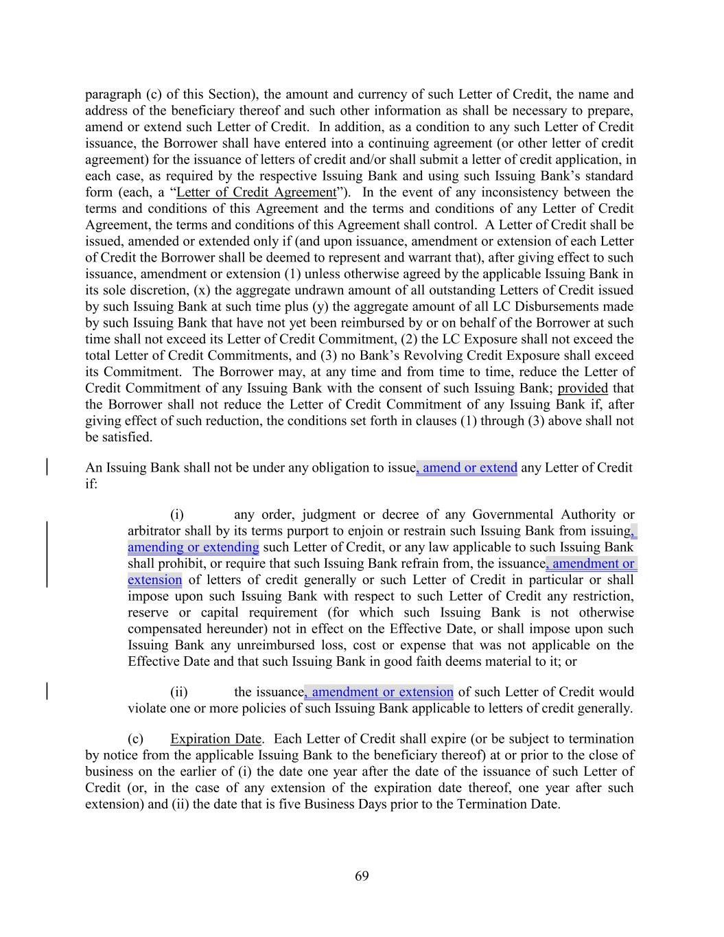 paragraph (c) of this Section), the amount and currency of such Letter of Credit, the name and address of the beneficiary thereof and such other information as shall be necessary to prepare, amend or extend such Letter of Credit. In addition, as a condition to any such Letter of Credit issuance, the Borrower shall have entered into a continuing agreement (or other letter of credit agreement) for the issuance of letters of credit and/or shall submit a letter of credit application, in each case, as required by the respective Issuing Bank and using such Issuing Bank’s standard form (each, a “Letter of Credit Agreement”). In the event of any inconsistency between the terms and conditions of this Agreement and the terms and conditions of any Letter of Credit Agreement, the terms and conditions of this Agreement shall control. A Letter of Credit shall be issued, amended or extended only if (and upon issuance, amendment or extension of each Letter of Credit the Borrower shall be deemed to represent and warrant that), after giving effect to such issuance, amendment or extension (1) unless otherwise agreed by the applicable Issuing Bank in its sole discretion, (x) the aggregate undrawn amount of all outstanding Letters of Credit issued by such Issuing Bank at such time plus (y) the aggregate amount of all LC Disbursements made by such Issuing Bank that have not yet been reimbursed by or on behalf of the Borrower at such time shall not exceed its Letter of Credit Commitment, (2) the LC Exposure shall not exceed the total Letter of Credit Commitments, and (3) no Bank’s Revolving Credit Exposure shall exceed its Commitment. The Borrower may, at any time and from time to time, reduce the Letter of Credit Commitment of any Issuing Bank with the consent of such Issuing Bank; provided that the Borrower shall not reduce the Letter of Credit Commitment of any Issuing Bank if, after giving effect of such reduction, the conditions set forth in clauses (1) through (3) above shall not be satisfied. An Issuing Bank shall not be under any obligation to issue, amend or extend any Letter of Credit if: (i) any order, judgment or decree of any Governmental Authority or arbitrator shall by its terms purport to enjoin or restrain such Issuing Bank from issuing, amending or extending such Letter of Credit, or any law applicable to such Issuing Bank shall prohibit, or require that such Issuing Bank refrain from, the issuance, amendment or extension of letters of credit generally or such Letter of Credit in particular or shall impose upon such Issuing Bank with respect to such Letter of Credit any restriction, reserve or capital requirement (for which such Issuing Bank is not otherwise compensated hereunder) not in effect on the Effective Date, or shall impose upon such Issuing Bank any unreimbursed loss, cost or expense that was not applicable on the Effective Date and that such Issuing Bank in good faith deems material to it; or (ii) the issuance, amendment or extension of such Letter of Credit would violate one or more policies of such Issuing Bank applicable to letters of credit generally. (c) Expiration Date. Each Letter of Credit shall expire (or be subject to termination by notice from the applicable Issuing Bank to the beneficiary thereof) at or prior to the close of business on the earlier of (i) the date one year after the date of the issuance of such Letter of Credit (or, in the case of any extension of the expiration date thereof, one year after such extension) and (ii) the date that is five Business Days prior to the Termination Date. 69