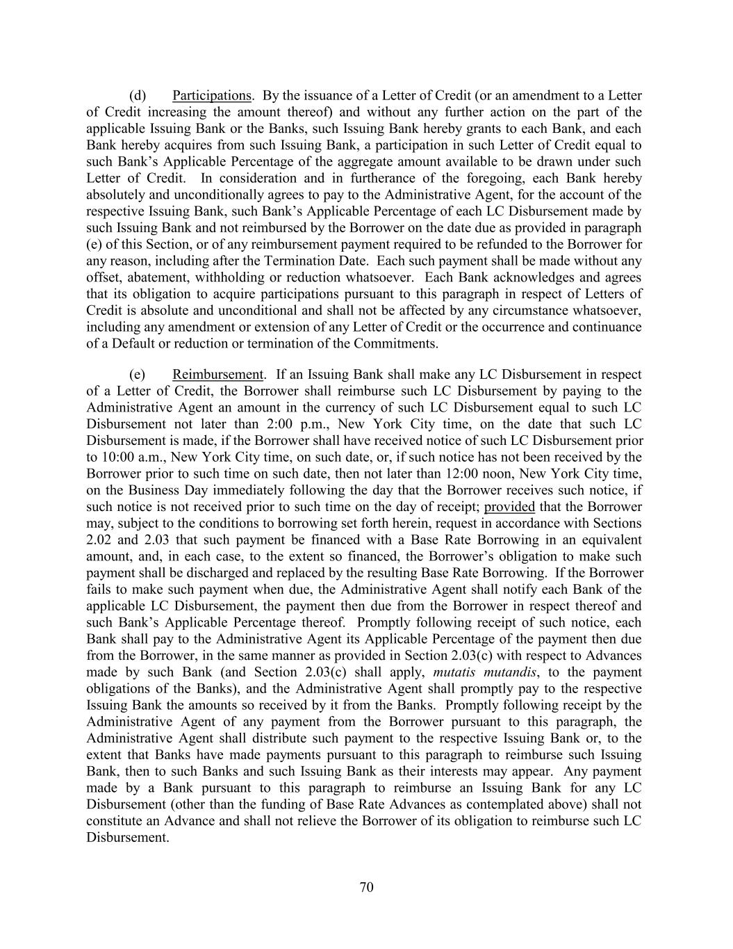 (d) Participations. By the issuance of a Letter of Credit (or an amendment to a Letter of Credit increasing the amount thereof) and without any further action on the part of the applicable Issuing Bank or the Banks, such Issuing Bank hereby grants to each Bank, and each Bank hereby acquires from such Issuing Bank, a participation in such Letter of Credit equal to such Bank’s Applicable Percentage of the aggregate amount available to be drawn under such Letter of Credit. In consideration and in furtherance of the foregoing, each Bank hereby absolutely and unconditionally agrees to pay to the Administrative Agent, for the account of the respective Issuing Bank, such Bank’s Applicable Percentage of each LC Disbursement made by such Issuing Bank and not reimbursed by the Borrower on the date due as provided in paragraph (e) of this Section, or of any reimbursement payment required to be refunded to the Borrower for any reason, including after the Termination Date. Each such payment shall be made without any offset, abatement, withholding or reduction whatsoever. Each Bank acknowledges and agrees that its obligation to acquire participations pursuant to this paragraph in respect of Letters of Credit is absolute and unconditional and shall not be affected by any circumstance whatsoever, including any amendment or extension of any Letter of Credit or the occurrence and continuance of a Default or reduction or termination of the Commitments. (e) Reimbursement. If an Issuing Bank shall make any LC Disbursement in respect of a Letter of Credit, the Borrower shall reimburse such LC Disbursement by paying to the Administrative Agent an amount in the currency of such LC Disbursement equal to such LC Disbursement not later than 2:00 p.m., New York City time, on the date that such LC Disbursement is made, if the Borrower shall have received notice of such LC Disbursement prior to 10:00 a.m., New York City time, on such date, or, if such notice has not been received by the Borrower prior to such time on such date, then not later than 12:00 noon, New York City time, on the Business Day immediately following the day that the Borrower receives such notice, if such notice is not received prior to such time on the day of receipt; provided that the Borrower may, subject to the conditions to borrowing set forth herein, request in accordance with Sections 2.02 and 2.03 that such payment be financed with a Base Rate Borrowing in an equivalent amount, and, in each case, to the extent so financed, the Borrower’s obligation to make such payment shall be discharged and replaced by the resulting Base Rate Borrowing. If the Borrower fails to make such payment when due, the Administrative Agent shall notify each Bank of the applicable LC Disbursement, the payment then due from the Borrower in respect thereof and such Bank’s Applicable Percentage thereof. Promptly following receipt of such notice, each Bank shall pay to the Administrative Agent its Applicable Percentage of the payment then due from the Borrower, in the same manner as provided in Section 2.03(c) with respect to Advances made by such Bank (and Section 2.03(c) shall apply, mutatis mutandis, to the payment obligations of the Banks), and the Administrative Agent shall promptly pay to the respective Issuing Bank the amounts so received by it from the Banks. Promptly following receipt by the Administrative Agent of any payment from the Borrower pursuant to this paragraph, the Administrative Agent shall distribute such payment to the respective Issuing Bank or, to the extent that Banks have made payments pursuant to this paragraph to reimburse such Issuing Bank, then to such Banks and such Issuing Bank as their interests may appear. Any payment made by a Bank pursuant to this paragraph to reimburse an Issuing Bank for any LC Disbursement (other than the funding of Base Rate Advances as contemplated above) shall not constitute an Advance and shall not relieve the Borrower of its obligation to reimburse such LC Disbursement. 70