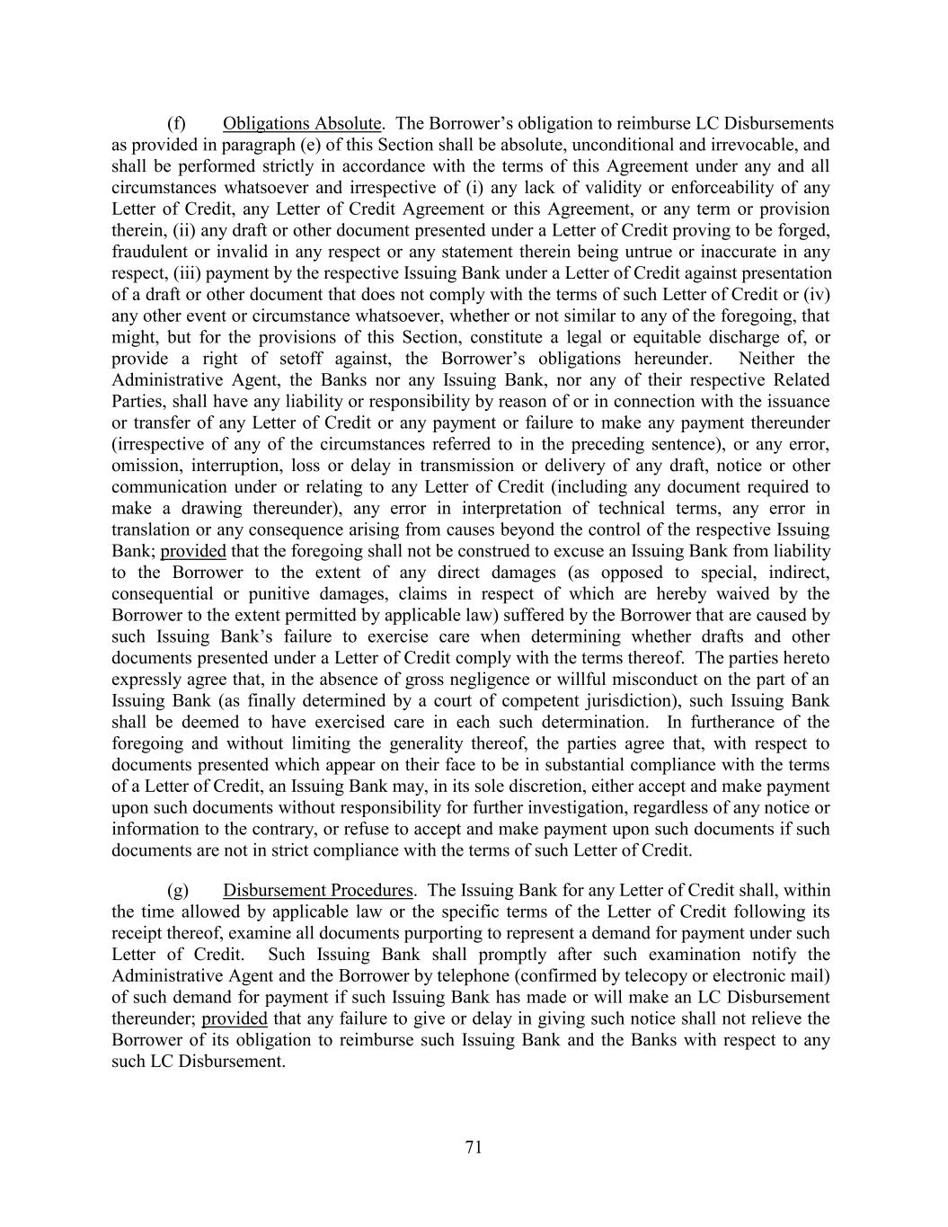 (f) Obligations Absolute. The Borrower’s obligation to reimburse LC Disbursements as provided in paragraph (e) of this Section shall be absolute, unconditional and irrevocable, and shall be performed strictly in accordance with the terms of this Agreement under any and all circumstances whatsoever and irrespective of (i) any lack of validity or enforceability of any Letter of Credit, any Letter of Credit Agreement or this Agreement, or any term or provision therein, (ii) any draft or other document presented under a Letter of Credit proving to be forged, fraudulent or invalid in any respect or any statement therein being untrue or inaccurate in any respect, (iii) payment by the respective Issuing Bank under a Letter of Credit against presentation of a draft or other document that does not comply with the terms of such Letter of Credit or (iv) any other event or circumstance whatsoever, whether or not similar to any of the foregoing, that might, but for the provisions of this Section, constitute a legal or equitable discharge of, or provide a right of setoff against, the Borrower’s obligations hereunder. Neither the Administrative Agent, the Banks nor any Issuing Bank, nor any of their respective Related Parties, shall have any liability or responsibility by reason of or in connection with the issuance or transfer of any Letter of Credit or any payment or failure to make any payment thereunder (irrespective of any of the circumstances referred to in the preceding sentence), or any error, omission, interruption, loss or delay in transmission or delivery of any draft, notice or other communication under or relating to any Letter of Credit (including any document required to make a drawing thereunder), any error in interpretation of technical terms, any error in translation or any consequence arising from causes beyond the control of the respective Issuing Bank; provided that the foregoing shall not be construed to excuse an Issuing Bank from liability to the Borrower to the extent of any direct damages (as opposed to special, indirect, consequential or punitive damages, claims in respect of which are hereby waived by the Borrower to the extent permitted by applicable law) suffered by the Borrower that are caused by such Issuing Bank’s failure to exercise care when determining whether drafts and other documents presented under a Letter of Credit comply with the terms thereof. The parties hereto expressly agree that, in the absence of gross negligence or willful misconduct on the part of an Issuing Bank (as finally determined by a court of competent jurisdiction), such Issuing Bank shall be deemed to have exercised care in each such determination. In furtherance of the foregoing and without limiting the generality thereof, the parties agree that, with respect to documents presented which appear on their face to be in substantial compliance with the terms of a Letter of Credit, an Issuing Bank may, in its sole discretion, either accept and make payment upon such documents without responsibility for further investigation, regardless of any notice or information to the contrary, or refuse to accept and make payment upon such documents if such documents are not in strict compliance with the terms of such Letter of Credit. (g) Disbursement Procedures. The Issuing Bank for any Letter of Credit shall, within the time allowed by applicable law or the specific terms of the Letter of Credit following its receipt thereof, examine all documents purporting to represent a demand for payment under such Letter of Credit. Such Issuing Bank shall promptly after such examination notify the Administrative Agent and the Borrower by telephone (confirmed by telecopy or electronic mail) of such demand for payment if such Issuing Bank has made or will make an LC Disbursement thereunder; provided that any failure to give or delay in giving such notice shall not relieve the Borrower of its obligation to reimburse such Issuing Bank and the Banks with respect to any such LC Disbursement. 71