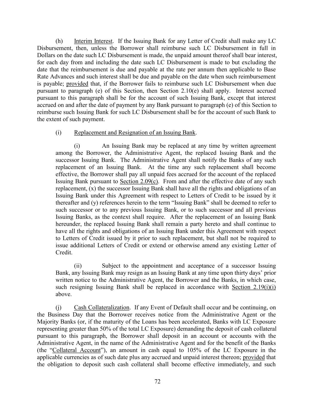 (h) Interim Interest. If the Issuing Bank for any Letter of Credit shall make any LC Disbursement, then, unless the Borrower shall reimburse such LC Disbursement in full in Dollars on the date such LC Disbursement is made, the unpaid amount thereof shall bear interest, for each day from and including the date such LC Disbursement is made to but excluding the date that the reimbursement is due and payable at the rate per annum then applicable to Base Rate Advances and such interest shall be due and payable on the date when such reimbursement is payable; provided that, if the Borrower fails to reimburse such LC Disbursement when due pursuant to paragraph (e) of this Section, then Section 2.10(e) shall apply. Interest accrued pursuant to this paragraph shall be for the account of such Issuing Bank, except that interest accrued on and after the date of payment by any Bank pursuant to paragraph (e) of this Section to reimburse such Issuing Bank for such LC Disbursement shall be for the account of such Bank to the extent of such payment. (i) Replacement and Resignation of an Issuing Bank. (i) An Issuing Bank may be replaced at any time by written agreement among the Borrower, the Administrative Agent, the replaced Issuing Bank and the successor Issuing Bank. The Administrative Agent shall notify the Banks of any such replacement of an Issuing Bank. At the time any such replacement shall become effective, the Borrower shall pay all unpaid fees accrued for the account of the replaced Issuing Bank pursuant to Section 2.09(c). From and after the effective date of any such replacement, (x) the successor Issuing Bank shall have all the rights and obligations of an Issuing Bank under this Agreement with respect to Letters of Credit to be issued by it thereafter and (y) references herein to the term “Issuing Bank” shall be deemed to refer to such successor or to any previous Issuing Bank, or to such successor and all previous Issuing Banks, as the context shall require. After the replacement of an Issuing Bank hereunder, the replaced Issuing Bank shall remain a party hereto and shall continue to have all the rights and obligations of an Issuing Bank under this Agreement with respect to Letters of Credit issued by it prior to such replacement, but shall not be required to issue additional Letters of Credit or extend or otherwise amend any existing Letter of Credit. (ii) Subject to the appointment and acceptance of a successor Issuing Bank, any Issuing Bank may resign as an Issuing Bank at any time upon thirty days’ prior written notice to the Administrative Agent, the Borrower and the Banks, in which case, such resigning Issuing Bank shall be replaced in accordance with Section 2.19(i)(i) above. (j) Cash Collateralization. If any Event of Default shall occur and be continuing, on the Business Day that the Borrower receives notice from the Administrative Agent or the Majority Banks (or, if the maturity of the Loans has been accelerated, Banks with LC Exposure representing greater than 50% of the total LC Exposure) demanding the deposit of cash collateral pursuant to this paragraph, the Borrower shall deposit in an account or accounts with the Administrative Agent, in the name of the Administrative Agent and for the benefit of the Banks (the “Collateral Account”), an amount in cash equal to 105% of the LC Exposure in the applicable currencies as of such date plus any accrued and unpaid interest thereon; provided that the obligation to deposit such cash collateral shall become effective immediately, and such 72