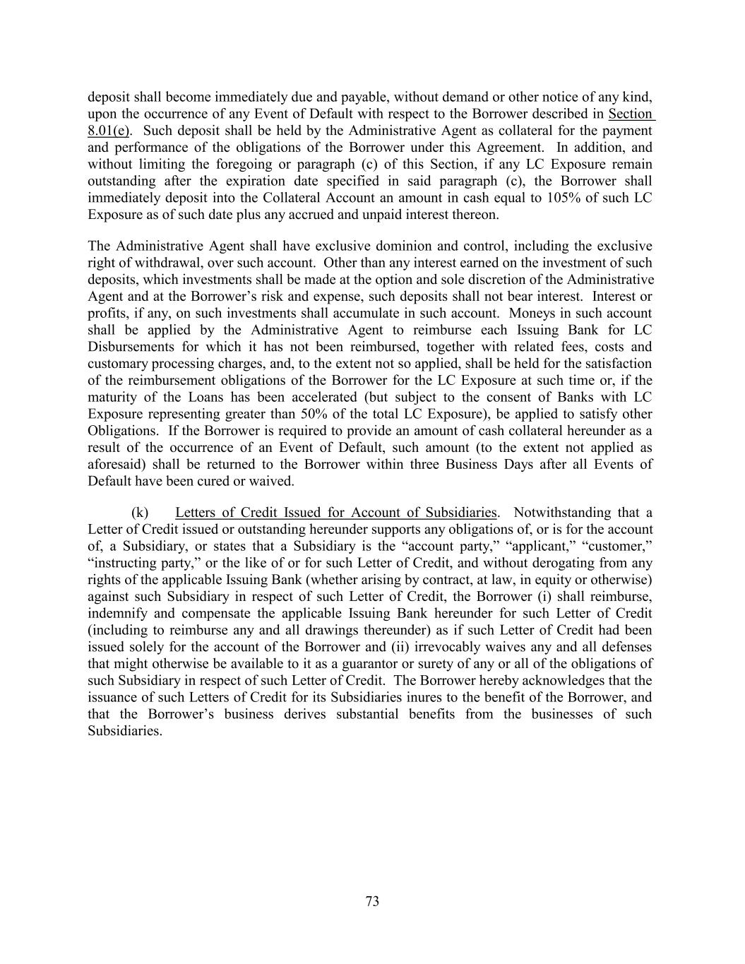 deposit shall become immediately due and payable, without demand or other notice of any kind, upon the occurrence of any Event of Default with respect to the Borrower described in Section 8.01(e). Such deposit shall be held by the Administrative Agent as collateral for the payment and performance of the obligations of the Borrower under this Agreement. In addition, and without limiting the foregoing or paragraph (c) of this Section, if any LC Exposure remain outstanding after the expiration date specified in said paragraph (c), the Borrower shall immediately deposit into the Collateral Account an amount in cash equal to 105% of such LC Exposure as of such date plus any accrued and unpaid interest thereon. The Administrative Agent shall have exclusive dominion and control, including the exclusive right of withdrawal, over such account. Other than any interest earned on the investment of such deposits, which investments shall be made at the option and sole discretion of the Administrative Agent and at the Borrower’s risk and expense, such deposits shall not bear interest. Interest or profits, if any, on such investments shall accumulate in such account. Moneys in such account shall be applied by the Administrative Agent to reimburse each Issuing Bank for LC Disbursements for which it has not been reimbursed, together with related fees, costs and customary processing charges, and, to the extent not so applied, shall be held for the satisfaction of the reimbursement obligations of the Borrower for the LC Exposure at such time or, if the maturity of the Loans has been accelerated (but subject to the consent of Banks with LC Exposure representing greater than 50% of the total LC Exposure), be applied to satisfy other Obligations. If the Borrower is required to provide an amount of cash collateral hereunder as a result of the occurrence of an Event of Default, such amount (to the extent not applied as aforesaid) shall be returned to the Borrower within three Business Days after all Events of Default have been cured or waived. (k) Letters of Credit Issued for Account of Subsidiaries. Notwithstanding that a Letter of Credit issued or outstanding hereunder supports any obligations of, or is for the account of, a Subsidiary, or states that a Subsidiary is the “account party,” “applicant,” “customer,” “instructing party,” or the like of or for such Letter of Credit, and without derogating from any rights of the applicable Issuing Bank (whether arising by contract, at law, in equity or otherwise) against such Subsidiary in respect of such Letter of Credit, the Borrower (i) shall reimburse, indemnify and compensate the applicable Issuing Bank hereunder for such Letter of Credit (including to reimburse any and all drawings thereunder) as if such Letter of Credit had been issued solely for the account of the Borrower and (ii) irrevocably waives any and all defenses that might otherwise be available to it as a guarantor or surety of any or all of the obligations of such Subsidiary in respect of such Letter of Credit. The Borrower hereby acknowledges that the issuance of such Letters of Credit for its Subsidiaries inures to the benefit of the Borrower, and that the Borrower’s business derives substantial benefits from the businesses of such Subsidiaries. 73