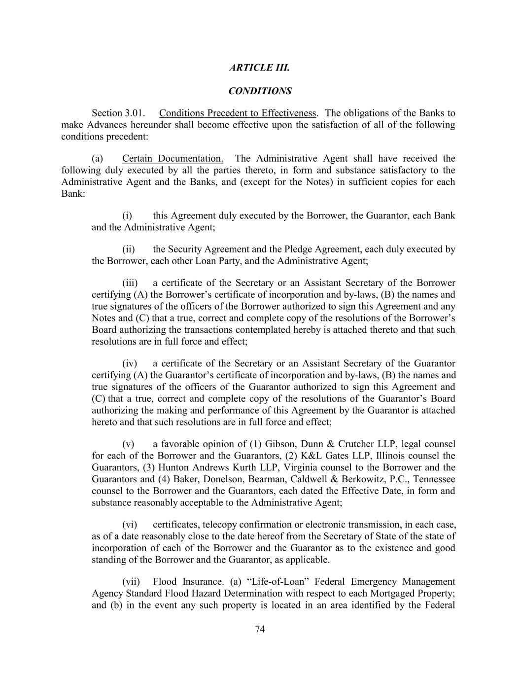 ARTICLE III. CONDITIONS Section 3.01. Conditions Precedent to Effectiveness. The obligations of the Banks to make Advances hereunder shall become effective upon the satisfaction of all of the following conditions precedent: (a) Certain Documentation. The Administrative Agent shall have received the following duly executed by all the parties thereto, in form and substance satisfactory to the Administrative Agent and the Banks, and (except for the Notes) in sufficient copies for each Bank: (i) this Agreement duly executed by the Borrower, the Guarantor, each Bank and the Administrative Agent; (ii) the Security Agreement and the Pledge Agreement, each duly executed by the Borrower, each other Loan Party, and the Administrative Agent; (iii) a certificate of the Secretary or an Assistant Secretary of the Borrower certifying (A) the Borrower’s certificate of incorporation and by-laws, (B) the names and true signatures of the officers of the Borrower authorized to sign this Agreement and any Notes and (C) that a true, correct and complete copy of the resolutions of the Borrower’s Board authorizing the transactions contemplated hereby is attached thereto and that such resolutions are in full force and effect; (iv) a certificate of the Secretary or an Assistant Secretary of the Guarantor certifying (A) the Guarantor’s certificate of incorporation and by-laws, (B) the names and true signatures of the officers of the Guarantor authorized to sign this Agreement and (C) that a true, correct and complete copy of the resolutions of the Guarantor’s Board authorizing the making and performance of this Agreement by the Guarantor is attached hereto and that such resolutions are in full force and effect; (v) a favorable opinion of (1) Gibson, Dunn & Crutcher LLP, legal counsel for each of the Borrower and the Guarantors, (2) K&L Gates LLP, Illinois counsel the Guarantors, (3) Hunton Andrews Kurth LLP, Virginia counsel to the Borrower and the Guarantors and (4) Baker, Donelson, Bearman, Caldwell & Berkowitz, P.C., Tennessee counsel to the Borrower and the Guarantors, each dated the Effective Date, in form and substance reasonably acceptable to the Administrative Agent; (vi) certificates, telecopy confirmation or electronic transmission, in each case, as of a date reasonably close to the date hereof from the Secretary of State of the state of incorporation of each of the Borrower and the Guarantor as to the existence and good standing of the Borrower and the Guarantor, as applicable. (vii) Flood Insurance. (a) “Life-of-Loan” Federal Emergency Management Agency Standard Flood Hazard Determination with respect to each Mortgaged Property; and (b) in the event any such property is located in an area identified by the Federal 74