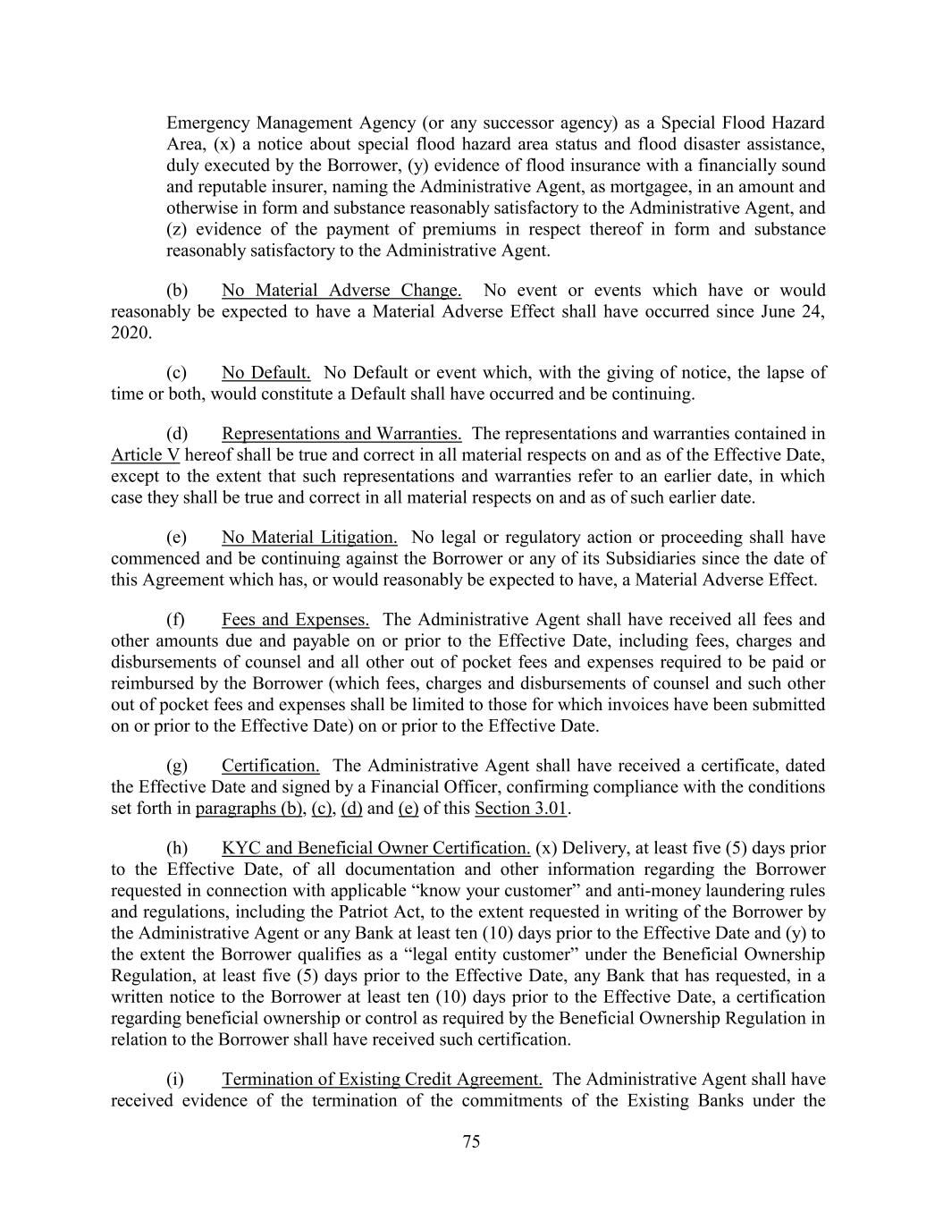 Emergency Management Agency (or any successor agency) as a Special Flood Hazard Area, (x) a notice about special flood hazard area status and flood disaster assistance, duly executed by the Borrower, (y) evidence of flood insurance with a financially sound and reputable insurer, naming the Administrative Agent, as mortgagee, in an amount and otherwise in form and substance reasonably satisfactory to the Administrative Agent, and (z) evidence of the payment of premiums in respect thereof in form and substance reasonably satisfactory to the Administrative Agent. (b) No Material Adverse Change. No event or events which have or would reasonably be expected to have a Material Adverse Effect shall have occurred since June 24, 2020. (c) No Default. No Default or event which, with the giving of notice, the lapse of time or both, would constitute a Default shall have occurred and be continuing. (d) Representations and Warranties. The representations and warranties contained in Article V hereof shall be true and correct in all material respects on and as of the Effective Date, except to the extent that such representations and warranties refer to an earlier date, in which case they shall be true and correct in all material respects on and as of such earlier date. (e) No Material Litigation. No legal or regulatory action or proceeding shall have commenced and be continuing against the Borrower or any of its Subsidiaries since the date of this Agreement which has, or would reasonably be expected to have, a Material Adverse Effect. (f) Fees and Expenses. The Administrative Agent shall have received all fees and other amounts due and payable on or prior to the Effective Date, including fees, charges and disbursements of counsel and all other out of pocket fees and expenses required to be paid or reimbursed by the Borrower (which fees, charges and disbursements of counsel and such other out of pocket fees and expenses shall be limited to those for which invoices have been submitted on or prior to the Effective Date) on or prior to the Effective Date. (g) Certification. The Administrative Agent shall have received a certificate, dated the Effective Date and signed by a Financial Officer, confirming compliance with the conditions set forth in paragraphs (b), (c), (d) and (e) of this Section 3.01. (h) KYC and Beneficial Owner Certification. (x) Delivery, at least five (5) days prior to the Effective Date, of all documentation and other information regarding the Borrower requested in connection with applicable “know your customer” and anti-money laundering rules and regulations, including the Patriot Act, to the extent requested in writing of the Borrower by the Administrative Agent or any Bank at least ten (10) days prior to the Effective Date and (y) to the extent the Borrower qualifies as a “legal entity customer” under the Beneficial Ownership Regulation, at least five (5) days prior to the Effective Date, any Bank that has requested, in a written notice to the Borrower at least ten (10) days prior to the Effective Date, a certification regarding beneficial ownership or control as required by the Beneficial Ownership Regulation in relation to the Borrower shall have received such certification. (i) Termination of Existing Credit Agreement. The Administrative Agent shall have received evidence of the termination of the commitments of the Existing Banks under the 75