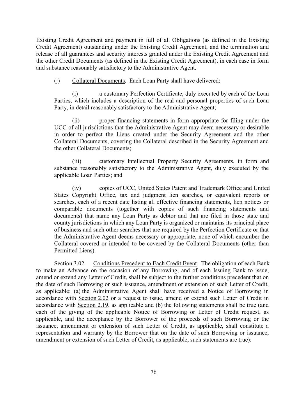 Existing Credit Agreement and payment in full of all Obligations (as defined in the Existing Credit Agreement) outstanding under the Existing Credit Agreement, and the termination and release of all guarantees and security interests granted under the Existing Credit Agreement and the other Credit Documents (as defined in the Existing Credit Agreement), in each case in form and substance reasonably satisfactory to the Administrative Agent. (j) Collateral Documents. Each Loan Party shall have delivered: (i) a customary Perfection Certificate, duly executed by each of the Loan Parties, which includes a description of the real and personal properties of such Loan Party, in detail reasonably satisfactory to the Administrative Agent; (ii) proper financing statements in form appropriate for filing under the UCC of all jurisdictions that the Administrative Agent may deem necessary or desirable in order to perfect the Liens created under the Security Agreement and the other Collateral Documents, covering the Collateral described in the Security Agreement and the other Collateral Documents; (iii) customary Intellectual Property Security Agreements, in form and substance reasonably satisfactory to the Administrative Agent, duly executed by the applicable Loan Parties; and (iv) copies of UCC, United States Patent and Trademark Office and United States Copyright Office, tax and judgment lien searches, or equivalent reports or searches, each of a recent date listing all effective financing statements, lien notices or comparable documents (together with copies of such financing statements and documents) that name any Loan Party as debtor and that are filed in those state and county jurisdictions in which any Loan Party is organized or maintains its principal place of business and such other searches that are required by the Perfection Certificate or that the Administrative Agent deems necessary or appropriate, none of which encumber the Collateral covered or intended to be covered by the Collateral Documents (other than Permitted Liens). Section 3.02. Conditions Precedent to Each Credit Event. The obligation of each Bank to make an Advance on the occasion of any Borrowing, and of each Issuing Bank to issue, amend or extend any Letter of Credit, shall be subject to the further conditions precedent that on the date of such Borrowing or such issuance, amendment or extension of such Letter of Credit, as applicable: (a) the Administrative Agent shall have received a Notice of Borrowing in accordance with Section 2.02 or a request to issue, amend or extend such Letter of Credit in accordance with Section 2.19, as applicable and (b) the following statements shall be true (and each of the giving of the applicable Notice of Borrowing or Letter of Credit request, as applicable, and the acceptance by the Borrower of the proceeds of such Borrowing or the issuance, amendment or extension of such Letter of Credit, as applicable, shall constitute a representation and warranty by the Borrower that on the date of such Borrowing or issuance, amendment or extension of such Letter of Credit, as applicable, such statements are true): 76