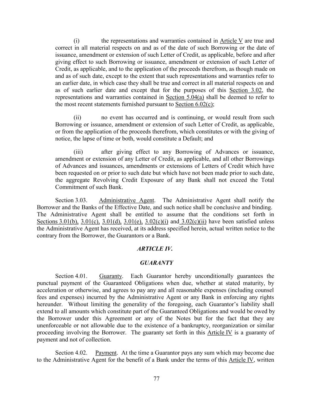 (i) the representations and warranties contained in Article V are true and correct in all material respects on and as of the date of such Borrowing or the date of issuance, amendment or extension of such Letter of Credit, as applicable, before and after giving effect to such Borrowing or issuance, amendment or extension of such Letter of Credit, as applicable, and to the application of the proceeds therefrom, as though made on and as of such date, except to the extent that such representations and warranties refer to an earlier date, in which case they shall be true and correct in all material respects on and as of such earlier date and except that for the purposes of this Section 3.02, the representations and warranties contained in Section 5.04(a) shall be deemed to refer to the most recent statements furnished pursuant to Section 6.02(c); (ii) no event has occurred and is continuing, or would result from such Borrowing or issuance, amendment or extension of such Letter of Credit, as applicable, or from the application of the proceeds therefrom, which constitutes or with the giving of notice, the lapse of time or both, would constitute a Default; and (iii) after giving effect to any Borrowing of Advances or issuance, amendment or extension of any Letter of Credit, as applicable, and all other Borrowings of Advances and issuances, amendments or extensions of Letters of Credit which have been requested on or prior to such date but which have not been made prior to such date, the aggregate Revolving Credit Exposure of any Bank shall not exceed the Total Commitment of such Bank. Section 3.03. Administrative Agent. The Administrative Agent shall notify the Borrower and the Banks of the Effective Date, and such notice shall be conclusive and binding. The Administrative Agent shall be entitled to assume that the conditions set forth in Sections 3.01(b), 3.01(c), 3.01(d), 3.01(e), 3.02(c)(i) and 3.02(c)(ii) have been satisfied unless the Administrative Agent has received, at its address specified herein, actual written notice to the contrary from the Borrower, the Guarantors or a Bank. ARTICLE IV. GUARANTY Section 4.01. Guaranty. Each Guarantor hereby unconditionally guarantees the punctual payment of the Guaranteed Obligations when due, whether at stated maturity, by acceleration or otherwise, and agrees to pay any and all reasonable expenses (including counsel fees and expenses) incurred by the Administrative Agent or any Bank in enforcing any rights hereunder. Without limiting the generality of the foregoing, each Guarantor’s liability shall extend to all amounts which constitute part of the Guaranteed Obligations and would be owed by the Borrower under this Agreement or any of the Notes but for the fact that they are unenforceable or not allowable due to the existence of a bankruptcy, reorganization or similar proceeding involving the Borrower. The guaranty set forth in this Article IV is a guaranty of payment and not of collection. Section 4.02. Payment. At the time a Guarantor pays any sum which may become due to the Administrative Agent for the benefit of a Bank under the terms of this Article IV, written 77
