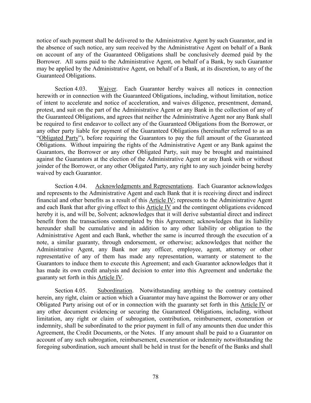notice of such payment shall be delivered to the Administrative Agent by such Guarantor, and in the absence of such notice, any sum received by the Administrative Agent on behalf of a Bank on account of any of the Guaranteed Obligations shall be conclusively deemed paid by the Borrower. All sums paid to the Administrative Agent, on behalf of a Bank, by such Guarantor may be applied by the Administrative Agent, on behalf of a Bank, at its discretion, to any of the Guaranteed Obligations. Section 4.03. Waiver. Each Guarantor hereby waives all notices in connection herewith or in connection with the Guaranteed Obligations, including, without limitation, notice of intent to accelerate and notice of acceleration, and waives diligence, presentment, demand, protest, and suit on the part of the Administrative Agent or any Bank in the collection of any of the Guaranteed Obligations, and agrees that neither the Administrative Agent nor any Bank shall be required to first endeavor to collect any of the Guaranteed Obligations from the Borrower, or any other party liable for payment of the Guaranteed Obligations (hereinafter referred to as an “Obligated Party”), before requiring the Guarantors to pay the full amount of the Guaranteed Obligations. Without impairing the rights of the Administrative Agent or any Bank against the Guarantors, the Borrower or any other Obligated Party, suit may be brought and maintained against the Guarantors at the election of the Administrative Agent or any Bank with or without joinder of the Borrower, or any other Obligated Party, any right to any such joinder being hereby waived by each Guarantor. Section 4.04. Acknowledgments and Representations. Each Guarantor acknowledges and represents to the Administrative Agent and each Bank that it is receiving direct and indirect financial and other benefits as a result of this Article IV; represents to the Administrative Agent and each Bank that after giving effect to this Article IV and the contingent obligations evidenced hereby it is, and will be, Solvent; acknowledges that it will derive substantial direct and indirect benefit from the transactions contemplated by this Agreement; acknowledges that its liability hereunder shall be cumulative and in addition to any other liability or obligation to the Administrative Agent and each Bank, whether the same is incurred through the execution of a note, a similar guaranty, through endorsement, or otherwise; acknowledges that neither the Administrative Agent, any Bank nor any officer, employee, agent, attorney or other representative of any of them has made any representation, warranty or statement to the Guarantors to induce them to execute this Agreement; and each Guarantor acknowledges that it has made its own credit analysis and decision to enter into this Agreement and undertake the guaranty set forth in this Article IV. Section 4.05. Subordination. Notwithstanding anything to the contrary contained herein, any right, claim or action which a Guarantor may have against the Borrower or any other Obligated Party arising out of or in connection with the guaranty set forth in this Article IV or any other document evidencing or securing the Guaranteed Obligations, including, without limitation, any right or claim of subrogation, contribution, reimbursement, exoneration or indemnity, shall be subordinated to the prior payment in full of any amounts then due under this Agreement, the Credit Documents, or the Notes. If any amount shall be paid to a Guarantor on account of any such subrogation, reimbursement, exoneration or indemnity notwithstanding the foregoing subordination, such amount shall be held in trust for the benefit of the Banks and shall 78
