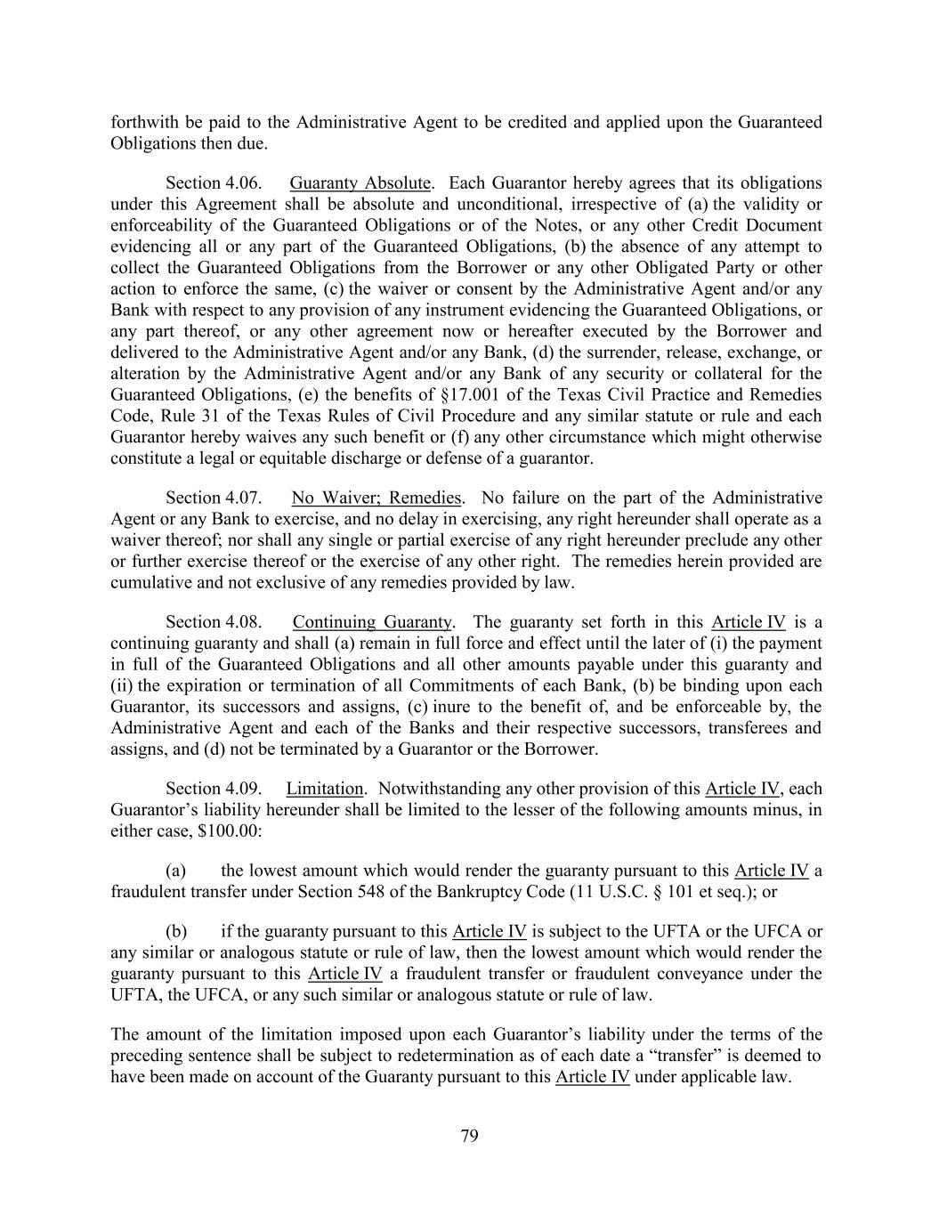 forthwith be paid to the Administrative Agent to be credited and applied upon the Guaranteed Obligations then due. Section 4.06. Guaranty Absolute. Each Guarantor hereby agrees that its obligations under this Agreement shall be absolute and unconditional, irrespective of (a) the validity or enforceability of the Guaranteed Obligations or of the Notes, or any other Credit Document evidencing all or any part of the Guaranteed Obligations, (b) the absence of any attempt to collect the Guaranteed Obligations from the Borrower or any other Obligated Party or other action to enforce the same, (c) the waiver or consent by the Administrative Agent and/or any Bank with respect to any provision of any instrument evidencing the Guaranteed Obligations, or any part thereof, or any other agreement now or hereafter executed by the Borrower and delivered to the Administrative Agent and/or any Bank, (d) the surrender, release, exchange, or alteration by the Administrative Agent and/or any Bank of any security or collateral for the Guaranteed Obligations, (e) the benefits of §17.001 of the Texas Civil Practice and Remedies Code, Rule 31 of the Texas Rules of Civil Procedure and any similar statute or rule and each Guarantor hereby waives any such benefit or (f) any other circumstance which might otherwise constitute a legal or equitable discharge or defense of a guarantor. Section 4.07. No Waiver; Remedies. No failure on the part of the Administrative Agent or any Bank to exercise, and no delay in exercising, any right hereunder shall operate as a waiver thereof; nor shall any single or partial exercise of any right hereunder preclude any other or further exercise thereof or the exercise of any other right. The remedies herein provided are cumulative and not exclusive of any remedies provided by law. Section 4.08. Continuing Guaranty. The guaranty set forth in this Article IV is a continuing guaranty and shall (a) remain in full force and effect until the later of (i) the payment in full of the Guaranteed Obligations and all other amounts payable under this guaranty and (ii) the expiration or termination of all Commitments of each Bank, (b) be binding upon each Guarantor, its successors and assigns, (c) inure to the benefit of, and be enforceable by, the Administrative Agent and each of the Banks and their respective successors, transferees and assigns, and (d) not be terminated by a Guarantor or the Borrower. Section 4.09. Limitation. Notwithstanding any other provision of this Article IV, each Guarantor’s liability hereunder shall be limited to the lesser of the following amounts minus, in either case, $100.00: (a) the lowest amount which would render the guaranty pursuant to this Article IV a fraudulent transfer under Section 548 of the Bankruptcy Code (11 U.S.C. § 101 et seq.); or (b) if the guaranty pursuant to this Article IV is subject to the UFTA or the UFCA or any similar or analogous statute or rule of law, then the lowest amount which would render the guaranty pursuant to this Article IV a fraudulent transfer or fraudulent conveyance under the UFTA, the UFCA, or any such similar or analogous statute or rule of law. The amount of the limitation imposed upon each Guarantor’s liability under the terms of the preceding sentence shall be subject to redetermination as of each date a “transfer” is deemed to have been made on account of the Guaranty pursuant to this Article IV under applicable law. 79