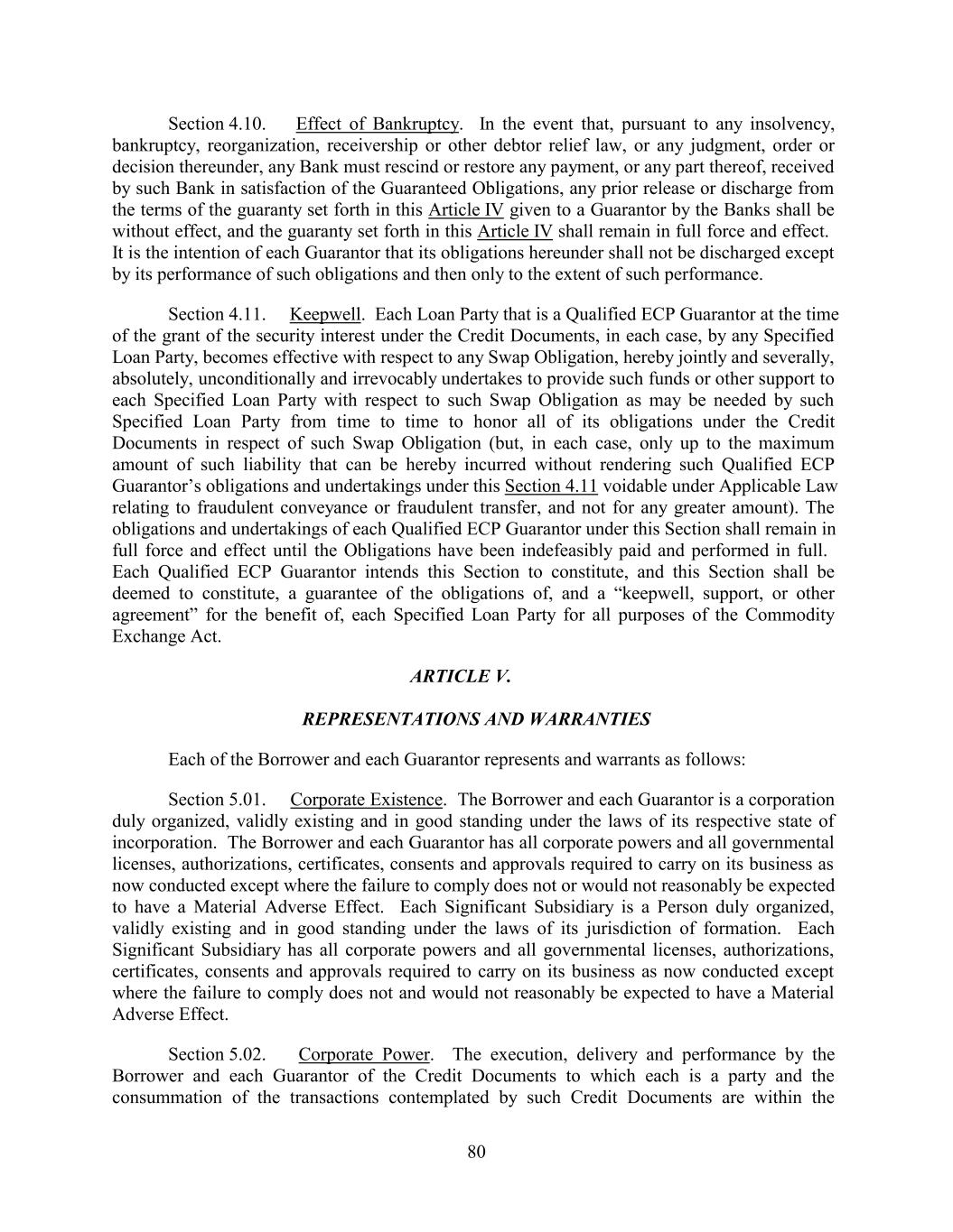 Section 4.10. Effect of Bankruptcy. In the event that, pursuant to any insolvency, bankruptcy, reorganization, receivership or other debtor relief law, or any judgment, order or decision thereunder, any Bank must rescind or restore any payment, or any part thereof, received by such Bank in satisfaction of the Guaranteed Obligations, any prior release or discharge from the terms of the guaranty set forth in this Article IV given to a Guarantor by the Banks shall be without effect, and the guaranty set forth in this Article IV shall remain in full force and effect. It is the intention of each Guarantor that its obligations hereunder shall not be discharged except by its performance of such obligations and then only to the extent of such performance. Section 4.11. Keepwell. Each Loan Party that is a Qualified ECP Guarantor at the time of the grant of the security interest under the Credit Documents, in each case, by any Specified Loan Party, becomes effective with respect to any Swap Obligation, hereby jointly and severally, absolutely, unconditionally and irrevocably undertakes to provide such funds or other support to each Specified Loan Party with respect to such Swap Obligation as may be needed by such Specified Loan Party from time to time to honor all of its obligations under the Credit Documents in respect of such Swap Obligation (but, in each case, only up to the maximum amount of such liability that can be hereby incurred without rendering such Qualified ECP Guarantor’s obligations and undertakings under this Section 4.11 voidable under Applicable Law relating to fraudulent conveyance or fraudulent transfer, and not for any greater amount). The obligations and undertakings of each Qualified ECP Guarantor under this Section shall remain in full force and effect until the Obligations have been indefeasibly paid and performed in full. Each Qualified ECP Guarantor intends this Section to constitute, and this Section shall be deemed to constitute, a guarantee of the obligations of, and a “keepwell, support, or other agreement” for the benefit of, each Specified Loan Party for all purposes of the Commodity Exchange Act. ARTICLE V. REPRESENTATIONS AND WARRANTIES Each of the Borrower and each Guarantor represents and warrants as follows: Section 5.01. Corporate Existence. The Borrower and each Guarantor is a corporation duly organized, validly existing and in good standing under the laws of its respective state of incorporation. The Borrower and each Guarantor has all corporate powers and all governmental licenses, authorizations, certificates, consents and approvals required to carry on its business as now conducted except where the failure to comply does not or would not reasonably be expected to have a Material Adverse Effect. Each Significant Subsidiary is a Person duly organized, validly existing and in good standing under the laws of its jurisdiction of formation. Each Significant Subsidiary has all corporate powers and all governmental licenses, authorizations, certificates, consents and approvals required to carry on its business as now conducted except where the failure to comply does not and would not reasonably be expected to have a Material Adverse Effect. Section 5.02. Corporate Power. The execution, delivery and performance by the Borrower and each Guarantor of the Credit Documents to which each is a party and the consummation of the transactions contemplated by such Credit Documents are within the 80
