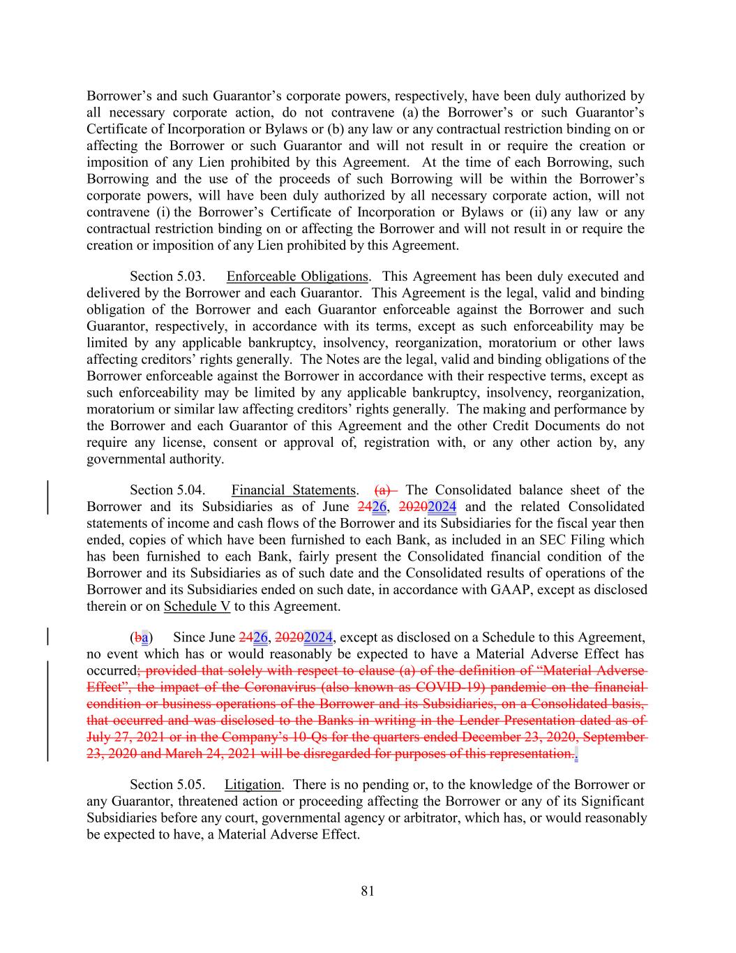 Borrower’s and such Guarantor’s corporate powers, respectively, have been duly authorized by all necessary corporate action, do not contravene (a) the Borrower’s or such Guarantor’s Certificate of Incorporation or Bylaws or (b) any law or any contractual restriction binding on or affecting the Borrower or such Guarantor and will not result in or require the creation or imposition of any Lien prohibited by this Agreement. At the time of each Borrowing, such Borrowing and the use of the proceeds of such Borrowing will be within the Borrower’s corporate powers, will have been duly authorized by all necessary corporate action, will not contravene (i) the Borrower’s Certificate of Incorporation or Bylaws or (ii) any law or any contractual restriction binding on or affecting the Borrower and will not result in or require the creation or imposition of any Lien prohibited by this Agreement. Section 5.03. Enforceable Obligations. This Agreement has been duly executed and delivered by the Borrower and each Guarantor. This Agreement is the legal, valid and binding obligation of the Borrower and each Guarantor enforceable against the Borrower and such Guarantor, respectively, in accordance with its terms, except as such enforceability may be limited by any applicable bankruptcy, insolvency, reorganization, moratorium or other laws affecting creditors’ rights generally. The Notes are the legal, valid and binding obligations of the Borrower enforceable against the Borrower in accordance with their respective terms, except as such enforceability may be limited by any applicable bankruptcy, insolvency, reorganization, moratorium or similar law affecting creditors’ rights generally. The making and performance by the Borrower and each Guarantor of this Agreement and the other Credit Documents do not require any license, consent or approval of, registration with, or any other action by, any governmental authority. Section 5.04. Financial Statements. (a) The Consolidated balance sheet of the Borrower and its Subsidiaries as of June 2426, 20202024 and the related Consolidated statements of income and cash flows of the Borrower and its Subsidiaries for the fiscal year then ended, copies of which have been furnished to each Bank, as included in an SEC Filing which has been furnished to each Bank, fairly present the Consolidated financial condition of the Borrower and its Subsidiaries as of such date and the Consolidated results of operations of the Borrower and its Subsidiaries ended on such date, in accordance with GAAP, except as disclosed therein or on Schedule V to this Agreement. (ba) Since June 2426, 20202024, except as disclosed on a Schedule to this Agreement, no event which has or would reasonably be expected to have a Material Adverse Effect has occurred; provided that solely with respect to clause (a) of the definition of “Material Adverse Effect”, the impact of the Coronavirus (also known as COVID-19) pandemic on the financial condition or business operations of the Borrower and its Subsidiaries, on a Consolidated basis, that occurred and was disclosed to the Banks in writing in the Lender Presentation dated as of July 27, 2021 or in the Company’s 10-Qs for the quarters ended December 23, 2020, September 23, 2020 and March 24, 2021 will be disregarded for purposes of this representation.. Section 5.05. Litigation. There is no pending or, to the knowledge of the Borrower or any Guarantor, threatened action or proceeding affecting the Borrower or any of its Significant Subsidiaries before any court, governmental agency or arbitrator, which has, or would reasonably be expected to have, a Material Adverse Effect. 81