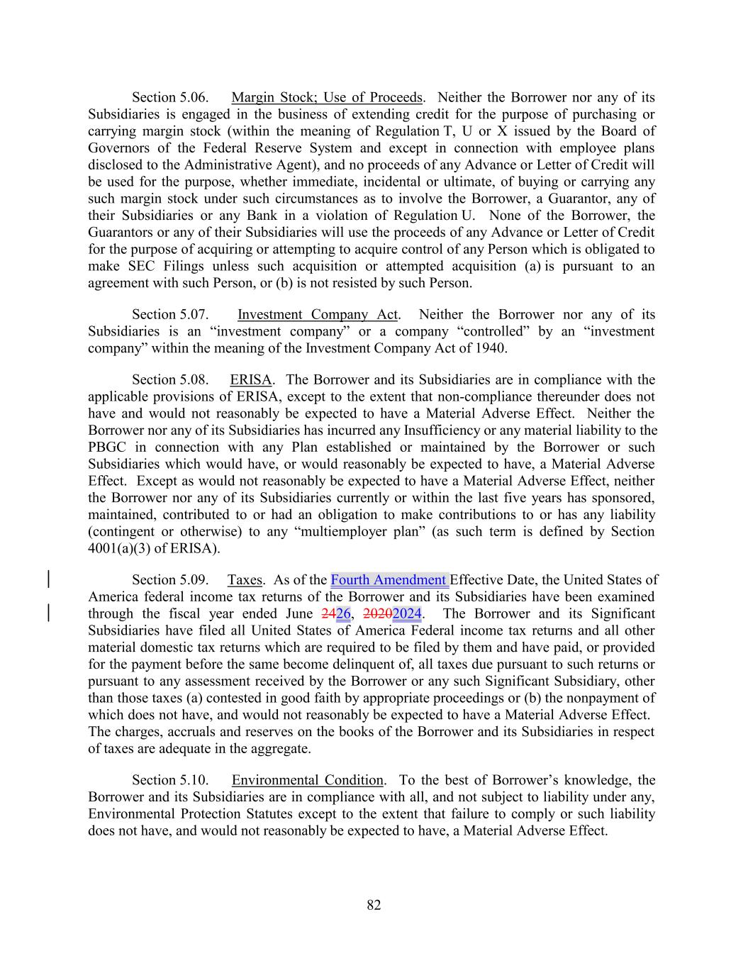 Section 5.06. Margin Stock; Use of Proceeds. Neither the Borrower nor any of its Subsidiaries is engaged in the business of extending credit for the purpose of purchasing or carrying margin stock (within the meaning of Regulation T, U or X issued by the Board of Governors of the Federal Reserve System and except in connection with employee plans disclosed to the Administrative Agent), and no proceeds of any Advance or Letter of Credit will be used for the purpose, whether immediate, incidental or ultimate, of buying or carrying any such margin stock under such circumstances as to involve the Borrower, a Guarantor, any of their Subsidiaries or any Bank in a violation of Regulation U. None of the Borrower, the Guarantors or any of their Subsidiaries will use the proceeds of any Advance or Letter of Credit for the purpose of acquiring or attempting to acquire control of any Person which is obligated to make SEC Filings unless such acquisition or attempted acquisition (a) is pursuant to an agreement with such Person, or (b) is not resisted by such Person. Section 5.07. Investment Company Act. Neither the Borrower nor any of its Subsidiaries is an “investment company” or a company “controlled” by an “investment company” within the meaning of the Investment Company Act of 1940. Section 5.08. ERISA. The Borrower and its Subsidiaries are in compliance with the applicable provisions of ERISA, except to the extent that non-compliance thereunder does not have and would not reasonably be expected to have a Material Adverse Effect. Neither the Borrower nor any of its Subsidiaries has incurred any Insufficiency or any material liability to the PBGC in connection with any Plan established or maintained by the Borrower or such Subsidiaries which would have, or would reasonably be expected to have, a Material Adverse Effect. Except as would not reasonably be expected to have a Material Adverse Effect, neither the Borrower nor any of its Subsidiaries currently or within the last five years has sponsored, maintained, contributed to or had an obligation to make contributions to or has any liability (contingent or otherwise) to any “multiemployer plan” (as such term is defined by Section 4001(a)(3) of ERISA). Section 5.09. Taxes. As of the Fourth Amendment Effective Date, the United States of America federal income tax returns of the Borrower and its Subsidiaries have been examined through the fiscal year ended June 2426, 20202024. The Borrower and its Significant Subsidiaries have filed all United States of America Federal income tax returns and all other material domestic tax returns which are required to be filed by them and have paid, or provided for the payment before the same become delinquent of, all taxes due pursuant to such returns or pursuant to any assessment received by the Borrower or any such Significant Subsidiary, other than those taxes (a) contested in good faith by appropriate proceedings or (b) the nonpayment of which does not have, and would not reasonably be expected to have a Material Adverse Effect. The charges, accruals and reserves on the books of the Borrower and its Subsidiaries in respect of taxes are adequate in the aggregate. Section 5.10. Environmental Condition. To the best of Borrower’s knowledge, the Borrower and its Subsidiaries are in compliance with all, and not subject to liability under any, Environmental Protection Statutes except to the extent that failure to comply or such liability does not have, and would not reasonably be expected to have, a Material Adverse Effect. 82