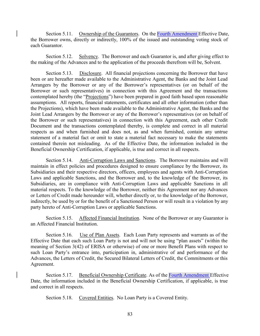 Section 5.11. Ownership of the Guarantors. On the Fourth Amendment Effective Date, the Borrower owns, directly or indirectly, 100% of the issued and outstanding voting stock of each Guarantor. Section 5.12. Solvency. The Borrower and each Guarantor is, and after giving effect to the making of the Advances and to the application of the proceeds therefrom will be, Solvent. Section 5.13. Disclosure. All financial projections concerning the Borrower that have been or are hereafter made available to the Administrative Agent, the Banks and the Joint Lead Arrangers by the Borrower or any of the Borrower’s representatives (or on behalf of the Borrower or such representatives) in connection with this Agreement and the transactions contemplated hereby (the “Projections”) have been prepared in good faith based upon reasonable assumptions. All reports, financial statements, certificates and all other information (other than the Projections), which have been made available to the Administrative Agent, the Banks and the Joint Lead Arrangers by the Borrower or any of the Borrower’s representatives (or on behalf of the Borrower or such representatives) in connection with this Agreement, each other Credit Document and the transactions contemplated thereby, is complete and correct in all material respects as and when furnished and does not, as and when furnished, contain any untrue statement of a material fact or omit to state a material fact necessary to make the statements contained therein not misleading. As of the Effective Date, the information included in the Beneficial Ownership Certification, if applicable, is true and correct in all respects. Section 5.14. Anti-Corruption Laws and Sanctions. The Borrower maintains and will maintain in effect policies and procedures designed to ensure compliance by the Borrower, its Subsidiaries and their respective directors, officers, employees and agents with Anti-Corruption Laws and applicable Sanctions, and the Borrower and, to the knowledge of the Borrower, its Subsidiaries, are in compliance with Anti-Corruption Laws and applicable Sanctions in all material respects. To the knowledge of the Borrower, neither this Agreement nor any Advances or Letters of Credit made hereunder will, whether directly or, to the knowledge of the Borrower, indirectly, be used by or for the benefit of a Sanctioned Person or will result in a violation by any party hereto of Anti-Corruption Laws or applicable Sanctions. Section 5.15. Affected Financial Institution. None of the Borrower or any Guarantor is an Affected Financial Institution. Section 5.16. Use of Plan Assets. Each Loan Party represents and warrants as of the Effective Date that each such Loan Party is not and will not be using “plan assets” (within the meaning of Section 3(42) of ERISA or otherwise) of one or more Benefit Plans with respect to such Loan Party’s entrance into, participation in, administrative of and performance of the Advances, the Letters of Credit, the Secured Bilateral Letters of Credit, the Commitments or this Agreement. Section 5.17. Beneficial Ownership Certificate. As of the Fourth Amendment Effective Date, the information included in the Beneficial Ownership Certification, if applicable, is true and correct in all respects. Section 5.18. Covered Entities. No Loan Party is a Covered Entity. 83
