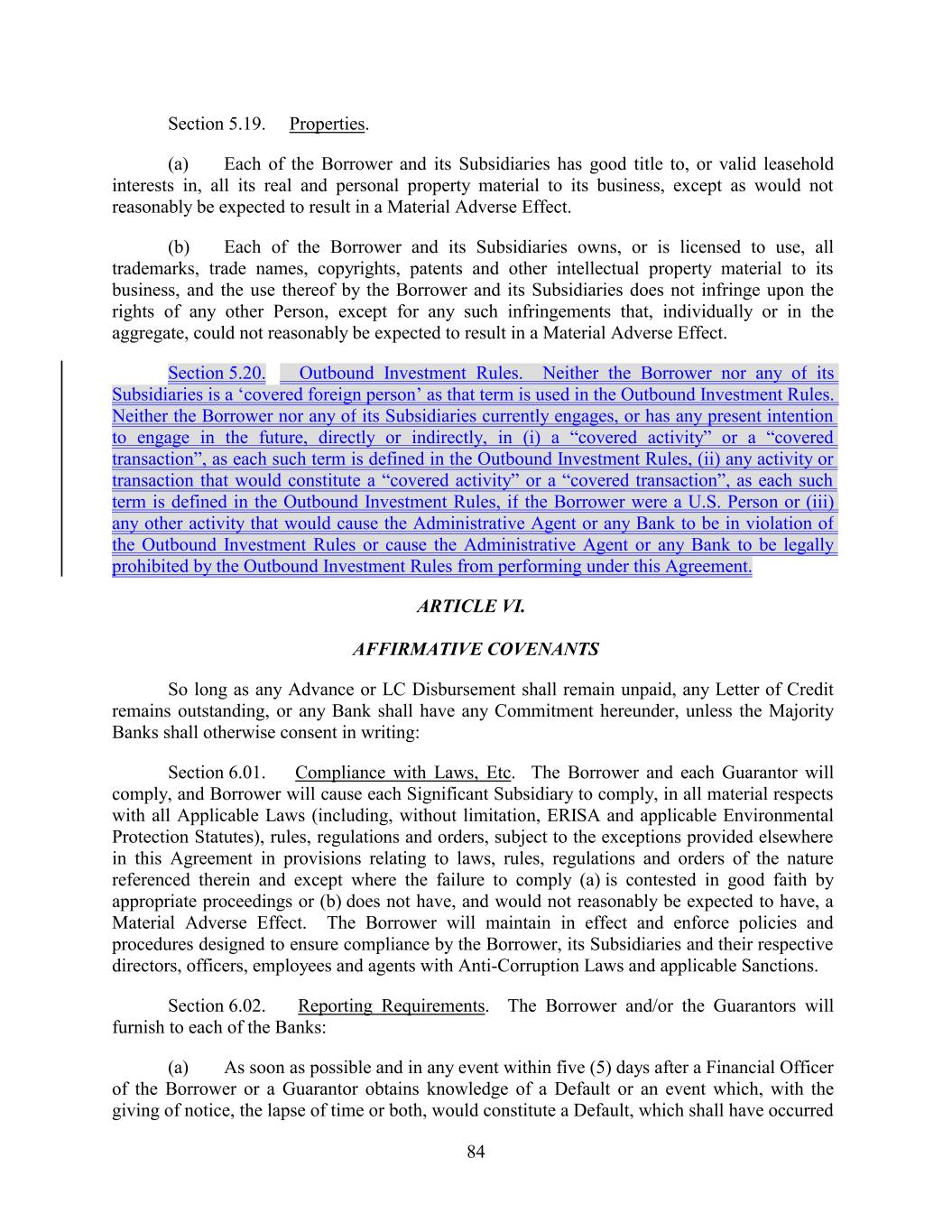 Section 5.19. Properties. (a) Each of the Borrower and its Subsidiaries has good title to, or valid leasehold interests in, all its real and personal property material to its business, except as would not reasonably be expected to result in a Material Adverse Effect. (b) Each of the Borrower and its Subsidiaries owns, or is licensed to use, all trademarks, trade names, copyrights, patents and other intellectual property material to its business, and the use thereof by the Borrower and its Subsidiaries does not infringe upon the rights of any other Person, except for any such infringements that, individually or in the aggregate, could not reasonably be expected to result in a Material Adverse Effect. Section 5.20. Outbound Investment Rules. Neither the Borrower nor any of its Subsidiaries is a ‘covered foreign person’ as that term is used in the Outbound Investment Rules. Neither the Borrower nor any of its Subsidiaries currently engages, or has any present intention to engage in the future, directly or indirectly, in (i) a “covered activity” or a “covered transaction”, as each such term is defined in the Outbound Investment Rules, (ii) any activity or transaction that would constitute a “covered activity” or a “covered transaction”, as each such term is defined in the Outbound Investment Rules, if the Borrower were a U.S. Person or (iii) any other activity that would cause the Administrative Agent or any Bank to be in violation of the Outbound Investment Rules or cause the Administrative Agent or any Bank to be legally prohibited by the Outbound Investment Rules from performing under this Agreement. ARTICLE VI. AFFIRMATIVE COVENANTS So long as any Advance or LC Disbursement shall remain unpaid, any Letter of Credit remains outstanding, or any Bank shall have any Commitment hereunder, unless the Majority Banks shall otherwise consent in writing: Section 6.01. Compliance with Laws, Etc. The Borrower and each Guarantor will comply, and Borrower will cause each Significant Subsidiary to comply, in all material respects with all Applicable Laws (including, without limitation, ERISA and applicable Environmental Protection Statutes), rules, regulations and orders, subject to the exceptions provided elsewhere in this Agreement in provisions relating to laws, rules, regulations and orders of the nature referenced therein and except where the failure to comply (a) is contested in good faith by appropriate proceedings or (b) does not have, and would not reasonably be expected to have, a Material Adverse Effect. The Borrower will maintain in effect and enforce policies and procedures designed to ensure compliance by the Borrower, its Subsidiaries and their respective directors, officers, employees and agents with Anti-Corruption Laws and applicable Sanctions. Section 6.02. Reporting Requirements. The Borrower and/or the Guarantors will furnish to each of the Banks: (a) As soon as possible and in any event within five (5) days after a Financial Officer of the Borrower or a Guarantor obtains knowledge of a Default or an event which, with the giving of notice, the lapse of time or both, would constitute a Default, which shall have occurred 84