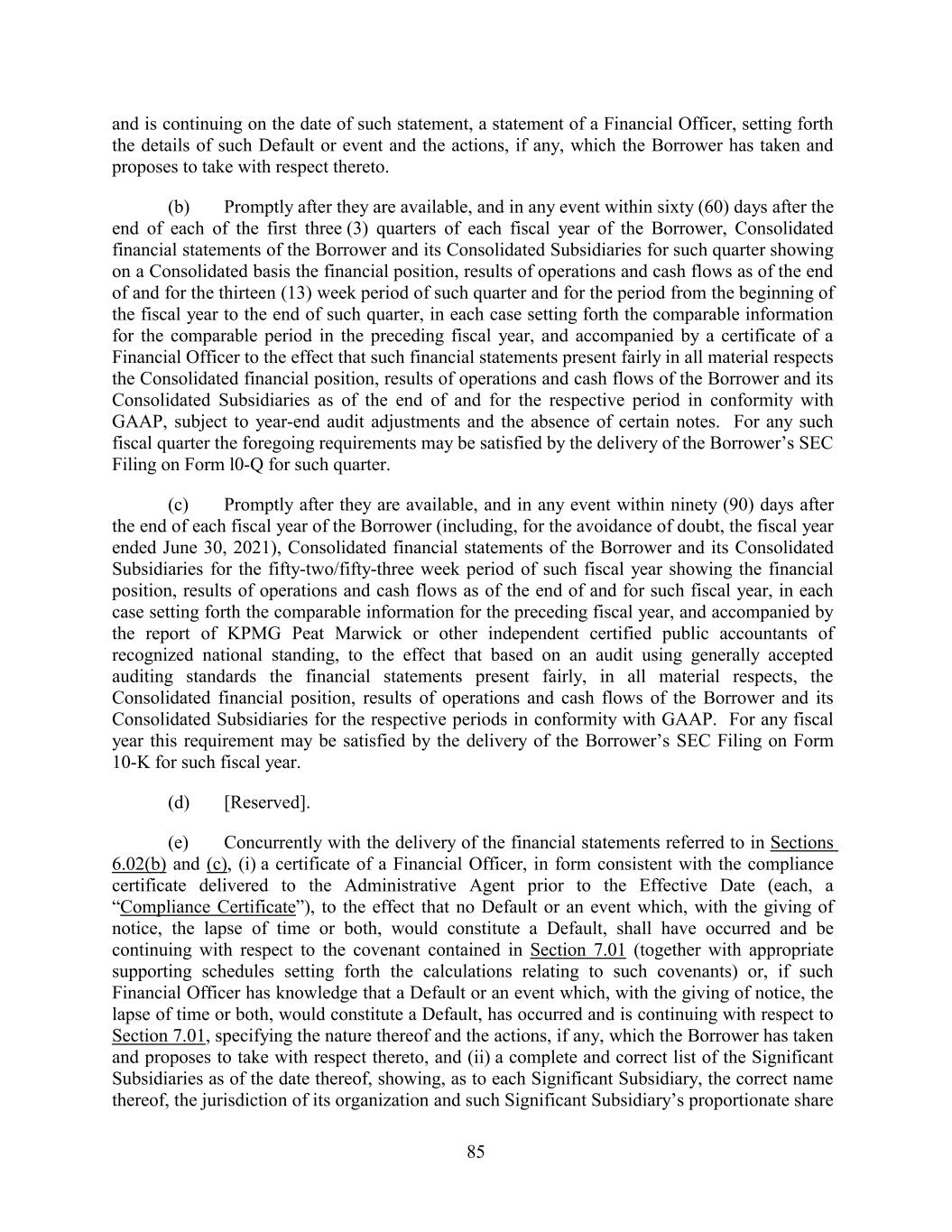 and is continuing on the date of such statement, a statement of a Financial Officer, setting forth the details of such Default or event and the actions, if any, which the Borrower has taken and proposes to take with respect thereto. (b) Promptly after they are available, and in any event within sixty (60) days after the end of each of the first three (3) quarters of each fiscal year of the Borrower, Consolidated financial statements of the Borrower and its Consolidated Subsidiaries for such quarter showing on a Consolidated basis the financial position, results of operations and cash flows as of the end of and for the thirteen (13) week period of such quarter and for the period from the beginning of the fiscal year to the end of such quarter, in each case setting forth the comparable information for the comparable period in the preceding fiscal year, and accompanied by a certificate of a Financial Officer to the effect that such financial statements present fairly in all material respects the Consolidated financial position, results of operations and cash flows of the Borrower and its Consolidated Subsidiaries as of the end of and for the respective period in conformity with GAAP, subject to year-end audit adjustments and the absence of certain notes. For any such fiscal quarter the foregoing requirements may be satisfied by the delivery of the Borrower’s SEC Filing on Form l0-Q for such quarter. (c) Promptly after they are available, and in any event within ninety (90) days after the end of each fiscal year of the Borrower (including, for the avoidance of doubt, the fiscal year ended June 30, 2021), Consolidated financial statements of the Borrower and its Consolidated Subsidiaries for the fifty-two/fifty-three week period of such fiscal year showing the financial position, results of operations and cash flows as of the end of and for such fiscal year, in each case setting forth the comparable information for the preceding fiscal year, and accompanied by the report of KPMG Peat Marwick or other independent certified public accountants of recognized national standing, to the effect that based on an audit using generally accepted auditing standards the financial statements present fairly, in all material respects, the Consolidated financial position, results of operations and cash flows of the Borrower and its Consolidated Subsidiaries for the respective periods in conformity with GAAP. For any fiscal year this requirement may be satisfied by the delivery of the Borrower’s SEC Filing on Form 10-K for such fiscal year. (d) [Reserved]. (e) Concurrently with the delivery of the financial statements referred to in Sections 6.02(b) and (c), (i) a certificate of a Financial Officer, in form consistent with the compliance certificate delivered to the Administrative Agent prior to the Effective Date (each, a “Compliance Certificate”), to the effect that no Default or an event which, with the giving of notice, the lapse of time or both, would constitute a Default, shall have occurred and be continuing with respect to the covenant contained in Section 7.01 (together with appropriate supporting schedules setting forth the calculations relating to such covenants) or, if such Financial Officer has knowledge that a Default or an event which, with the giving of notice, the lapse of time or both, would constitute a Default, has occurred and is continuing with respect to Section 7.01, specifying the nature thereof and the actions, if any, which the Borrower has taken and proposes to take with respect thereto, and (ii) a complete and correct list of the Significant Subsidiaries as of the date thereof, showing, as to each Significant Subsidiary, the correct name thereof, the jurisdiction of its organization and such Significant Subsidiary’s proportionate share 85