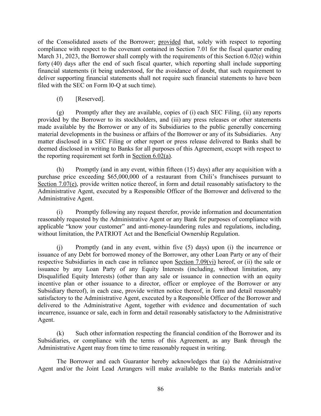 of the Consolidated assets of the Borrower; provided that, solely with respect to reporting compliance with respect to the covenant contained in Section 7.01 for the fiscal quarter ending March 31, 2023, the Borrower shall comply with the requirements of this Section 6.02(e) within forty (40) days after the end of such fiscal quarter, which reporting shall include supporting financial statements (it being understood, for the avoidance of doubt, that such requirement to deliver supporting financial statements shall not require such financial statements to have been filed with the SEC on Form l0-Q at such time). (f) [Reserved]. (g) Promptly after they are available, copies of (i) each SEC Filing, (ii) any reports provided by the Borrower to its stockholders, and (iii) any press releases or other statements made available by the Borrower or any of its Subsidiaries to the public generally concerning material developments in the business or affairs of the Borrower or any of its Subsidiaries. Any matter disclosed in a SEC Filing or other report or press release delivered to Banks shall be deemed disclosed in writing to Banks for all purposes of this Agreement, except with respect to the reporting requirement set forth in Section 6.02(a). (h) Promptly (and in any event, within fifteen (15) days) after any acquisition with a purchase price exceeding $65,000,000 of a restaurant from Chili’s franchisees pursuant to Section 7.07(e), provide written notice thereof, in form and detail reasonably satisfactory to the Administrative Agent, executed by a Responsible Officer of the Borrower and delivered to the Administrative Agent. (i) Promptly following any request therefor, provide information and documentation reasonably requested by the Administrative Agent or any Bank for purposes of compliance with applicable “know your customer” and anti-money-laundering rules and regulations, including, without limitation, the PATRIOT Act and the Beneficial Ownership Regulation. (j) Promptly (and in any event, within five (5) days) upon (i) the incurrence or issuance of any Debt for borrowed money of the Borrower, any other Loan Party or any of their respective Subsidiaries in each case in reliance upon Section 7.09(vi) hereof, or (ii) the sale or issuance by any Loan Party of any Equity Interests (including, without limitation, any Disqualified Equity Interests) (other than any sale or issuance in connection with an equity incentive plan or other issuance to a director, officer or employee of the Borrower or any Subsidiary thereof), in each case, provide written notice thereof, in form and detail reasonably satisfactory to the Administrative Agent, executed by a Responsible Officer of the Borrower and delivered to the Administrative Agent, together with evidence and documentation of such incurrence, issuance or sale, each in form and detail reasonably satisfactory to the Administrative Agent. (k) Such other information respecting the financial condition of the Borrower and its Subsidiaries, or compliance with the terms of this Agreement, as any Bank through the Administrative Agent may from time to time reasonably request in writing. The Borrower and each Guarantor hereby acknowledges that (a) the Administrative Agent and/or the Joint Lead Arrangers will make available to the Banks materials and/or 86