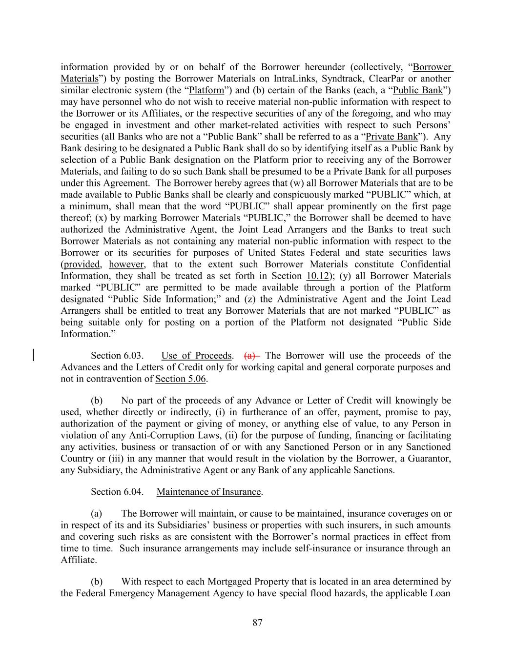 information provided by or on behalf of the Borrower hereunder (collectively, “Borrower Materials”) by posting the Borrower Materials on IntraLinks, Syndtrack, ClearPar or another similar electronic system (the “Platform”) and (b) certain of the Banks (each, a “Public Bank”) may have personnel who do not wish to receive material non-public information with respect to the Borrower or its Affiliates, or the respective securities of any of the foregoing, and who may be engaged in investment and other market-related activities with respect to such Persons’ securities (all Banks who are not a “Public Bank” shall be referred to as a “Private Bank”). Any Bank desiring to be designated a Public Bank shall do so by identifying itself as a Public Bank by selection of a Public Bank designation on the Platform prior to receiving any of the Borrower Materials, and failing to do so such Bank shall be presumed to be a Private Bank for all purposes under this Agreement. The Borrower hereby agrees that (w) all Borrower Materials that are to be made available to Public Banks shall be clearly and conspicuously marked “PUBLIC” which, at a minimum, shall mean that the word “PUBLIC” shall appear prominently on the first page thereof; (x) by marking Borrower Materials “PUBLIC,” the Borrower shall be deemed to have authorized the Administrative Agent, the Joint Lead Arrangers and the Banks to treat such Borrower Materials as not containing any material non-public information with respect to the Borrower or its securities for purposes of United States Federal and state securities laws (provided, however, that to the extent such Borrower Materials constitute Confidential Information, they shall be treated as set forth in Section 10.12); (y) all Borrower Materials marked “PUBLIC” are permitted to be made available through a portion of the Platform designated “Public Side Information;” and (z) the Administrative Agent and the Joint Lead Arrangers shall be entitled to treat any Borrower Materials that are not marked “PUBLIC” as being suitable only for posting on a portion of the Platform not designated “Public Side Information.” Section 6.03. Use of Proceeds. (a) The Borrower will use the proceeds of the Advances and the Letters of Credit only for working capital and general corporate purposes and not in contravention of Section 5.06. (b) No part of the proceeds of any Advance or Letter of Credit will knowingly be used, whether directly or indirectly, (i) in furtherance of an offer, payment, promise to pay, authorization of the payment or giving of money, or anything else of value, to any Person in violation of any Anti-Corruption Laws, (ii) for the purpose of funding, financing or facilitating any activities, business or transaction of or with any Sanctioned Person or in any Sanctioned Country or (iii) in any manner that would result in the violation by the Borrower, a Guarantor, any Subsidiary, the Administrative Agent or any Bank of any applicable Sanctions. Section 6.04. Maintenance of Insurance. (a) The Borrower will maintain, or cause to be maintained, insurance coverages on or in respect of its and its Subsidiaries’ business or properties with such insurers, in such amounts and covering such risks as are consistent with the Borrower’s normal practices in effect from time to time. Such insurance arrangements may include self-insurance or insurance through an Affiliate. (b) With respect to each Mortgaged Property that is located in an area determined by the Federal Emergency Management Agency to have special flood hazards, the applicable Loan 87