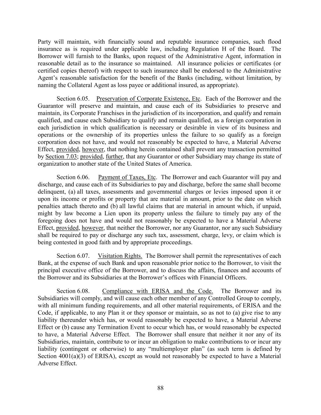 Party will maintain, with financially sound and reputable insurance companies, such flood insurance as is required under applicable law, including Regulation H of the Board. The Borrower will furnish to the Banks, upon request of the Administrative Agent, information in reasonable detail as to the insurance so maintained. All insurance policies or certificates (or certified copies thereof) with respect to such insurance shall be endorsed to the Administrative Agent’s reasonable satisfaction for the benefit of the Banks (including, without limitation, by naming the Collateral Agent as loss payee or additional insured, as appropriate). Section 6.05. Preservation of Corporate Existence, Etc. Each of the Borrower and the Guarantor will preserve and maintain, and cause each of its Subsidiaries to preserve and maintain, its Corporate Franchises in the jurisdiction of its incorporation, and qualify and remain qualified, and cause each Subsidiary to qualify and remain qualified, as a foreign corporation in each jurisdiction in which qualification is necessary or desirable in view of its business and operations or the ownership of its properties unless the failure to so qualify as a foreign corporation does not have, and would not reasonably be expected to have, a Material Adverse Effect, provided, however, that nothing herein contained shall prevent any transaction permitted by Section 7.03; provided, further, that any Guarantor or other Subsidiary may change its state of organization to another state of the United States of America. Section 6.06. Payment of Taxes, Etc. The Borrower and each Guarantor will pay and discharge, and cause each of its Subsidiaries to pay and discharge, before the same shall become delinquent, (a) all taxes, assessments and governmental charges or levies imposed upon it or upon its income or profits or property that are material in amount, prior to the date on which penalties attach thereto and (b) all lawful claims that are material in amount which, if unpaid, might by law become a Lien upon its property unless the failure to timely pay any of the foregoing does not have and would not reasonably be expected to have a Material Adverse Effect, provided, however, that neither the Borrower, nor any Guarantor, nor any such Subsidiary shall be required to pay or discharge any such tax, assessment, charge, levy, or claim which is being contested in good faith and by appropriate proceedings. Section 6.07. Visitation Rights. The Borrower shall permit the representatives of each Bank, at the expense of such Bank and upon reasonable prior notice to the Borrower, to visit the principal executive office of the Borrower, and to discuss the affairs, finances and accounts of the Borrower and its Subsidiaries at the Borrower’s offices with Financial Officers. Section 6.08. Compliance with ERISA and the Code. The Borrower and its Subsidiaries will comply, and will cause each other member of any Controlled Group to comply, with all minimum funding requirements, and all other material requirements, of ERISA and the Code, if applicable, to any Plan it or they sponsor or maintain, so as not to (a) give rise to any liability thereunder which has, or would reasonably be expected to have, a Material Adverse Effect or (b) cause any Termination Event to occur which has, or would reasonably be expected to have, a Material Adverse Effect. The Borrower shall ensure that neither it nor any of its Subsidiaries, maintain, contribute to or incur an obligation to make contributions to or incur any liability (contingent or otherwise) to any “multiemployer plan” (as such term is defined by Section 4001(a)(3) of ERISA), except as would not reasonably be expected to have a Material Adverse Effect. 88