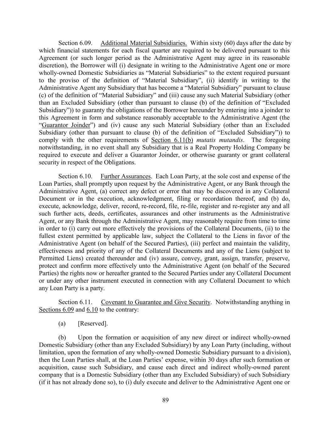 Section 6.09. Additional Material Subsidiaries. Within sixty (60) days after the date by which financial statements for each fiscal quarter are required to be delivered pursuant to this Agreement (or such longer period as the Administrative Agent may agree in its reasonable discretion), the Borrower will (i) designate in writing to the Administrative Agent one or more wholly-owned Domestic Subsidiaries as “Material Subsidiaries” to the extent required pursuant to the proviso of the definition of “Material Subsidiary”, (ii) identify in writing to the Administrative Agent any Subsidiary that has become a “Material Subsidiary” pursuant to clause (c) of the definition of “Material Subsidiary” and (iii) cause any such Material Subsidiary (other than an Excluded Subsidiary (other than pursuant to clause (b) of the definition of “Excluded Subsidiary”)) to guaranty the obligations of the Borrower hereunder by entering into a joinder to this Agreement in form and substance reasonably acceptable to the Administrative Agent (the “Guarantor Joinder”) and (iv) cause any such Material Subsidiary (other than an Excluded Subsidiary (other than pursuant to clause (b) of the definition of “Excluded Subsidiary”)) to comply with the other requirements of Section 6.11(b) mutatis mutandis. The foregoing notwithstanding, in no event shall any Subsidiary that is a Real Property Holding Company be required to execute and deliver a Guarantor Joinder, or otherwise guaranty or grant collateral security in respect of the Obligations. Section 6.10. Further Assurances. Each Loan Party, at the sole cost and expense of the Loan Parties, shall promptly upon request by the Administrative Agent, or any Bank through the Administrative Agent, (a) correct any defect or error that may be discovered in any Collateral Document or in the execution, acknowledgment, filing or recordation thereof, and (b) do, execute, acknowledge, deliver, record, re-record, file, re-file, register and re-register any and all such further acts, deeds, certificates, assurances and other instruments as the Administrative Agent, or any Bank through the Administrative Agent, may reasonably require from time to time in order to (i) carry out more effectively the provisions of the Collateral Documents, (ii) to the fullest extent permitted by applicable law, subject the Collateral to the Liens in favor of the Administrative Agent (on behalf of the Secured Parties), (iii) perfect and maintain the validity, effectiveness and priority of any of the Collateral Documents and any of the Liens (subject to Permitted Liens) created thereunder and (iv) assure, convey, grant, assign, transfer, preserve, protect and confirm more effectively unto the Administrative Agent (on behalf of the Secured Parties) the rights now or hereafter granted to the Secured Parties under any Collateral Document or under any other instrument executed in connection with any Collateral Document to which any Loan Party is a party. Section 6.11. Covenant to Guarantee and Give Security. Notwithstanding anything in Sections 6.09 and 6.10 to the contrary: (a) [Reserved]. (b) Upon the formation or acquisition of any new direct or indirect wholly-owned Domestic Subsidiary (other than any Excluded Subsidiary) by any Loan Party (including, without limitation, upon the formation of any wholly-owned Domestic Subsidiary pursuant to a division), then the Loan Parties shall, at the Loan Parties’ expense, within 30 days after such formation or acquisition, cause such Subsidiary, and cause each direct and indirect wholly-owned parent company that is a Domestic Subsidiary (other than any Excluded Subsidiary) of such Subsidiary (if it has not already done so), to (i) duly execute and deliver to the Administrative Agent one or 89