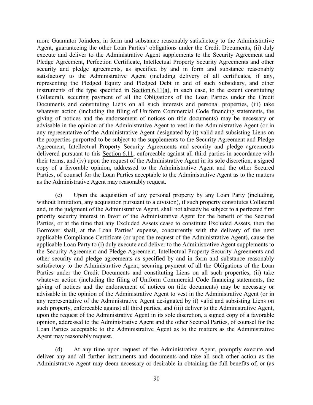 more Guarantor Joinders, in form and substance reasonably satisfactory to the Administrative Agent, guaranteeing the other Loan Parties’ obligations under the Credit Documents, (ii) duly execute and deliver to the Administrative Agent supplements to the Security Agreement and Pledge Agreement, Perfection Certificate, Intellectual Property Security Agreements and other security and pledge agreements, as specified by and in form and substance reasonably satisfactory to the Administrative Agent (including delivery of all certificates, if any, representing the Pledged Equity and Pledged Debt in and of such Subsidiary, and other instruments of the type specified in Section 6.11(a), in each case, to the extent constituting Collateral), securing payment of all the Obligations of the Loan Parties under the Credit Documents and constituting Liens on all such interests and personal properties, (iii) take whatever action (including the filing of Uniform Commercial Code financing statements, the giving of notices and the endorsement of notices on title documents) may be necessary or advisable in the opinion of the Administrative Agent to vest in the Administrative Agent (or in any representative of the Administrative Agent designated by it) valid and subsisting Liens on the properties purported to be subject to the supplements to the Security Agreement and Pledge Agreement, Intellectual Property Security Agreements and security and pledge agreements delivered pursuant to this Section 6.11, enforceable against all third parties in accordance with their terms, and (iv) upon the request of the Administrative Agent in its sole discretion, a signed copy of a favorable opinion, addressed to the Administrative Agent and the other Secured Parties, of counsel for the Loan Parties acceptable to the Administrative Agent as to the matters as the Administrative Agent may reasonably request. (c) Upon the acquisition of any personal property by any Loan Party (including, without limitation, any acquisition pursuant to a division), if such property constitutes Collateral and, in the judgment of the Administrative Agent, shall not already be subject to a perfected first priority security interest in favor of the Administrative Agent for the benefit of the Secured Parties, or at the time that any Excluded Assets cease to constitute Excluded Assets, then the Borrower shall, at the Loan Parties’ expense, concurrently with the delivery of the next applicable Compliance Certificate (or upon the request of the Administrative Agent), cause the applicable Loan Party to (i) duly execute and deliver to the Administrative Agent supplements to the Security Agreement and Pledge Agreement, Intellectual Property Security Agreements and other security and pledge agreements as specified by and in form and substance reasonably satisfactory to the Administrative Agent, securing payment of all the Obligations of the Loan Parties under the Credit Documents and constituting Liens on all such properties, (ii) take whatever action (including the filing of Uniform Commercial Code financing statements, the giving of notices and the endorsement of notices on title documents) may be necessary or advisable in the opinion of the Administrative Agent to vest in the Administrative Agent (or in any representative of the Administrative Agent designated by it) valid and subsisting Liens on such property, enforceable against all third parties, and (iii) deliver to the Administrative Agent, upon the request of the Administrative Agent in its sole discretion, a signed copy of a favorable opinion, addressed to the Administrative Agent and the other Secured Parties, of counsel for the Loan Parties acceptable to the Administrative Agent as to the matters as the Administrative Agent may reasonably request. (d) At any time upon request of the Administrative Agent, promptly execute and deliver any and all further instruments and documents and take all such other action as the Administrative Agent may deem necessary or desirable in obtaining the full benefits of, or (as 90
