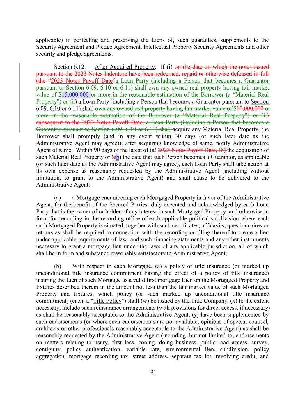 applicable) in perfecting and preserving the Liens of, such guaranties, supplements to the Security Agreement and Pledge Agreement, Intellectual Property Security Agreements and other security and pledge agreements. Section 6.12. After Acquired Property. If (i) on the date on which the notes issued pursuant to the 2023 Notes Indenture have been redeemed, repaid or otherwise defeased in full (the “2023 Notes Payoff Date”a Loan Party (including a Person that becomes a Guarantor pursuant to Section 6.09, 6.10 or 6.11) shall own any owned real property having fair market value of $15,000,000 or more in the reasonable estimation of the Borrower (a “Material Real Property”) or (ii) a Loan Party (including a Person that becomes a Guarantor pursuant to Section 6.09, 6.10 or 6.11) shall own any owned real property having fair market value of $10,000,000 or more in the reasonable estimation of the Borrower (a “Material Real Property”) or (ii) subsequent to the 2023 Notes Payoff Date, a Loan Party (including a Person that becomes a Guarantor pursuant to Section 6.09, 6.10 or 6.11) shall acquire any Material Real Property, the Borrower shall promptly (and in any event within 30 days (or such later date as the Administrative Agent may agree)), after acquiring knowledge of same, notify Administrative Agent of same. Within 90 days of the latest of (a) 2023 Notes Payoff Date, (b) the acquisition of such Material Real Property or (cb) the date that such Person becomes a Guarantor, as applicable (or such later date as the Administrative Agent may agree), each Loan Party shall take action at its own expense as reasonably requested by the Administrative Agent (including without limitation, to grant to the Administrative Agent) and shall cause to be delivered to the Administrative Agent: (a) a Mortgage encumbering each Mortgaged Property in favor of the Administrative Agent, for the benefit of the Secured Parties, duly executed and acknowledged by each Loan Party that is the owner of or holder of any interest in such Mortgaged Property, and otherwise in form for recording in the recording office of each applicable political subdivision where each such Mortgaged Property is situated, together with such certificates, affidavits, questionnaires or returns as shall be required in connection with the recording or filing thereof to create a lien under applicable requirements of law, and such financing statements and any other instruments necessary to grant a mortgage lien under the laws of any applicable jurisdiction, all of which shall be in form and substance reasonably satisfactory to Administrative Agent; (b) With respect to each Mortgage, (a) a policy of title insurance (or marked up unconditional title insurance commitment having the effect of a policy of title insurance) insuring the Lien of such Mortgage as a valid first mortgage Lien on the Mortgaged Property and fixtures described therein in the amount not less than the fair market value of such Mortgaged Property and fixtures, which policy (or such marked up unconditional title insurance commitment) (each, a “Title Policy”) shall (w) be issued by the Title Company, (x) to the extent necessary, include such reinsurance arrangements (with provisions for direct access, if necessary) as shall be reasonably acceptable to the Administrative Agent, (y) have been supplemented by such endorsements (or where such endorsements are not available, opinions of special counsel, architects or other professionals reasonably acceptable to the Administrative Agent) as shall be reasonably requested by the Administrative Agent (including, but not limited to, endorsements on matters relating to usury, first loss, zoning, doing business, public road access, survey, contiguity, policy authentication, variable rate, environmental lien, subdivision, policy aggregation, mortgage recording tax, street address, separate tax lot, revolving credit, and 91