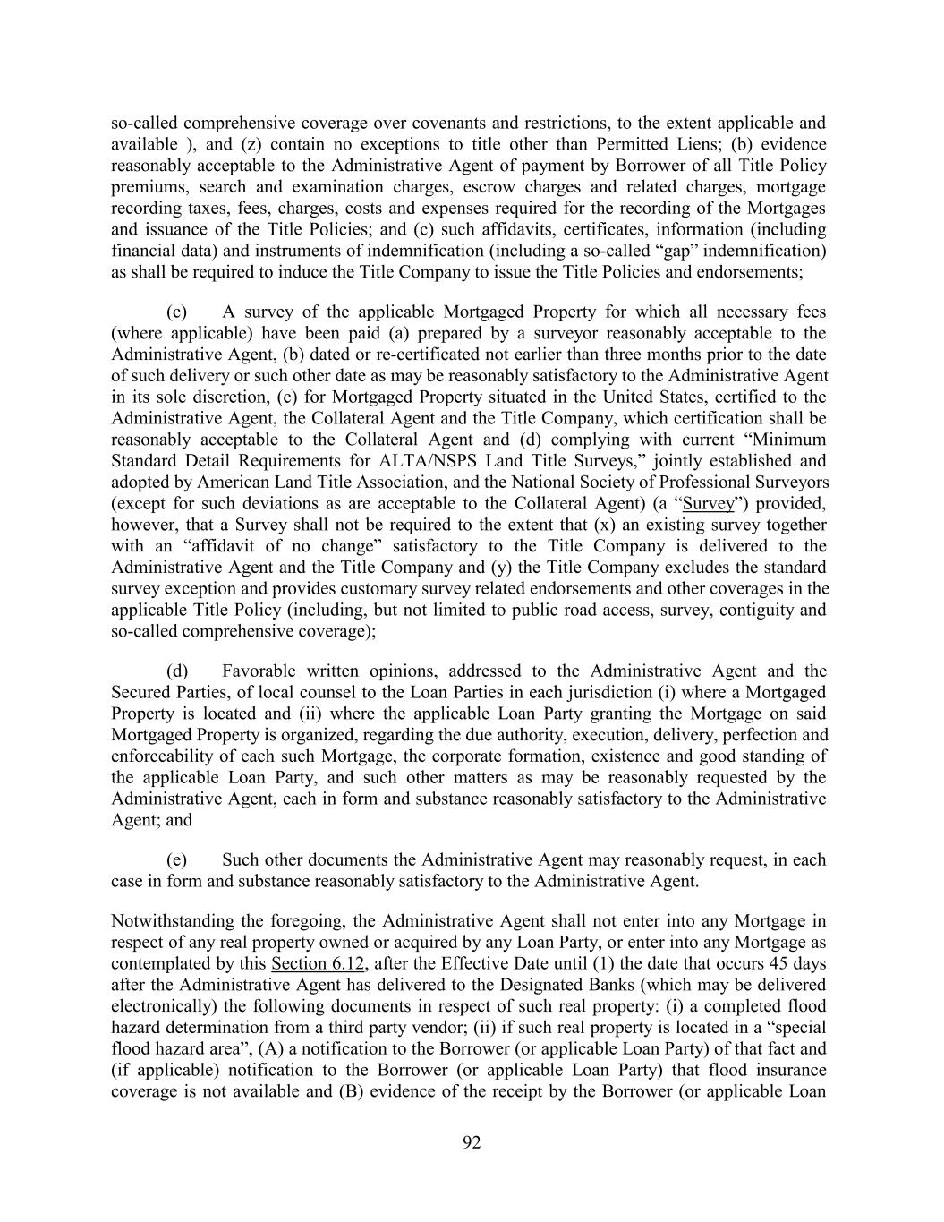 so-called comprehensive coverage over covenants and restrictions, to the extent applicable and available ), and (z) contain no exceptions to title other than Permitted Liens; (b) evidence reasonably acceptable to the Administrative Agent of payment by Borrower of all Title Policy premiums, search and examination charges, escrow charges and related charges, mortgage recording taxes, fees, charges, costs and expenses required for the recording of the Mortgages and issuance of the Title Policies; and (c) such affidavits, certificates, information (including financial data) and instruments of indemnification (including a so-called “gap” indemnification) as shall be required to induce the Title Company to issue the Title Policies and endorsements; (c) A survey of the applicable Mortgaged Property for which all necessary fees (where applicable) have been paid (a) prepared by a surveyor reasonably acceptable to the Administrative Agent, (b) dated or re-certificated not earlier than three months prior to the date of such delivery or such other date as may be reasonably satisfactory to the Administrative Agent in its sole discretion, (c) for Mortgaged Property situated in the United States, certified to the Administrative Agent, the Collateral Agent and the Title Company, which certification shall be reasonably acceptable to the Collateral Agent and (d) complying with current “Minimum Standard Detail Requirements for ALTA/NSPS Land Title Surveys,” jointly established and adopted by American Land Title Association, and the National Society of Professional Surveyors (except for such deviations as are acceptable to the Collateral Agent) (a “Survey”) provided, however, that a Survey shall not be required to the extent that (x) an existing survey together with an “affidavit of no change” satisfactory to the Title Company is delivered to the Administrative Agent and the Title Company and (y) the Title Company excludes the standard survey exception and provides customary survey related endorsements and other coverages in the applicable Title Policy (including, but not limited to public road access, survey, contiguity and so-called comprehensive coverage); (d) Favorable written opinions, addressed to the Administrative Agent and the Secured Parties, of local counsel to the Loan Parties in each jurisdiction (i) where a Mortgaged Property is located and (ii) where the applicable Loan Party granting the Mortgage on said Mortgaged Property is organized, regarding the due authority, execution, delivery, perfection and enforceability of each such Mortgage, the corporate formation, existence and good standing of the applicable Loan Party, and such other matters as may be reasonably requested by the Administrative Agent, each in form and substance reasonably satisfactory to the Administrative Agent; and (e) Such other documents the Administrative Agent may reasonably request, in each case in form and substance reasonably satisfactory to the Administrative Agent. Notwithstanding the foregoing, the Administrative Agent shall not enter into any Mortgage in respect of any real property owned or acquired by any Loan Party, or enter into any Mortgage as contemplated by this Section 6.12, after the Effective Date until (1) the date that occurs 45 days after the Administrative Agent has delivered to the Designated Banks (which may be delivered electronically) the following documents in respect of such real property: (i) a completed flood hazard determination from a third party vendor; (ii) if such real property is located in a “special flood hazard area”, (A) a notification to the Borrower (or applicable Loan Party) of that fact and (if applicable) notification to the Borrower (or applicable Loan Party) that flood insurance coverage is not available and (B) evidence of the receipt by the Borrower (or applicable Loan 92