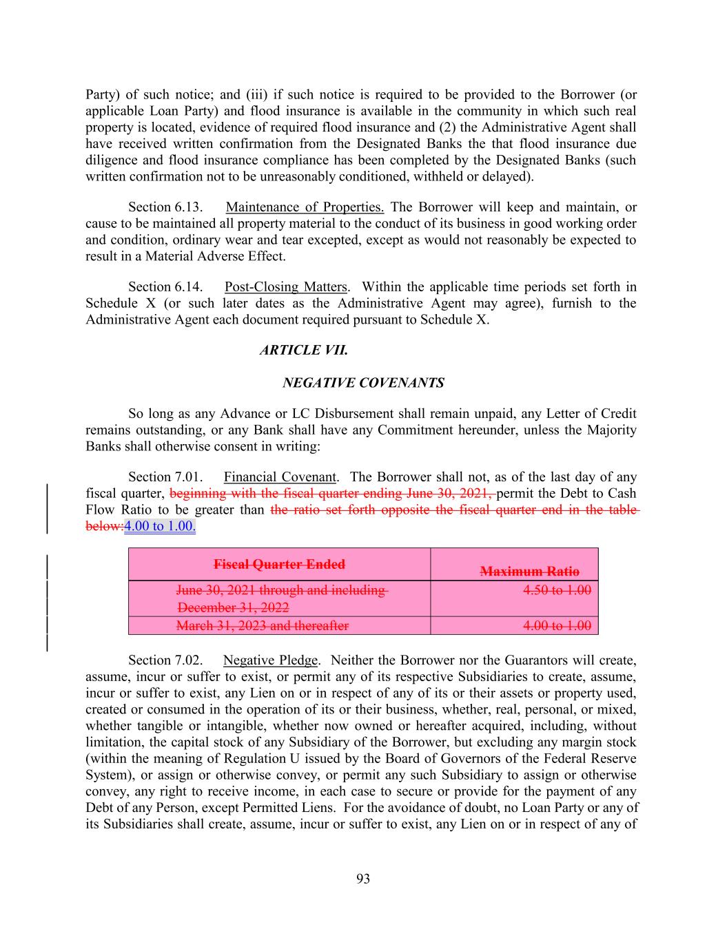 93 June 30, 2021 through and including December 31, 2022 4.50 to 1.00 Fiscal Quarter Ended March 31, 2023 and thereafter Maximum Ratio 4.00 to 1.00 Party) of such notice; and (iii) if such notice is required to be provided to the Borrower (or applicable Loan Party) and flood insurance is available in the community in which such real property is located, evidence of required flood insurance and (2) the Administrative Agent shall have received written confirmation from the Designated Banks the that flood insurance due diligence and flood insurance compliance has been completed by the Designated Banks (such written confirmation not to be unreasonably conditioned, withheld or delayed). Section 6.13. Maintenance of Properties. The Borrower will keep and maintain, or cause to be maintained all property material to the conduct of its business in good working order and condition, ordinary wear and tear excepted, except as would not reasonably be expected to result in a Material Adverse Effect. Section 6.14. Post-Closing Matters. Within the applicable time periods set forth in Schedule X (or such later dates as the Administrative Agent may agree), furnish to the Administrative Agent each document required pursuant to Schedule X. ARTICLE VII. NEGATIVE COVENANTS So long as any Advance or LC Disbursement shall remain unpaid, any Letter of Credit remains outstanding, or any Bank shall have any Commitment hereunder, unless the Majority Banks shall otherwise consent in writing: Section 7.01. Financial Covenant. The Borrower shall not, as of the last day of any fiscal quarter, beginning with the fiscal quarter ending June 30, 2021, permit the Debt to Cash Flow Ratio to be greater than the ratio set forth opposite the fiscal quarter end in the table below:4.00 to 1.00. Section 7.02. Negative Pledge. Neither the Borrower nor the Guarantors will create, assume, incur or suffer to exist, or permit any of its respective Subsidiaries to create, assume, incur or suffer to exist, any Lien on or in respect of any of its or their assets or property used, created or consumed in the operation of its or their business, whether, real, personal, or mixed, whether tangible or intangible, whether now owned or hereafter acquired, including, without limitation, the capital stock of any Subsidiary of the Borrower, but excluding any margin stock (within the meaning of Regulation U issued by the Board of Governors of the Federal Reserve System), or assign or otherwise convey, or permit any such Subsidiary to assign or otherwise convey, any right to receive income, in each case to secure or provide for the payment of any Debt of any Person, except Permitted Liens. For the avoidance of doubt, no Loan Party or any of its Subsidiaries shall create, assume, incur or suffer to exist, any Lien on or in respect of any of
