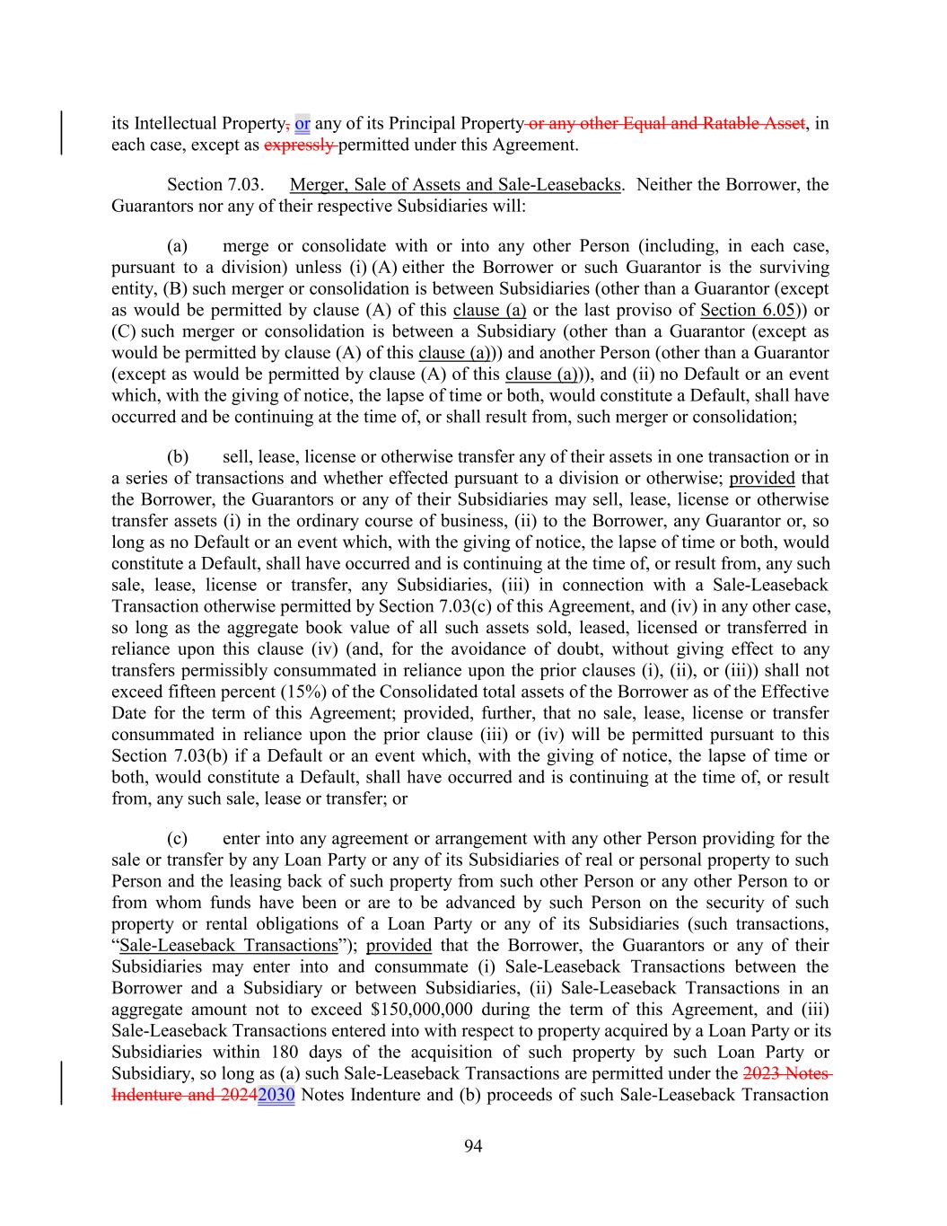 its Intellectual Property, or any of its Principal Property or any other Equal and Ratable Asset, in each case, except as expressly permitted under this Agreement. Section 7.03. Merger, Sale of Assets and Sale-Leasebacks. Neither the Borrower, the Guarantors nor any of their respective Subsidiaries will: (a) merge or consolidate with or into any other Person (including, in each case, pursuant to a division) unless (i) (A) either the Borrower or such Guarantor is the surviving entity, (B) such merger or consolidation is between Subsidiaries (other than a Guarantor (except as would be permitted by clause (A) of this clause (a) or the last proviso of Section 6.05)) or (C) such merger or consolidation is between a Subsidiary (other than a Guarantor (except as would be permitted by clause (A) of this clause (a))) and another Person (other than a Guarantor (except as would be permitted by clause (A) of this clause (a))), and (ii) no Default or an event which, with the giving of notice, the lapse of time or both, would constitute a Default, shall have occurred and be continuing at the time of, or shall result from, such merger or consolidation; (b) sell, lease, license or otherwise transfer any of their assets in one transaction or in a series of transactions and whether effected pursuant to a division or otherwise; provided that the Borrower, the Guarantors or any of their Subsidiaries may sell, lease, license or otherwise transfer assets (i) in the ordinary course of business, (ii) to the Borrower, any Guarantor or, so long as no Default or an event which, with the giving of notice, the lapse of time or both, would constitute a Default, shall have occurred and is continuing at the time of, or result from, any such sale, lease, license or transfer, any Subsidiaries, (iii) in connection with a Sale-Leaseback Transaction otherwise permitted by Section 7.03(c) of this Agreement, and (iv) in any other case, so long as the aggregate book value of all such assets sold, leased, licensed or transferred in reliance upon this clause (iv) (and, for the avoidance of doubt, without giving effect to any transfers permissibly consummated in reliance upon the prior clauses (i), (ii), or (iii)) shall not exceed fifteen percent (15%) of the Consolidated total assets of the Borrower as of the Effective Date for the term of this Agreement; provided, further, that no sale, lease, license or transfer consummated in reliance upon the prior clause (iii) or (iv) will be permitted pursuant to this Section 7.03(b) if a Default or an event which, with the giving of notice, the lapse of time or both, would constitute a Default, shall have occurred and is continuing at the time of, or result from, any such sale, lease or transfer; or (c) enter into any agreement or arrangement with any other Person providing for the sale or transfer by any Loan Party or any of its Subsidiaries of real or personal property to such Person and the leasing back of such property from such other Person or any other Person to or from whom funds have been or are to be advanced by such Person on the security of such property or rental obligations of a Loan Party or any of its Subsidiaries (such transactions, “Sale-Leaseback Transactions”); provided that the Borrower, the Guarantors or any of their Subsidiaries may enter into and consummate (i) Sale-Leaseback Transactions between the Borrower and a Subsidiary or between Subsidiaries, (ii) Sale-Leaseback Transactions in an aggregate amount not to exceed $150,000,000 during the term of this Agreement, and (iii) Sale-Leaseback Transactions entered into with respect to property acquired by a Loan Party or its Subsidiaries within 180 days of the acquisition of such property by such Loan Party or Subsidiary, so long as (a) such Sale-Leaseback Transactions are permitted under the 2023 Notes Indenture and 20242030 Notes Indenture and (b) proceeds of such Sale-Leaseback Transaction 94
