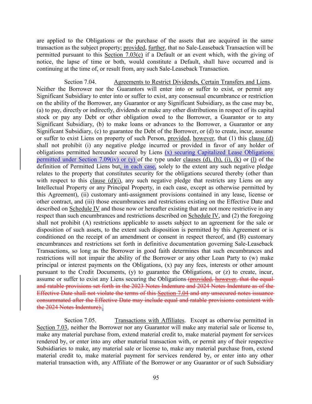 are applied to the Obligations or the purchase of the assets that are acquired in the same transaction as the subject property; provided, further, that no Sale-Leaseback Transaction will be permitted pursuant to this Section 7.03(c) if a Default or an event which, with the giving of notice, the lapse of time or both, would constitute a Default, shall have occurred and is continuing at the time of, or result from, any such Sale-Leaseback Transaction. Section 7.04. Agreements to Restrict Dividends, Certain Transfers and Liens. Neither the Borrower nor the Guarantors will enter into or suffer to exist, or permit any Significant Subsidiary to enter into or suffer to exist, any consensual encumbrance or restriction on the ability of the Borrower, any Guarantor or any Significant Subsidiary, as the case may be, (a) to pay, directly or indirectly, dividends or make any other distributions in respect of its capital stock or pay any Debt or other obligation owed to the Borrower, a Guarantor or to any Significant Subsidiary, (b) to make loans or advances to the Borrower, a Guarantor or any Significant Subsidiary, (c) to guarantee the Debt of the Borrower, or (d) to create, incur, assume or suffer to exist Liens on property of such Person, provided, however, that (1) this clause (d) shall not prohibit (i) any negative pledge incurred or provided in favor of any holder of obligations permitted hereunder secured by Liens (x) securing Capitalized Lease Obligations permitted under Section 7.09(iv) or (y) of the type under clauses (d), (h), (i), (k) or (l) of the definition of Permitted Liens but, in each case, solely to the extent any such negative pledge relates to the property that constitutes security for the obligations secured thereby (other than with respect to this clause (d)(i), any such negative pledge that restricts any Liens on any Intellectual Property or any Principal Property, in each case, except as otherwise permitted by this Agreement), (ii) customary anti-assignment provisions contained in any lease, license or other contract, and (iii) those encumbrances and restrictions existing on the Effective Date and described on Schedule IV and those now or hereafter existing that are not more restrictive in any respect than such encumbrances and restrictions described on Schedule IV, and (2) the foregoing shall not prohibit (A) restrictions applicable to assets subject to an agreement for the sale or disposition of such assets, to the extent such disposition is permitted by this Agreement or is conditioned on the receipt of an amendment or consent in respect thereof, and (B) customary encumbrances and restrictions set forth in definitive documentation governing Sale-Leaseback Transactions, so long as the Borrower in good faith determines that such encumbrances and restrictions will not impair the ability of the Borrower or any other Loan Party to (w) make principal or interest payments on the Obligations, (x) pay any fees, interests or other amount pursuant to the Credit Documents, (y) to guarantee the Obligations, or (z) to create, incur, assume or suffer to exist any Liens securing the Obligations (provided, however, that the equal and ratable provisions set forth in the 2023 Notes Indenture and 2024 Notes Indenture as of the Effective Date shall not violate the terms of this Section 7.04 and any unsecured notes issuance consummated after the Effective Date may include equal and ratable provisions consistent with the 2024 Notes Indenture).. Section 7.05. Transactions with Affiliates. Except as otherwise permitted in Section 7.03, neither the Borrower nor any Guarantor will make any material sale or license to, make any material purchase from, extend material credit to, make material payment for services rendered by, or enter into any other material transaction with, or permit any of their respective Subsidiaries to make, any material sale or license to, make any material purchase from, extend material credit to, make material payment for services rendered by, or enter into any other material transaction with, any Affiliate of the Borrower or any Guarantor or of such Subsidiary 95