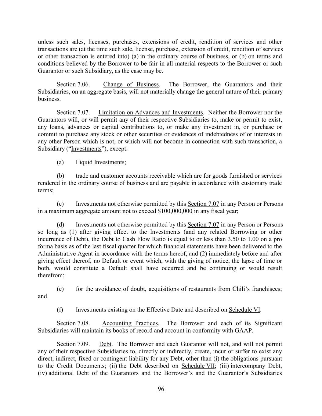 unless such sales, licenses, purchases, extensions of credit, rendition of services and other transactions are (at the time such sale, license, purchase, extension of credit, rendition of services or other transaction is entered into) (a) in the ordinary course of business, or (b) on terms and conditions believed by the Borrower to be fair in all material respects to the Borrower or such Guarantor or such Subsidiary, as the case may be. Section 7.06. Change of Business. The Borrower, the Guarantors and their Subsidiaries, on an aggregate basis, will not materially change the general nature of their primary business. Section 7.07. Limitation on Advances and Investments. Neither the Borrower nor the Guarantors will, or will permit any of their respective Subsidiaries to, make or permit to exist, any loans, advances or capital contributions to, or make any investment in, or purchase or commit to purchase any stock or other securities or evidences of indebtedness of or interests in any other Person which is not, or which will not become in connection with such transaction, a Subsidiary (“Investments”), except: (a) Liquid Investments; (b) trade and customer accounts receivable which are for goods furnished or services rendered in the ordinary course of business and are payable in accordance with customary trade terms; (c) Investments not otherwise permitted by this Section 7.07 in any Person or Persons in a maximum aggregate amount not to exceed $100,000,000 in any fiscal year; (d) Investments not otherwise permitted by this Section 7.07 in any Person or Persons so long as (1) after giving effect to the Investments (and any related Borrowing or other incurrence of Debt), the Debt to Cash Flow Ratio is equal to or less than 3.50 to 1.00 on a pro forma basis as of the last fiscal quarter for which financial statements have been delivered to the Administrative Agent in accordance with the terms hereof, and (2) immediately before and after giving effect thereof, no Default or event which, with the giving of notice, the lapse of time or both, would constitute a Default shall have occurred and be continuing or would result therefrom; (e) for the avoidance of doubt, acquisitions of restaurants from Chili’s franchisees; and (f) Investments existing on the Effective Date and described on Schedule VI. Section 7.08. Accounting Practices. The Borrower and each of its Significant Subsidiaries will maintain its books of record and account in conformity with GAAP. Section 7.09. Debt. The Borrower and each Guarantor will not, and will not permit any of their respective Subsidiaries to, directly or indirectly, create, incur or suffer to exist any direct, indirect, fixed or contingent liability for any Debt, other than (i) the obligations pursuant to the Credit Documents; (ii) the Debt described on Schedule VII; (iii) intercompany Debt, (iv) additional Debt of the Guarantors and the Borrower’s and the Guarantor’s Subsidiaries 96