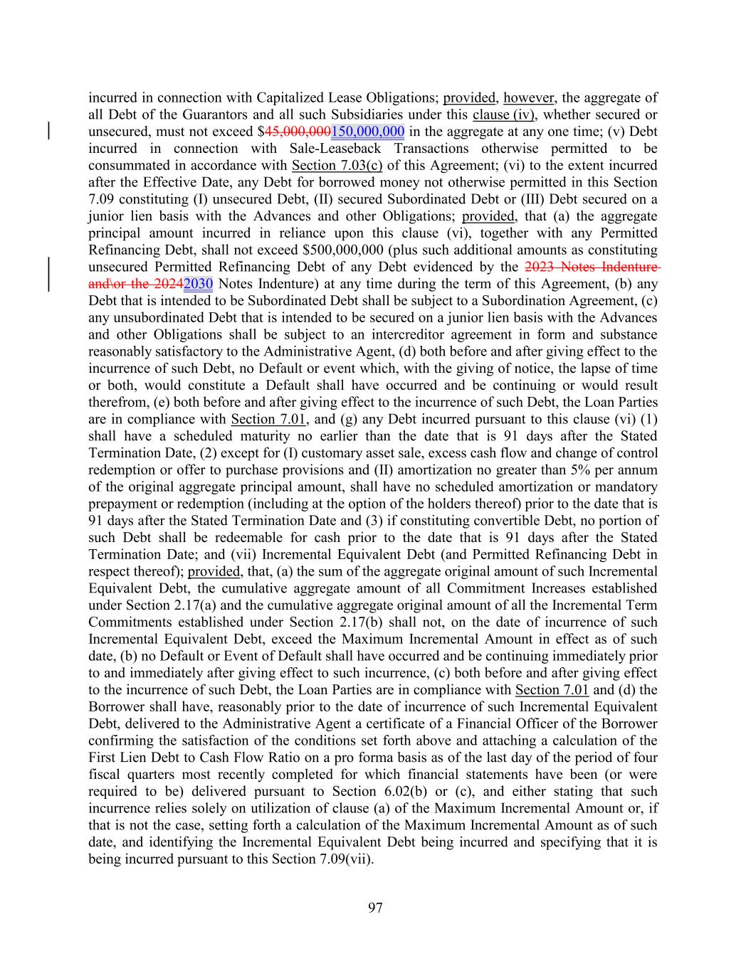incurred in connection with Capitalized Lease Obligations; provided, however, the aggregate of all Debt of the Guarantors and all such Subsidiaries under this clause (iv), whether secured or unsecured, must not exceed $45,000,000150,000,000 in the aggregate at any one time; (v) Debt incurred in connection with Sale-Leaseback Transactions otherwise permitted to be consummated in accordance with Section 7.03(c) of this Agreement; (vi) to the extent incurred after the Effective Date, any Debt for borrowed money not otherwise permitted in this Section 7.09 constituting (I) unsecured Debt, (II) secured Subordinated Debt or (III) Debt secured on a junior lien basis with the Advances and other Obligations; provided, that (a) the aggregate principal amount incurred in reliance upon this clause (vi), together with any Permitted Refinancing Debt, shall not exceed $500,000,000 (plus such additional amounts as constituting unsecured Permitted Refinancing Debt of any Debt evidenced by the 2023 Notes Indenture and\or the 20242030 Notes Indenture) at any time during the term of this Agreement, (b) any Debt that is intended to be Subordinated Debt shall be subject to a Subordination Agreement, (c) any unsubordinated Debt that is intended to be secured on a junior lien basis with the Advances and other Obligations shall be subject to an intercreditor agreement in form and substance reasonably satisfactory to the Administrative Agent, (d) both before and after giving effect to the incurrence of such Debt, no Default or event which, with the giving of notice, the lapse of time or both, would constitute a Default shall have occurred and be continuing or would result therefrom, (e) both before and after giving effect to the incurrence of such Debt, the Loan Parties are in compliance with Section 7.01, and (g) any Debt incurred pursuant to this clause (vi) (1) shall have a scheduled maturity no earlier than the date that is 91 days after the Stated Termination Date, (2) except for (I) customary asset sale, excess cash flow and change of control redemption or offer to purchase provisions and (II) amortization no greater than 5% per annum of the original aggregate principal amount, shall have no scheduled amortization or mandatory prepayment or redemption (including at the option of the holders thereof) prior to the date that is 91 days after the Stated Termination Date and (3) if constituting convertible Debt, no portion of such Debt shall be redeemable for cash prior to the date that is 91 days after the Stated Termination Date; and (vii) Incremental Equivalent Debt (and Permitted Refinancing Debt in respect thereof); provided, that, (a) the sum of the aggregate original amount of such Incremental Equivalent Debt, the cumulative aggregate amount of all Commitment Increases established under Section 2.17(a) and the cumulative aggregate original amount of all the Incremental Term Commitments established under Section 2.17(b) shall not, on the date of incurrence of such Incremental Equivalent Debt, exceed the Maximum Incremental Amount in effect as of such date, (b) no Default or Event of Default shall have occurred and be continuing immediately prior to and immediately after giving effect to such incurrence, (c) both before and after giving effect to the incurrence of such Debt, the Loan Parties are in compliance with Section 7.01 and (d) the Borrower shall have, reasonably prior to the date of incurrence of such Incremental Equivalent Debt, delivered to the Administrative Agent a certificate of a Financial Officer of the Borrower confirming the satisfaction of the conditions set forth above and attaching a calculation of the First Lien Debt to Cash Flow Ratio on a pro forma basis as of the last day of the period of four fiscal quarters most recently completed for which financial statements have been (or were required to be) delivered pursuant to Section 6.02(b) or (c), and either stating that such incurrence relies solely on utilization of clause (a) of the Maximum Incremental Amount or, if that is not the case, setting forth a calculation of the Maximum Incremental Amount as of such date, and identifying the Incremental Equivalent Debt being incurred and specifying that it is being incurred pursuant to this Section 7.09(vii). 97