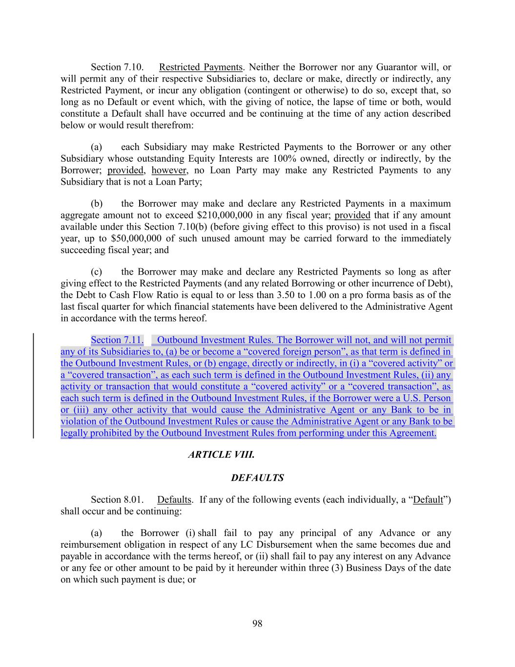 Section 7.10. Restricted Payments. Neither the Borrower nor any Guarantor will, or will permit any of their respective Subsidiaries to, declare or make, directly or indirectly, any Restricted Payment, or incur any obligation (contingent or otherwise) to do so, except that, so long as no Default or event which, with the giving of notice, the lapse of time or both, would constitute a Default shall have occurred and be continuing at the time of any action described below or would result therefrom: (a) each Subsidiary may make Restricted Payments to the Borrower or any other Subsidiary whose outstanding Equity Interests are 100% owned, directly or indirectly, by the Borrower; provided, however, no Loan Party may make any Restricted Payments to any Subsidiary that is not a Loan Party; (b) the Borrower may make and declare any Restricted Payments in a maximum aggregate amount not to exceed $210,000,000 in any fiscal year; provided that if any amount available under this Section 7.10(b) (before giving effect to this proviso) is not used in a fiscal year, up to $50,000,000 of such unused amount may be carried forward to the immediately succeeding fiscal year; and (c) the Borrower may make and declare any Restricted Payments so long as after giving effect to the Restricted Payments (and any related Borrowing or other incurrence of Debt), the Debt to Cash Flow Ratio is equal to or less than 3.50 to 1.00 on a pro forma basis as of the last fiscal quarter for which financial statements have been delivered to the Administrative Agent in accordance with the terms hereof. Section 7.11. Outbound Investment Rules. The Borrower will not, and will not permit any of its Subsidiaries to, (a) be or become a “covered foreign person”, as that term is defined in the Outbound Investment Rules, or (b) engage, directly or indirectly, in (i) a “covered activity” or a “covered transaction”, as each such term is defined in the Outbound Investment Rules, (ii) any activity or transaction that would constitute a “covered activity” or a “covered transaction”, as each such term is defined in the Outbound Investment Rules, if the Borrower were a U.S. Person or (iii) any other activity that would cause the Administrative Agent or any Bank to be in violation of the Outbound Investment Rules or cause the Administrative Agent or any Bank to be legally prohibited by the Outbound Investment Rules from performing under this Agreement. ARTICLE VIII. DEFAULTS Section 8.01. Defaults. If any of the following events (each individually, a “Default”) shall occur and be continuing: (a) the Borrower (i) shall fail to pay any principal of any Advance or any reimbursement obligation in respect of any LC Disbursement when the same becomes due and payable in accordance with the terms hereof, or (ii) shall fail to pay any interest on any Advance or any fee or other amount to be paid by it hereunder within three (3) Business Days of the date on which such payment is due; or 98