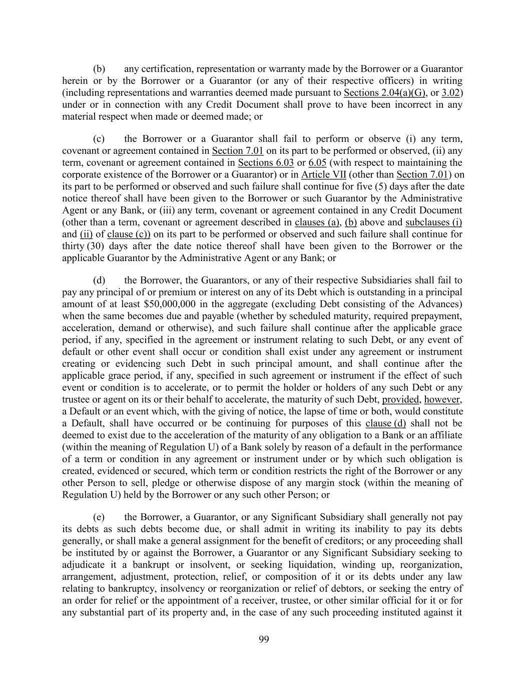 (b) any certification, representation or warranty made by the Borrower or a Guarantor herein or by the Borrower or a Guarantor (or any of their respective officers) in writing (including representations and warranties deemed made pursuant to Sections 2.04(a)(G), or 3.02) under or in connection with any Credit Document shall prove to have been incorrect in any material respect when made or deemed made; or (c) the Borrower or a Guarantor shall fail to perform or observe (i) any term, covenant or agreement contained in Section 7.01 on its part to be performed or observed, (ii) any term, covenant or agreement contained in Sections 6.03 or 6.05 (with respect to maintaining the corporate existence of the Borrower or a Guarantor) or in Article VII (other than Section 7.01) on its part to be performed or observed and such failure shall continue for five (5) days after the date notice thereof shall have been given to the Borrower or such Guarantor by the Administrative Agent or any Bank, or (iii) any term, covenant or agreement contained in any Credit Document (other than a term, covenant or agreement described in clauses (a), (b) above and subclauses (i) and (ii) of clause (c)) on its part to be performed or observed and such failure shall continue for thirty (30) days after the date notice thereof shall have been given to the Borrower or the applicable Guarantor by the Administrative Agent or any Bank; or (d) the Borrower, the Guarantors, or any of their respective Subsidiaries shall fail to pay any principal of or premium or interest on any of its Debt which is outstanding in a principal amount of at least $50,000,000 in the aggregate (excluding Debt consisting of the Advances) when the same becomes due and payable (whether by scheduled maturity, required prepayment, acceleration, demand or otherwise), and such failure shall continue after the applicable grace period, if any, specified in the agreement or instrument relating to such Debt, or any event of default or other event shall occur or condition shall exist under any agreement or instrument creating or evidencing such Debt in such principal amount, and shall continue after the applicable grace period, if any, specified in such agreement or instrument if the effect of such event or condition is to accelerate, or to permit the holder or holders of any such Debt or any trustee or agent on its or their behalf to accelerate, the maturity of such Debt, provided, however, a Default or an event which, with the giving of notice, the lapse of time or both, would constitute a Default, shall have occurred or be continuing for purposes of this clause (d) shall not be deemed to exist due to the acceleration of the maturity of any obligation to a Bank or an affiliate (within the meaning of Regulation U) of a Bank solely by reason of a default in the performance of a term or condition in any agreement or instrument under or by which such obligation is created, evidenced or secured, which term or condition restricts the right of the Borrower or any other Person to sell, pledge or otherwise dispose of any margin stock (within the meaning of Regulation U) held by the Borrower or any such other Person; or (e) the Borrower, a Guarantor, or any Significant Subsidiary shall generally not pay its debts as such debts become due, or shall admit in writing its inability to pay its debts generally, or shall make a general assignment for the benefit of creditors; or any proceeding shall be instituted by or against the Borrower, a Guarantor or any Significant Subsidiary seeking to adjudicate it a bankrupt or insolvent, or seeking liquidation, winding up, reorganization, arrangement, adjustment, protection, relief, or composition of it or its debts under any law relating to bankruptcy, insolvency or reorganization or relief of debtors, or seeking the entry of an order for relief or the appointment of a receiver, trustee, or other similar official for it or for any substantial part of its property and, in the case of any such proceeding instituted against it 99
