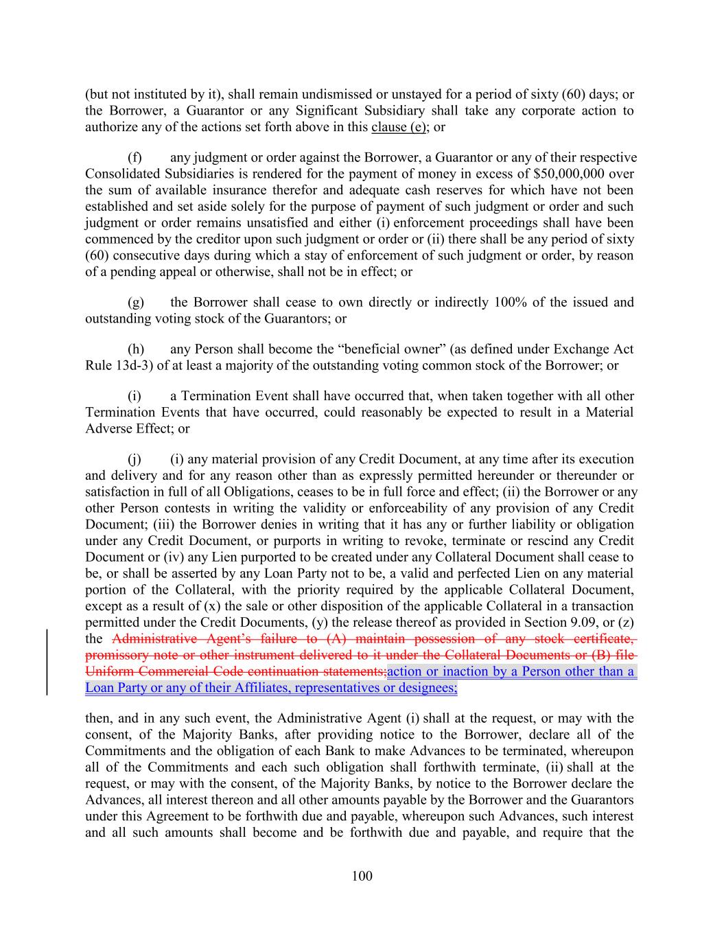 (but not instituted by it), shall remain undismissed or unstayed for a period of sixty (60) days; or the Borrower, a Guarantor or any Significant Subsidiary shall take any corporate action to authorize any of the actions set forth above in this clause (e); or (f) any judgment or order against the Borrower, a Guarantor or any of their respective Consolidated Subsidiaries is rendered for the payment of money in excess of $50,000,000 over the sum of available insurance therefor and adequate cash reserves for which have not been established and set aside solely for the purpose of payment of such judgment or order and such judgment or order remains unsatisfied and either (i) enforcement proceedings shall have been commenced by the creditor upon such judgment or order or (ii) there shall be any period of sixty (60) consecutive days during which a stay of enforcement of such judgment or order, by reason of a pending appeal or otherwise, shall not be in effect; or (g) the Borrower shall cease to own directly or indirectly 100% of the issued and outstanding voting stock of the Guarantors; or (h) any Person shall become the “beneficial owner” (as defined under Exchange Act Rule 13d-3) of at least a majority of the outstanding voting common stock of the Borrower; or (i) a Termination Event shall have occurred that, when taken together with all other Termination Events that have occurred, could reasonably be expected to result in a Material Adverse Effect; or (j) (i) any material provision of any Credit Document, at any time after its execution and delivery and for any reason other than as expressly permitted hereunder or thereunder or satisfaction in full of all Obligations, ceases to be in full force and effect; (ii) the Borrower or any other Person contests in writing the validity or enforceability of any provision of any Credit Document; (iii) the Borrower denies in writing that it has any or further liability or obligation under any Credit Document, or purports in writing to revoke, terminate or rescind any Credit Document or (iv) any Lien purported to be created under any Collateral Document shall cease to be, or shall be asserted by any Loan Party not to be, a valid and perfected Lien on any material portion of the Collateral, with the priority required by the applicable Collateral Document, except as a result of (x) the sale or other disposition of the applicable Collateral in a transaction permitted under the Credit Documents, (y) the release thereof as provided in Section 9.09, or (z) the Administrative Agent’s failure to (A) maintain possession of any stock certificate, promissory note or other instrument delivered to it under the Collateral Documents or (B) file Uniform Commercial Code continuation statements;action or inaction by a Person other than a Loan Party or any of their Affiliates, representatives or designees; then, and in any such event, the Administrative Agent (i) shall at the request, or may with the consent, of the Majority Banks, after providing notice to the Borrower, declare all of the Commitments and the obligation of each Bank to make Advances to be terminated, whereupon all of the Commitments and each such obligation shall forthwith terminate, (ii) shall at the request, or may with the consent, of the Majority Banks, by notice to the Borrower declare the Advances, all interest thereon and all other amounts payable by the Borrower and the Guarantors under this Agreement to be forthwith due and payable, whereupon such Advances, such interest and all such amounts shall become and be forthwith due and payable, and require that the 100