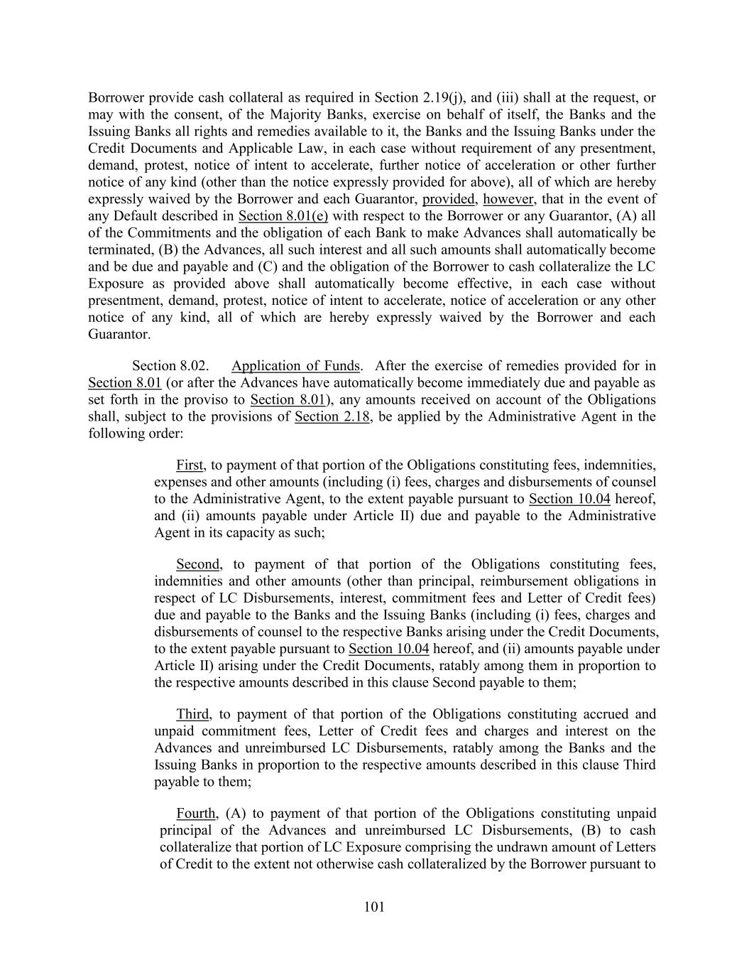 Borrower provide cash collateral as required in Section 2.19(j), and (iii) shall at the request, or may with the consent, of the Majority Banks, exercise on behalf of itself, the Banks and the Issuing Banks all rights and remedies available to it, the Banks and the Issuing Banks under the Credit Documents and Applicable Law, in each case without requirement of any presentment, demand, protest, notice of intent to accelerate, further notice of acceleration or other further notice of any kind (other than the notice expressly provided for above), all of which are hereby expressly waived by the Borrower and each Guarantor, provided, however, that in the event of any Default described in Section 8.01(e) with respect to the Borrower or any Guarantor, (A) all of the Commitments and the obligation of each Bank to make Advances shall automatically be terminated, (B) the Advances, all such interest and all such amounts shall automatically become and be due and payable and (C) and the obligation of the Borrower to cash collateralize the LC Exposure as provided above shall automatically become effective, in each case without presentment, demand, protest, notice of intent to accelerate, notice of acceleration or any other notice of any kind, all of which are hereby expressly waived by the Borrower and each Guarantor. Section 8.02. Application of Funds. After the exercise of remedies provided for in Section 8.01 (or after the Advances have automatically become immediately due and payable as set forth in the proviso to Section 8.01), any amounts received on account of the Obligations shall, subject to the provisions of Section 2.18, be applied by the Administrative Agent in the following order: First, to payment of that portion of the Obligations constituting fees, indemnities, expenses and other amounts (including (i) fees, charges and disbursements of counsel to the Administrative Agent, to the extent payable pursuant to Section 10.04 hereof, and (ii) amounts payable under Article II) due and payable to the Administrative Agent in its capacity as such; Second, to payment of that portion of the Obligations constituting fees, indemnities and other amounts (other than principal, reimbursement obligations in respect of LC Disbursements, interest, commitment fees and Letter of Credit fees) due and payable to the Banks and the Issuing Banks (including (i) fees, charges and disbursements of counsel to the respective Banks arising under the Credit Documents, to the extent payable pursuant to Section 10.04 hereof, and (ii) amounts payable under Article II) arising under the Credit Documents, ratably among them in proportion to the respective amounts described in this clause Second payable to them; Third, to payment of that portion of the Obligations constituting accrued and unpaid commitment fees, Letter of Credit fees and charges and interest on the Advances and unreimbursed LC Disbursements, ratably among the Banks and the Issuing Banks in proportion to the respective amounts described in this clause Third payable to them; Fourth, (A) to payment of that portion of the Obligations constituting unpaid principal of the Advances and unreimbursed LC Disbursements, (B) to cash collateralize that portion of LC Exposure comprising the undrawn amount of Letters of Credit to the extent not otherwise cash collateralized by the Borrower pursuant to 101