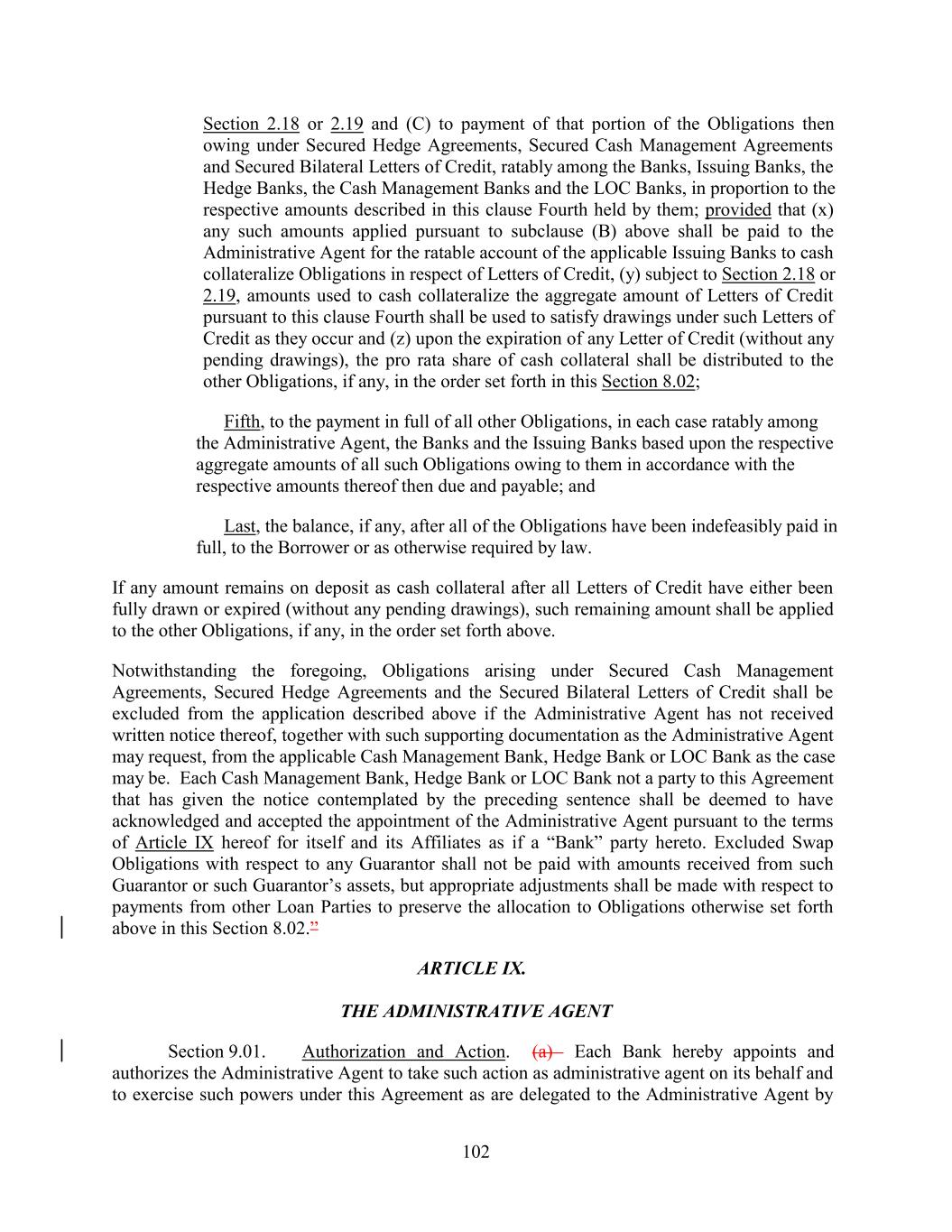 Section 2.18 or 2.19 and (C) to payment of that portion of the Obligations then owing under Secured Hedge Agreements, Secured Cash Management Agreements and Secured Bilateral Letters of Credit, ratably among the Banks, Issuing Banks, the Hedge Banks, the Cash Management Banks and the LOC Banks, in proportion to the respective amounts described in this clause Fourth held by them; provided that (x) any such amounts applied pursuant to subclause (B) above shall be paid to the Administrative Agent for the ratable account of the applicable Issuing Banks to cash collateralize Obligations in respect of Letters of Credit, (y) subject to Section 2.18 or 2.19, amounts used to cash collateralize the aggregate amount of Letters of Credit pursuant to this clause Fourth shall be used to satisfy drawings under such Letters of Credit as they occur and (z) upon the expiration of any Letter of Credit (without any pending drawings), the pro rata share of cash collateral shall be distributed to the other Obligations, if any, in the order set forth in this Section 8.02; Fifth, to the payment in full of all other Obligations, in each case ratably among the Administrative Agent, the Banks and the Issuing Banks based upon the respective aggregate amounts of all such Obligations owing to them in accordance with the respective amounts thereof then due and payable; and Last, the balance, if any, after all of the Obligations have been indefeasibly paid in full, to the Borrower or as otherwise required by law. If any amount remains on deposit as cash collateral after all Letters of Credit have either been fully drawn or expired (without any pending drawings), such remaining amount shall be applied to the other Obligations, if any, in the order set forth above. Notwithstanding the foregoing, Obligations arising under Secured Cash Management Agreements, Secured Hedge Agreements and the Secured Bilateral Letters of Credit shall be excluded from the application described above if the Administrative Agent has not received written notice thereof, together with such supporting documentation as the Administrative Agent may request, from the applicable Cash Management Bank, Hedge Bank or LOC Bank as the case may be. Each Cash Management Bank, Hedge Bank or LOC Bank not a party to this Agreement that has given the notice contemplated by the preceding sentence shall be deemed to have acknowledged and accepted the appointment of the Administrative Agent pursuant to the terms of Article IX hereof for itself and its Affiliates as if a “Bank” party hereto. Excluded Swap Obligations with respect to any Guarantor shall not be paid with amounts received from such Guarantor or such Guarantor’s assets, but appropriate adjustments shall be made with respect to payments from other Loan Parties to preserve the allocation to Obligations otherwise set forth above in this Section 8.02.” ARTICLE IX. THE ADMINISTRATIVE AGENT Section 9.01. Authorization and Action. (a) Each Bank hereby appoints and authorizes the Administrative Agent to take such action as administrative agent on its behalf and to exercise such powers under this Agreement as are delegated to the Administrative Agent by 102