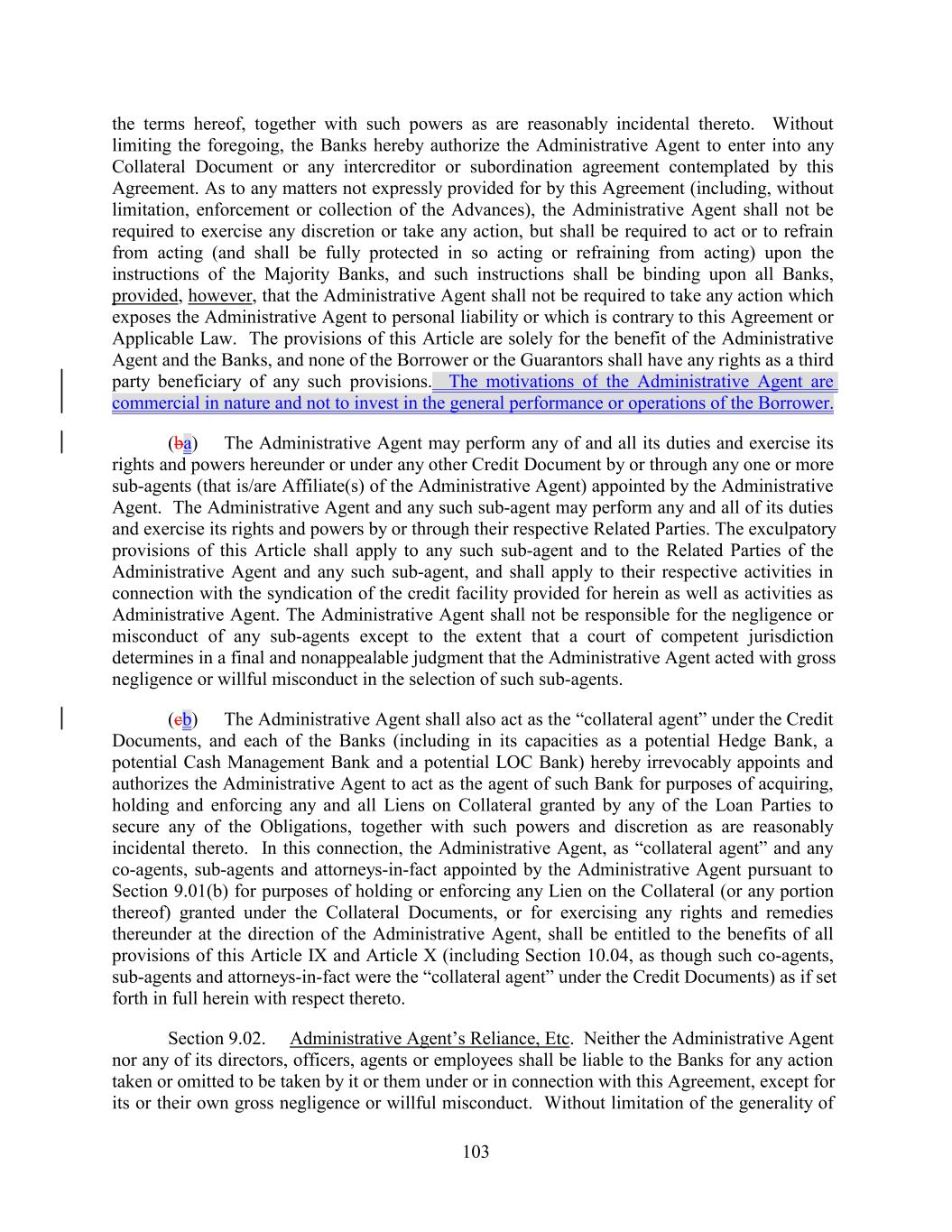 the terms hereof, together with such powers as are reasonably incidental thereto. Without limiting the foregoing, the Banks hereby authorize the Administrative Agent to enter into any Collateral Document or any intercreditor or subordination agreement contemplated by this Agreement. As to any matters not expressly provided for by this Agreement (including, without limitation, enforcement or collection of the Advances), the Administrative Agent shall not be required to exercise any discretion or take any action, but shall be required to act or to refrain from acting (and shall be fully protected in so acting or refraining from acting) upon the instructions of the Majority Banks, and such instructions shall be binding upon all Banks, provided, however, that the Administrative Agent shall not be required to take any action which exposes the Administrative Agent to personal liability or which is contrary to this Agreement or Applicable Law. The provisions of this Article are solely for the benefit of the Administrative Agent and the Banks, and none of the Borrower or the Guarantors shall have any rights as a third party beneficiary of any such provisions. The motivations of the Administrative Agent are commercial in nature and not to invest in the general performance or operations of the Borrower. (ba) The Administrative Agent may perform any of and all its duties and exercise its rights and powers hereunder or under any other Credit Document by or through any one or more sub-agents (that is/are Affiliate(s) of the Administrative Agent) appointed by the Administrative Agent. The Administrative Agent and any such sub-agent may perform any and all of its duties and exercise its rights and powers by or through their respective Related Parties. The exculpatory provisions of this Article shall apply to any such sub-agent and to the Related Parties of the Administrative Agent and any such sub-agent, and shall apply to their respective activities in connection with the syndication of the credit facility provided for herein as well as activities as Administrative Agent. The Administrative Agent shall not be responsible for the negligence or misconduct of any sub-agents except to the extent that a court of competent jurisdiction determines in a final and nonappealable judgment that the Administrative Agent acted with gross negligence or willful misconduct in the selection of such sub-agents. (cb) The Administrative Agent shall also act as the “collateral agent” under the Credit Documents, and each of the Banks (including in its capacities as a potential Hedge Bank, a potential Cash Management Bank and a potential LOC Bank) hereby irrevocably appoints and authorizes the Administrative Agent to act as the agent of such Bank for purposes of acquiring, holding and enforcing any and all Liens on Collateral granted by any of the Loan Parties to secure any of the Obligations, together with such powers and discretion as are reasonably incidental thereto. In this connection, the Administrative Agent, as “collateral agent” and any co-agents, sub-agents and attorneys-in-fact appointed by the Administrative Agent pursuant to Section 9.01(b) for purposes of holding or enforcing any Lien on the Collateral (or any portion thereof) granted under the Collateral Documents, or for exercising any rights and remedies thereunder at the direction of the Administrative Agent, shall be entitled to the benefits of all provisions of this Article IX and Article X (including Section 10.04, as though such co-agents, sub-agents and attorneys-in-fact were the “collateral agent” under the Credit Documents) as if set forth in full herein with respect thereto. Section 9.02. Administrative Agent’s Reliance, Etc. Neither the Administrative Agent nor any of its directors, officers, agents or employees shall be liable to the Banks for any action taken or omitted to be taken by it or them under or in connection with this Agreement, except for its or their own gross negligence or willful misconduct. Without limitation of the generality of 103