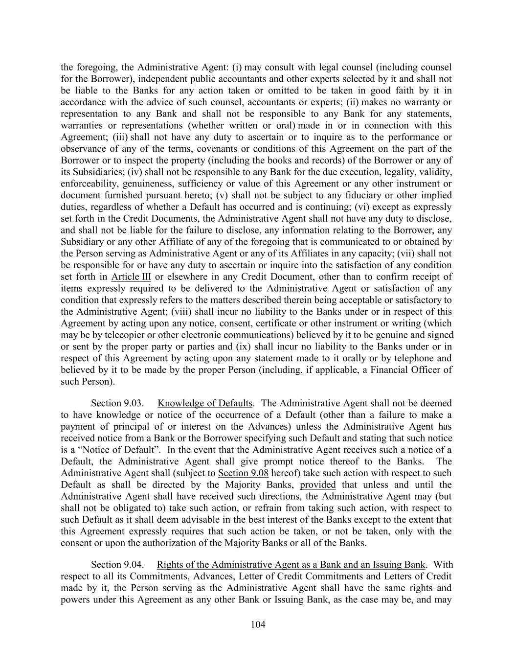 the foregoing, the Administrative Agent: (i) may consult with legal counsel (including counsel for the Borrower), independent public accountants and other experts selected by it and shall not be liable to the Banks for any action taken or omitted to be taken in good faith by it in accordance with the advice of such counsel, accountants or experts; (ii) makes no warranty or representation to any Bank and shall not be responsible to any Bank for any statements, warranties or representations (whether written or oral) made in or in connection with this Agreement; (iii) shall not have any duty to ascertain or to inquire as to the performance or observance of any of the terms, covenants or conditions of this Agreement on the part of the Borrower or to inspect the property (including the books and records) of the Borrower or any of its Subsidiaries; (iv) shall not be responsible to any Bank for the due execution, legality, validity, enforceability, genuineness, sufficiency or value of this Agreement or any other instrument or document furnished pursuant hereto; (v) shall not be subject to any fiduciary or other implied duties, regardless of whether a Default has occurred and is continuing; (vi) except as expressly set forth in the Credit Documents, the Administrative Agent shall not have any duty to disclose, and shall not be liable for the failure to disclose, any information relating to the Borrower, any Subsidiary or any other Affiliate of any of the foregoing that is communicated to or obtained by the Person serving as Administrative Agent or any of its Affiliates in any capacity; (vii) shall not be responsible for or have any duty to ascertain or inquire into the satisfaction of any condition set forth in Article III or elsewhere in any Credit Document, other than to confirm receipt of items expressly required to be delivered to the Administrative Agent or satisfaction of any condition that expressly refers to the matters described therein being acceptable or satisfactory to the Administrative Agent; (viii) shall incur no liability to the Banks under or in respect of this Agreement by acting upon any notice, consent, certificate or other instrument or writing (which may be by telecopier or other electronic communications) believed by it to be genuine and signed or sent by the proper party or parties and (ix) shall incur no liability to the Banks under or in respect of this Agreement by acting upon any statement made to it orally or by telephone and believed by it to be made by the proper Person (including, if applicable, a Financial Officer of such Person). Section 9.03. Knowledge of Defaults. The Administrative Agent shall not be deemed to have knowledge or notice of the occurrence of a Default (other than a failure to make a payment of principal of or interest on the Advances) unless the Administrative Agent has received notice from a Bank or the Borrower specifying such Default and stating that such notice is a “Notice of Default”. In the event that the Administrative Agent receives such a notice of a Default, the Administrative Agent shall give prompt notice thereof to the Banks. The Administrative Agent shall (subject to Section 9.08 hereof) take such action with respect to such Default as shall be directed by the Majority Banks, provided that unless and until the Administrative Agent shall have received such directions, the Administrative Agent may (but shall not be obligated to) take such action, or refrain from taking such action, with respect to such Default as it shall deem advisable in the best interest of the Banks except to the extent that this Agreement expressly requires that such action be taken, or not be taken, only with the consent or upon the authorization of the Majority Banks or all of the Banks. Section 9.04. Rights of the Administrative Agent as a Bank and an Issuing Bank. With respect to all its Commitments, Advances, Letter of Credit Commitments and Letters of Credit made by it, the Person serving as the Administrative Agent shall have the same rights and powers under this Agreement as any other Bank or Issuing Bank, as the case may be, and may 104