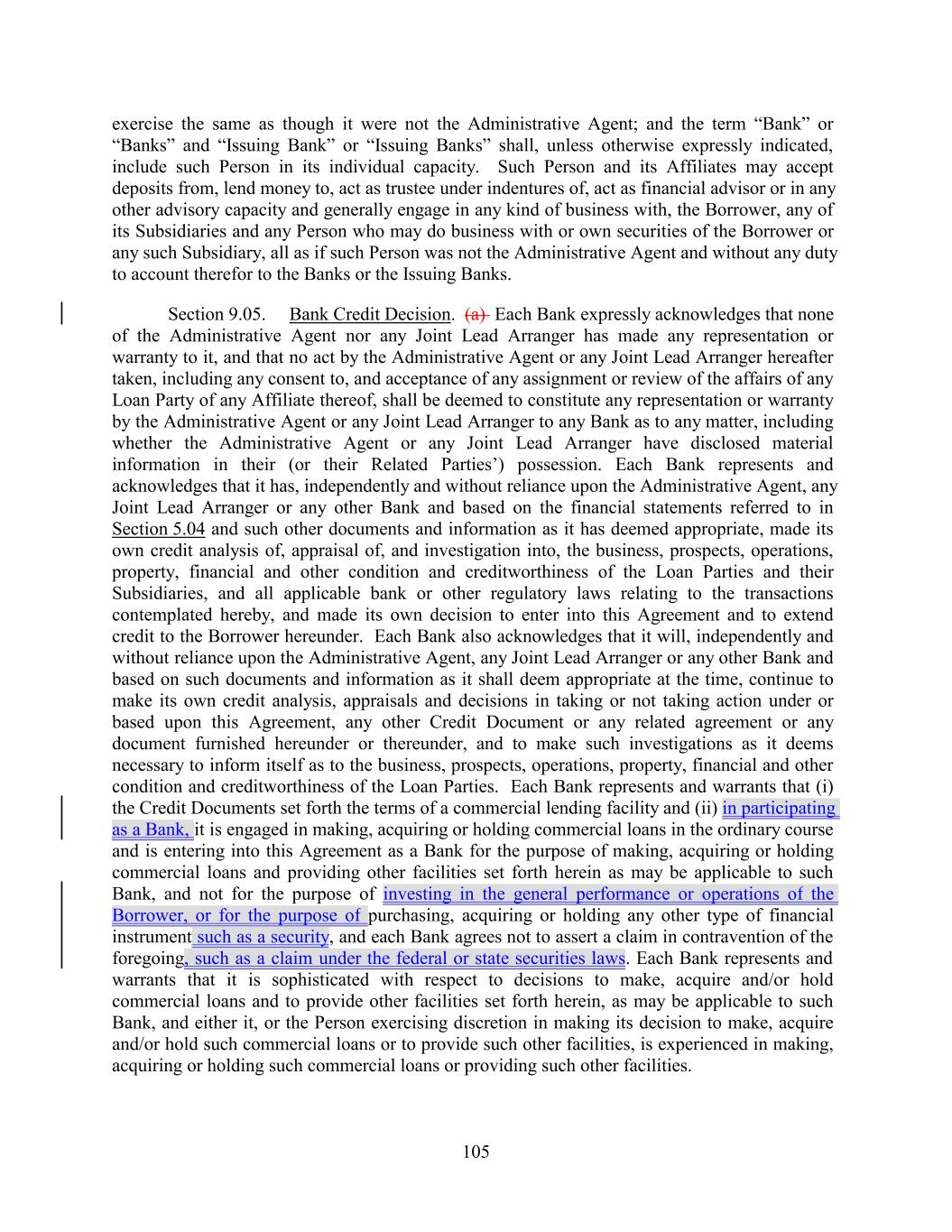 exercise the same as though it were not the Administrative Agent; and the term “Bank” or “Banks” and “Issuing Bank” or “Issuing Banks” shall, unless otherwise expressly indicated, include such Person in its individual capacity. Such Person and its Affiliates may accept deposits from, lend money to, act as trustee under indentures of, act as financial advisor or in any other advisory capacity and generally engage in any kind of business with, the Borrower, any of its Subsidiaries and any Person who may do business with or own securities of the Borrower or any such Subsidiary, all as if such Person was not the Administrative Agent and without any duty to account therefor to the Banks or the Issuing Banks. Section 9.05. Bank Credit Decision. (a) Each Bank expressly acknowledges that none of the Administrative Agent nor any Joint Lead Arranger has made any representation or warranty to it, and that no act by the Administrative Agent or any Joint Lead Arranger hereafter taken, including any consent to, and acceptance of any assignment or review of the affairs of any Loan Party of any Affiliate thereof, shall be deemed to constitute any representation or warranty by the Administrative Agent or any Joint Lead Arranger to any Bank as to any matter, including whether the Administrative Agent or any Joint Lead Arranger have disclosed material information in their (or their Related Parties’) possession. Each Bank represents and acknowledges that it has, independently and without reliance upon the Administrative Agent, any Joint Lead Arranger or any other Bank and based on the financial statements referred to in Section 5.04 and such other documents and information as it has deemed appropriate, made its own credit analysis of, appraisal of, and investigation into, the business, prospects, operations, property, financial and other condition and creditworthiness of the Loan Parties and their Subsidiaries, and all applicable bank or other regulatory laws relating to the transactions contemplated hereby, and made its own decision to enter into this Agreement and to extend credit to the Borrower hereunder. Each Bank also acknowledges that it will, independently and without reliance upon the Administrative Agent, any Joint Lead Arranger or any other Bank and based on such documents and information as it shall deem appropriate at the time, continue to make its own credit analysis, appraisals and decisions in taking or not taking action under or based upon this Agreement, any other Credit Document or any related agreement or any document furnished hereunder or thereunder, and to make such investigations as it deems necessary to inform itself as to the business, prospects, operations, property, financial and other condition and creditworthiness of the Loan Parties. Each Bank represents and warrants that (i) the Credit Documents set forth the terms of a commercial lending facility and (ii) in participating as a Bank, it is engaged in making, acquiring or holding commercial loans in the ordinary course and is entering into this Agreement as a Bank for the purpose of making, acquiring or holding commercial loans and providing other facilities set forth herein as may be applicable to such Bank, and not for the purpose of investing in the general performance or operations of the Borrower, or for the purpose of purchasing, acquiring or holding any other type of financial instrument such as a security, and each Bank agrees not to assert a claim in contravention of the foregoing, such as a claim under the federal or state securities laws. Each Bank represents and warrants that it is sophisticated with respect to decisions to make, acquire and/or hold commercial loans and to provide other facilities set forth herein, as may be applicable to such Bank, and either it, or the Person exercising discretion in making its decision to make, acquire and/or hold such commercial loans or to provide such other facilities, is experienced in making, acquiring or holding such commercial loans or providing such other facilities. 105