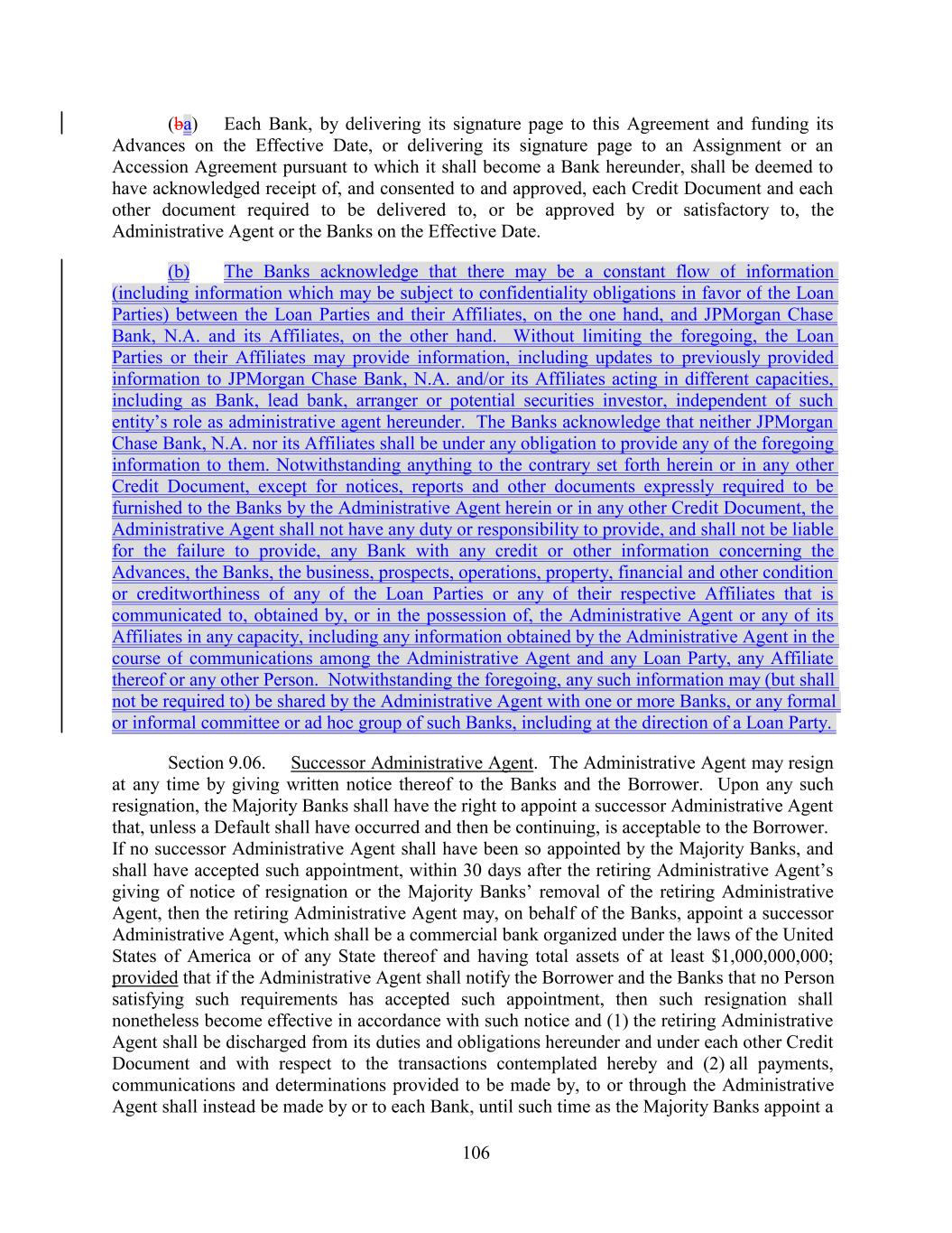 (ba) Each Bank, by delivering its signature page to this Agreement and funding its Advances on the Effective Date, or delivering its signature page to an Assignment or an Accession Agreement pursuant to which it shall become a Bank hereunder, shall be deemed to have acknowledged receipt of, and consented to and approved, each Credit Document and each other document required to be delivered to, or be approved by or satisfactory to, the Administrative Agent or the Banks on the Effective Date. (b) The Banks acknowledge that there may be a constant flow of information (including information which may be subject to confidentiality obligations in favor of the Loan Parties) between the Loan Parties and their Affiliates, on the one hand, and JPMorgan Chase Bank, N.A. and its Affiliates, on the other hand. Without limiting the foregoing, the Loan Parties or their Affiliates may provide information, including updates to previously provided information to JPMorgan Chase Bank, N.A. and/or its Affiliates acting in different capacities, including as Bank, lead bank, arranger or potential securities investor, independent of such entity’s role as administrative agent hereunder. The Banks acknowledge that neither JPMorgan Chase Bank, N.A. nor its Affiliates shall be under any obligation to provide any of the foregoing information to them. Notwithstanding anything to the contrary set forth herein or in any other Credit Document, except for notices, reports and other documents expressly required to be furnished to the Banks by the Administrative Agent herein or in any other Credit Document, the Administrative Agent shall not have any duty or responsibility to provide, and shall not be liable for the failure to provide, any Bank with any credit or other information concerning the Advances, the Banks, the business, prospects, operations, property, financial and other condition or creditworthiness of any of the Loan Parties or any of their respective Affiliates that is communicated to, obtained by, or in the possession of, the Administrative Agent or any of its Affiliates in any capacity, including any information obtained by the Administrative Agent in the course of communications among the Administrative Agent and any Loan Party, any Affiliate thereof or any other Person. Notwithstanding the foregoing, any such information may (but shall not be required to) be shared by the Administrative Agent with one or more Banks, or any formal or informal committee or ad hoc group of such Banks, including at the direction of a Loan Party. Section 9.06. Successor Administrative Agent. The Administrative Agent may resign at any time by giving written notice thereof to the Banks and the Borrower. Upon any such resignation, the Majority Banks shall have the right to appoint a successor Administrative Agent that, unless a Default shall have occurred and then be continuing, is acceptable to the Borrower. If no successor Administrative Agent shall have been so appointed by the Majority Banks, and shall have accepted such appointment, within 30 days after the retiring Administrative Agent’s giving of notice of resignation or the Majority Banks’ removal of the retiring Administrative Agent, then the retiring Administrative Agent may, on behalf of the Banks, appoint a successor Administrative Agent, which shall be a commercial bank organized under the laws of the United States of America or of any State thereof and having total assets of at least $1,000,000,000; provided that if the Administrative Agent shall notify the Borrower and the Banks that no Person satisfying such requirements has accepted such appointment, then such resignation shall nonetheless become effective in accordance with such notice and (1) the retiring Administrative Agent shall be discharged from its duties and obligations hereunder and under each other Credit Document and with respect to the transactions contemplated hereby and (2) all payments, communications and determinations provided to be made by, to or through the Administrative Agent shall instead be made by or to each Bank, until such time as the Majority Banks appoint a 106