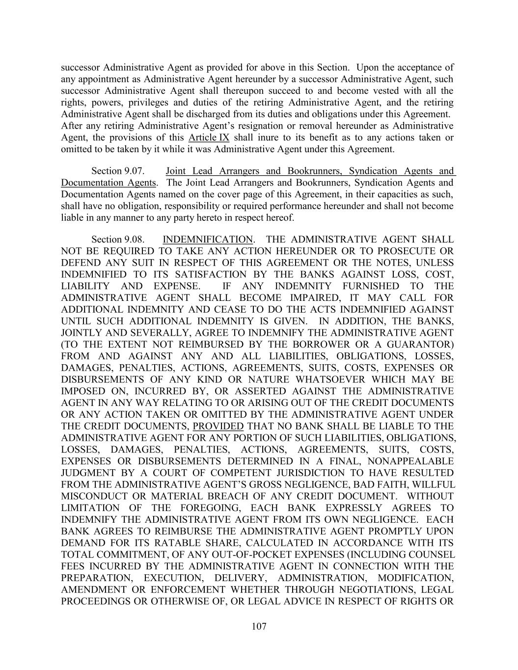 successor Administrative Agent as provided for above in this Section. Upon the acceptance of any appointment as Administrative Agent hereunder by a successor Administrative Agent, such successor Administrative Agent shall thereupon succeed to and become vested with all the rights, powers, privileges and duties of the retiring Administrative Agent, and the retiring Administrative Agent shall be discharged from its duties and obligations under this Agreement. After any retiring Administrative Agent’s resignation or removal hereunder as Administrative Agent, the provisions of this Article IX shall inure to its benefit as to any actions taken or omitted to be taken by it while it was Administrative Agent under this Agreement. Section 9.07. Joint Lead Arrangers and Bookrunners, Syndication Agents and Documentation Agents. The Joint Lead Arrangers and Bookrunners, Syndication Agents and Documentation Agents named on the cover page of this Agreement, in their capacities as such, shall have no obligation, responsibility or required performance hereunder and shall not become liable in any manner to any party hereto in respect hereof. Section 9.08. INDEMNIFICATION. THE ADMINISTRATIVE AGENT SHALL NOT BE REQUIRED TO TAKE ANY ACTION HEREUNDER OR TO PROSECUTE OR DEFEND ANY SUIT IN RESPECT OF THIS AGREEMENT OR THE NOTES, UNLESS INDEMNIFIED TO ITS SATISFACTION BY THE BANKS AGAINST LOSS, COST, LIABILITY AND EXPENSE. IF ANY INDEMNITY FURNISHED TO THE ADMINISTRATIVE AGENT SHALL BECOME IMPAIRED, IT MAY CALL FOR ADDITIONAL INDEMNITY AND CEASE TO DO THE ACTS INDEMNIFIED AGAINST UNTIL SUCH ADDITIONAL INDEMNITY IS GIVEN. IN ADDITION, THE BANKS, JOINTLY AND SEVERALLY, AGREE TO INDEMNIFY THE ADMINISTRATIVE AGENT (TO THE EXTENT NOT REIMBURSED BY THE BORROWER OR A GUARANTOR) FROM AND AGAINST ANY AND ALL LIABILITIES, OBLIGATIONS, LOSSES, DAMAGES, PENALTIES, ACTIONS, AGREEMENTS, SUITS, COSTS, EXPENSES OR DISBURSEMENTS OF ANY KIND OR NATURE WHATSOEVER WHICH MAY BE IMPOSED ON, INCURRED BY, OR ASSERTED AGAINST THE ADMINISTRATIVE AGENT IN ANY WAY RELATING TO OR ARISING OUT OF THE CREDIT DOCUMENTS OR ANY ACTION TAKEN OR OMITTED BY THE ADMINISTRATIVE AGENT UNDER THE CREDIT DOCUMENTS, PROVIDED THAT NO BANK SHALL BE LIABLE TO THE ADMINISTRATIVE AGENT FOR ANY PORTION OF SUCH LIABILITIES, OBLIGATIONS, LOSSES, DAMAGES, PENALTIES, ACTIONS, AGREEMENTS, SUITS, COSTS, EXPENSES OR DISBURSEMENTS DETERMINED IN A FINAL, NONAPPEALABLE JUDGMENT BY A COURT OF COMPETENT JURISDICTION TO HAVE RESULTED FROM THE ADMINISTRATIVE AGENT’S GROSS NEGLIGENCE, BAD FAITH, WILLFUL MISCONDUCT OR MATERIAL BREACH OF ANY CREDIT DOCUMENT. WITHOUT LIMITATION OF THE FOREGOING, EACH BANK EXPRESSLY AGREES TO INDEMNIFY THE ADMINISTRATIVE AGENT FROM ITS OWN NEGLIGENCE. EACH BANK AGREES TO REIMBURSE THE ADMINISTRATIVE AGENT PROMPTLY UPON DEMAND FOR ITS RATABLE SHARE, CALCULATED IN ACCORDANCE WITH ITS TOTAL COMMITMENT, OF ANY OUT-OF-POCKET EXPENSES (INCLUDING COUNSEL FEES INCURRED BY THE ADMINISTRATIVE AGENT IN CONNECTION WITH THE PREPARATION, EXECUTION, DELIVERY, ADMINISTRATION, MODIFICATION, AMENDMENT OR ENFORCEMENT WHETHER THROUGH NEGOTIATIONS, LEGAL PROCEEDINGS OR OTHERWISE OF, OR LEGAL ADVICE IN RESPECT OF RIGHTS OR 107