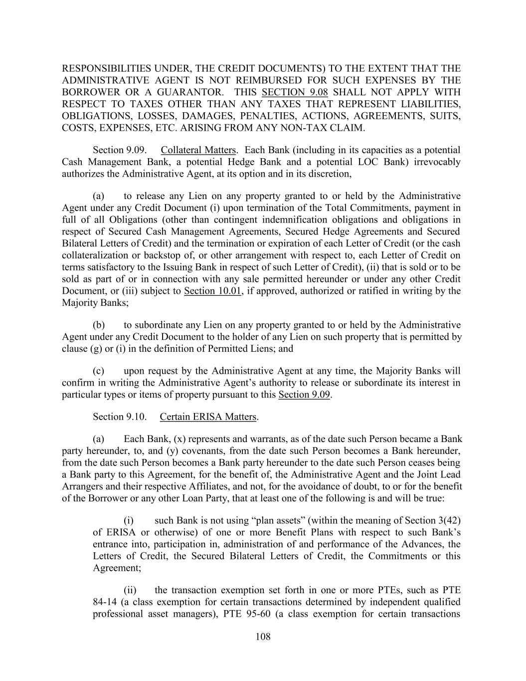 RESPONSIBILITIES UNDER, THE CREDIT DOCUMENTS) TO THE EXTENT THAT THE ADMINISTRATIVE AGENT IS NOT REIMBURSED FOR SUCH EXPENSES BY THE BORROWER OR A GUARANTOR. THIS SECTION 9.08 SHALL NOT APPLY WITH RESPECT TO TAXES OTHER THAN ANY TAXES THAT REPRESENT LIABILITIES, OBLIGATIONS, LOSSES, DAMAGES, PENALTIES, ACTIONS, AGREEMENTS, SUITS, COSTS, EXPENSES, ETC. ARISING FROM ANY NON-TAX CLAIM. Section 9.09. Collateral Matters. Each Bank (including in its capacities as a potential Cash Management Bank, a potential Hedge Bank and a potential LOC Bank) irrevocably authorizes the Administrative Agent, at its option and in its discretion, (a) to release any Lien on any property granted to or held by the Administrative Agent under any Credit Document (i) upon termination of the Total Commitments, payment in full of all Obligations (other than contingent indemnification obligations and obligations in respect of Secured Cash Management Agreements, Secured Hedge Agreements and Secured Bilateral Letters of Credit) and the termination or expiration of each Letter of Credit (or the cash collateralization or backstop of, or other arrangement with respect to, each Letter of Credit on terms satisfactory to the Issuing Bank in respect of such Letter of Credit), (ii) that is sold or to be sold as part of or in connection with any sale permitted hereunder or under any other Credit Document, or (iii) subject to Section 10.01, if approved, authorized or ratified in writing by the Majority Banks; (b) to subordinate any Lien on any property granted to or held by the Administrative Agent under any Credit Document to the holder of any Lien on such property that is permitted by clause (g) or (i) in the definition of Permitted Liens; and (c) upon request by the Administrative Agent at any time, the Majority Banks will confirm in writing the Administrative Agent’s authority to release or subordinate its interest in particular types or items of property pursuant to this Section 9.09. Section 9.10. Certain ERISA Matters. (a) Each Bank, (x) represents and warrants, as of the date such Person became a Bank party hereunder, to, and (y) covenants, from the date such Person becomes a Bank hereunder, from the date such Person becomes a Bank party hereunder to the date such Person ceases being a Bank party to this Agreement, for the benefit of, the Administrative Agent and the Joint Lead Arrangers and their respective Affiliates, and not, for the avoidance of doubt, to or for the benefit of the Borrower or any other Loan Party, that at least one of the following is and will be true: (i) such Bank is not using “plan assets” (within the meaning of Section 3(42) of ERISA or otherwise) of one or more Benefit Plans with respect to such Bank’s entrance into, participation in, administration of and performance of the Advances, the Letters of Credit, the Secured Bilateral Letters of Credit, the Commitments or this Agreement; (ii) the transaction exemption set forth in one or more PTEs, such as PTE 84-14 (a class exemption for certain transactions determined by independent qualified professional asset managers), PTE 95-60 (a class exemption for certain transactions 108