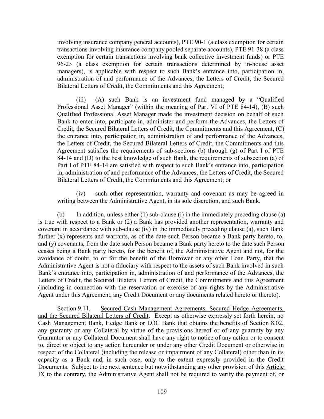 involving insurance company general accounts), PTE 90-1 (a class exemption for certain transactions involving insurance company pooled separate accounts), PTE 91-38 (a class exemption for certain transactions involving bank collective investment funds) or PTE 96-23 (a class exemption for certain transactions determined by in-house asset managers), is applicable with respect to such Bank’s entrance into, participation in, administration of and performance of the Advances, the Letters of Credit, the Secured Bilateral Letters of Credit, the Commitments and this Agreement; (iii) (A) such Bank is an investment fund managed by a “Qualified Professional Asset Manager” (within the meaning of Part VI of PTE 84-14), (B) such Qualified Professional Asset Manager made the investment decision on behalf of such Bank to enter into, participate in, administer and perform the Advances, the Letters of Credit, the Secured Bilateral Letters of Credit, the Commitments and this Agreement, (C) the entrance into, participation in, administration of and performance of the Advances, the Letters of Credit, the Secured Bilateral Letters of Credit, the Commitments and this Agreement satisfies the requirements of sub-sections (b) through (g) of Part I of PTE 84-14 and (D) to the best knowledge of such Bank, the requirements of subsection (a) of Part I of PTE 84-14 are satisfied with respect to such Bank’s entrance into, participation in, administration of and performance of the Advances, the Letters of Credit, the Secured Bilateral Letters of Credit, the Commitments and this Agreement; or (iv) such other representation, warranty and covenant as may be agreed in writing between the Administrative Agent, in its sole discretion, and such Bank. (b) In addition, unless either (1) sub-clause (i) in the immediately preceding clause (a) is true with respect to a Bank or (2) a Bank has provided another representation, warranty and covenant in accordance with sub-clause (iv) in the immediately preceding clause (a), such Bank further (x) represents and warrants, as of the date such Person became a Bank party hereto, to, and (y) covenants, from the date such Person became a Bank party hereto to the date such Person ceases being a Bank party hereto, for the benefit of, the Administrative Agent and not, for the avoidance of doubt, to or for the benefit of the Borrower or any other Loan Party, that the Administrative Agent is not a fiduciary with respect to the assets of such Bank involved in such Bank’s entrance into, participation in, administration of and performance of the Advances, the Letters of Credit, the Secured Bilateral Letters of Credit, the Commitments and this Agreement (including in connection with the reservation or exercise of any rights by the Administrative Agent under this Agreement, any Credit Document or any documents related hereto or thereto). Section 9.11. Secured Cash Management Agreements, Secured Hedge Agreements, and the Secured Bilateral Letters of Credit. Except as otherwise expressly set forth herein, no Cash Management Bank, Hedge Bank or LOC Bank that obtains the benefits of Section 8.02, any guaranty or any Collateral by virtue of the provisions hereof or of any guaranty by any Guarantor or any Collateral Document shall have any right to notice of any action or to consent to, direct or object to any action hereunder or under any other Credit Document or otherwise in respect of the Collateral (including the release or impairment of any Collateral) other than in its capacity as a Bank and, in such case, only to the extent expressly provided in the Credit Documents. Subject to the next sentence but notwithstanding any other provision of this Article IX to the contrary, the Administrative Agent shall not be required to verify the payment of, or 109