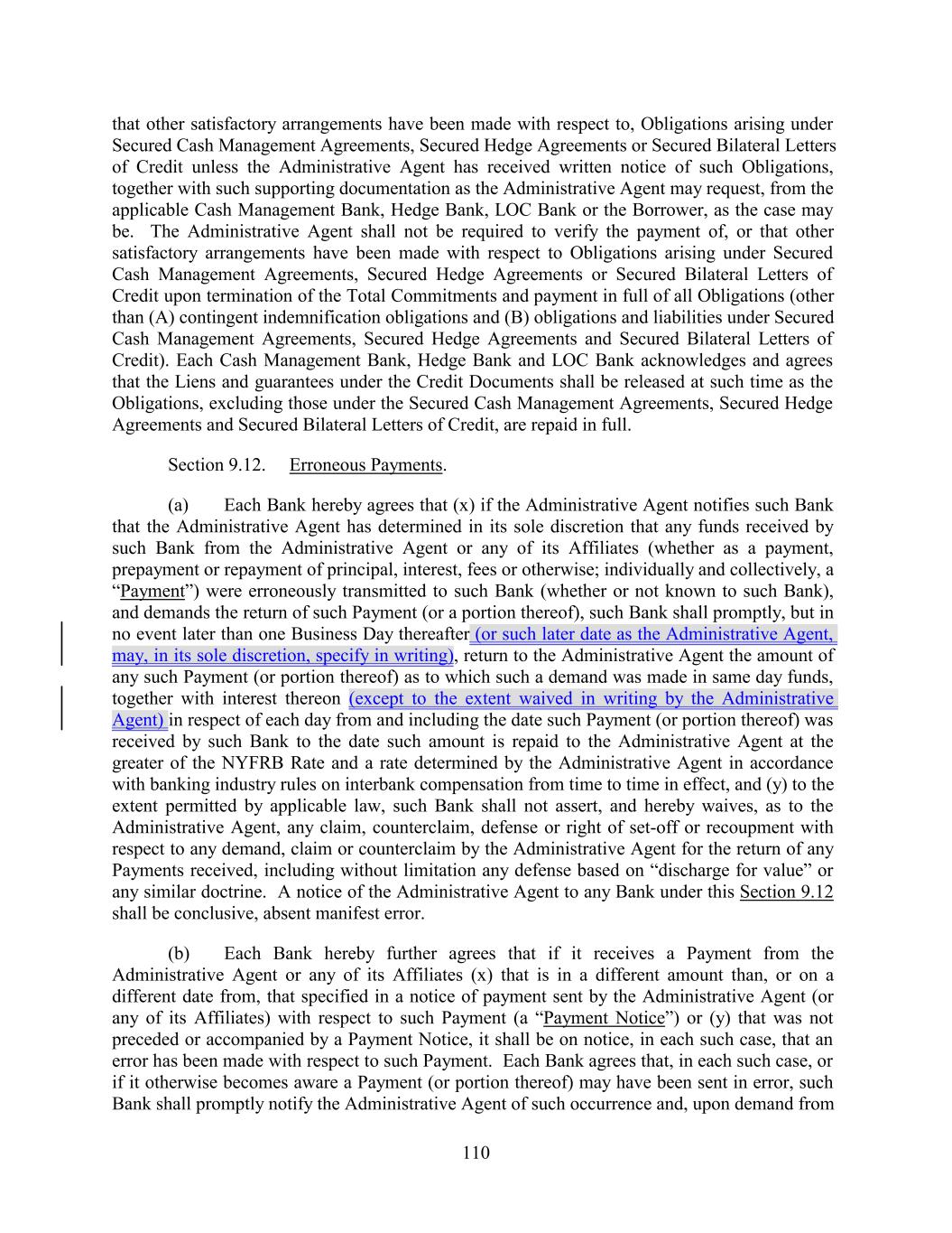 that other satisfactory arrangements have been made with respect to, Obligations arising under Secured Cash Management Agreements, Secured Hedge Agreements or Secured Bilateral Letters of Credit unless the Administrative Agent has received written notice of such Obligations, together with such supporting documentation as the Administrative Agent may request, from the applicable Cash Management Bank, Hedge Bank, LOC Bank or the Borrower, as the case may be. The Administrative Agent shall not be required to verify the payment of, or that other satisfactory arrangements have been made with respect to Obligations arising under Secured Cash Management Agreements, Secured Hedge Agreements or Secured Bilateral Letters of Credit upon termination of the Total Commitments and payment in full of all Obligations (other than (A) contingent indemnification obligations and (B) obligations and liabilities under Secured Cash Management Agreements, Secured Hedge Agreements and Secured Bilateral Letters of Credit). Each Cash Management Bank, Hedge Bank and LOC Bank acknowledges and agrees that the Liens and guarantees under the Credit Documents shall be released at such time as the Obligations, excluding those under the Secured Cash Management Agreements, Secured Hedge Agreements and Secured Bilateral Letters of Credit, are repaid in full. Section 9.12. Erroneous Payments. (a) Each Bank hereby agrees that (x) if the Administrative Agent notifies such Bank that the Administrative Agent has determined in its sole discretion that any funds received by such Bank from the Administrative Agent or any of its Affiliates (whether as a payment, prepayment or repayment of principal, interest, fees or otherwise; individually and collectively, a “Payment”) were erroneously transmitted to such Bank (whether or not known to such Bank), and demands the return of such Payment (or a portion thereof), such Bank shall promptly, but in no event later than one Business Day thereafter (or such later date as the Administrative Agent, may, in its sole discretion, specify in writing), return to the Administrative Agent the amount of any such Payment (or portion thereof) as to which such a demand was made in same day funds, together with interest thereon (except to the extent waived in writing by the Administrative Agent) in respect of each day from and including the date such Payment (or portion thereof) was received by such Bank to the date such amount is repaid to the Administrative Agent at the greater of the NYFRB Rate and a rate determined by the Administrative Agent in accordance with banking industry rules on interbank compensation from time to time in effect, and (y) to the extent permitted by applicable law, such Bank shall not assert, and hereby waives, as to the Administrative Agent, any claim, counterclaim, defense or right of set-off or recoupment with respect to any demand, claim or counterclaim by the Administrative Agent for the return of any Payments received, including without limitation any defense based on “discharge for value” or any similar doctrine. A notice of the Administrative Agent to any Bank under this Section 9.12 shall be conclusive, absent manifest error. (b) Each Bank hereby further agrees that if it receives a Payment from the Administrative Agent or any of its Affiliates (x) that is in a different amount than, or on a different date from, that specified in a notice of payment sent by the Administrative Agent (or any of its Affiliates) with respect to such Payment (a “Payment Notice”) or (y) that was not preceded or accompanied by a Payment Notice, it shall be on notice, in each such case, that an error has been made with respect to such Payment. Each Bank agrees that, in each such case, or if it otherwise becomes aware a Payment (or portion thereof) may have been sent in error, such Bank shall promptly notify the Administrative Agent of such occurrence and, upon demand from 110