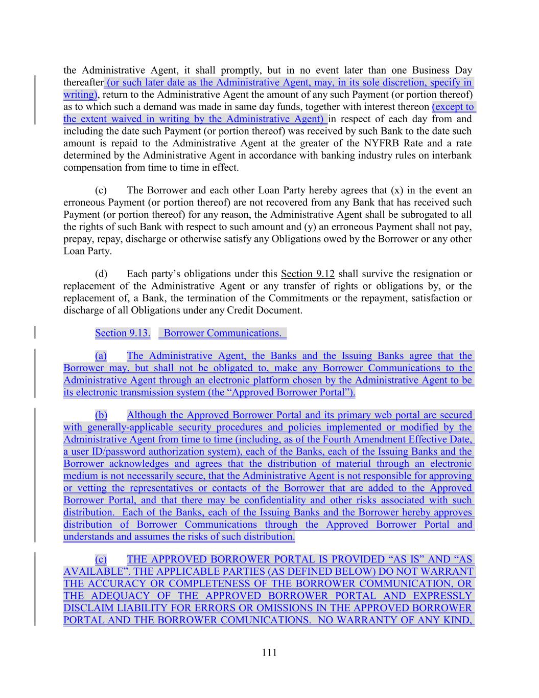 the Administrative Agent, it shall promptly, but in no event later than one Business Day thereafter (or such later date as the Administrative Agent, may, in its sole discretion, specify in writing), return to the Administrative Agent the amount of any such Payment (or portion thereof) as to which such a demand was made in same day funds, together with interest thereon (except to the extent waived in writing by the Administrative Agent) in respect of each day from and including the date such Payment (or portion thereof) was received by such Bank to the date such amount is repaid to the Administrative Agent at the greater of the NYFRB Rate and a rate determined by the Administrative Agent in accordance with banking industry rules on interbank compensation from time to time in effect. (c) The Borrower and each other Loan Party hereby agrees that (x) in the event an erroneous Payment (or portion thereof) are not recovered from any Bank that has received such Payment (or portion thereof) for any reason, the Administrative Agent shall be subrogated to all the rights of such Bank with respect to such amount and (y) an erroneous Payment shall not pay, prepay, repay, discharge or otherwise satisfy any Obligations owed by the Borrower or any other Loan Party. (d) Each party’s obligations under this Section 9.12 shall survive the resignation or replacement of the Administrative Agent or any transfer of rights or obligations by, or the replacement of, a Bank, the termination of the Commitments or the repayment, satisfaction or discharge of all Obligations under any Credit Document. Section 9.13. Borrower Communications. (a) The Administrative Agent, the Banks and the Issuing Banks agree that the Borrower may, but shall not be obligated to, make any Borrower Communications to the Administrative Agent through an electronic platform chosen by the Administrative Agent to be its electronic transmission system (the “Approved Borrower Portal”). (b) Although the Approved Borrower Portal and its primary web portal are secured with generally-applicable security procedures and policies implemented or modified by the Administrative Agent from time to time (including, as of the Fourth Amendment Effective Date, a user ID/password authorization system), each of the Banks, each of the Issuing Banks and the Borrower acknowledges and agrees that the distribution of material through an electronic medium is not necessarily secure, that the Administrative Agent is not responsible for approving or vetting the representatives or contacts of the Borrower that are added to the Approved Borrower Portal, and that there may be confidentiality and other risks associated with such distribution. Each of the Banks, each of the Issuing Banks and the Borrower hereby approves distribution of Borrower Communications through the Approved Borrower Portal and understands and assumes the risks of such distribution. (c) THE APPROVED BORROWER PORTAL IS PROVIDED “AS IS” AND “AS AVAILABLE”. THE APPLICABLE PARTIES (AS DEFINED BELOW) DO NOT WARRANT THE ACCURACY OR COMPLETENESS OF THE BORROWER COMMUNICATION, OR THE ADEQUACY OF THE APPROVED BORROWER PORTAL AND EXPRESSLY DISCLAIM LIABILITY FOR ERRORS OR OMISSIONS IN THE APPROVED BORROWER PORTAL AND THE BORROWER COMUNICATIONS. NO WARRANTY OF ANY KIND, 111