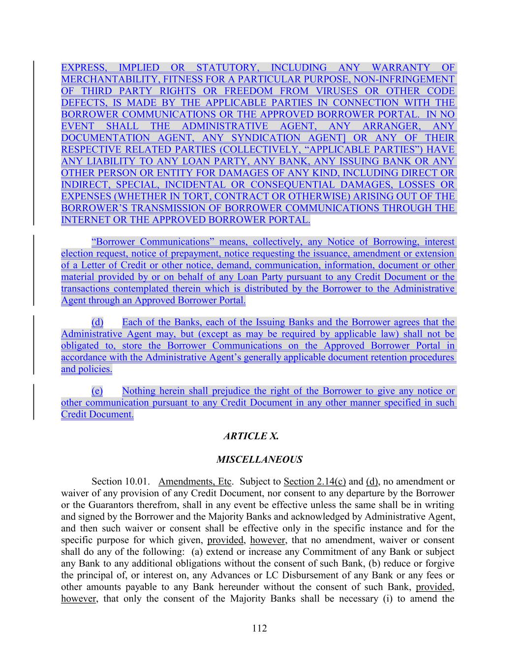 EXPRESS, IMPLIED OR STATUTORY, INCLUDING ANY WARRANTY OF MERCHANTABILITY, FITNESS FOR A PARTICULAR PURPOSE, NON-INFRINGEMENT OF THIRD PARTY RIGHTS OR FREEDOM FROM VIRUSES OR OTHER CODE DEFECTS, IS MADE BY THE APPLICABLE PARTIES IN CONNECTION WITH THE BORROWER COMMUNICATIONS OR THE APPROVED BORROWER PORTAL. IN NO EVENT SHALL THE ADMINISTRATIVE AGENT, ANY ARRANGER, ANY DOCUMENTATION AGENT, ANY SYNDICATION AGENT] OR ANY OF THEIR RESPECTIVE RELATED PARTIES (COLLECTIVELY, “APPLICABLE PARTIES”) HAVE ANY LIABILITY TO ANY LOAN PARTY, ANY BANK, ANY ISSUING BANK OR ANY OTHER PERSON OR ENTITY FOR DAMAGES OF ANY KIND, INCLUDING DIRECT OR INDIRECT, SPECIAL, INCIDENTAL OR CONSEQUENTIAL DAMAGES, LOSSES OR EXPENSES (WHETHER IN TORT, CONTRACT OR OTHERWISE) ARISING OUT OF THE BORROWER’S TRANSMISSION OF BORROWER COMMUNICATIONS THROUGH THE INTERNET OR THE APPROVED BORROWER PORTAL. “Borrower Communications” means, collectively, any Notice of Borrowing, interest election request, notice of prepayment, notice requesting the issuance, amendment or extension of a Letter of Credit or other notice, demand, communication, information, document or other material provided by or on behalf of any Loan Party pursuant to any Credit Document or the transactions contemplated therein which is distributed by the Borrower to the Administrative Agent through an Approved Borrower Portal. (d) Each of the Banks, each of the Issuing Banks and the Borrower agrees that the Administrative Agent may, but (except as may be required by applicable law) shall not be obligated to, store the Borrower Communications on the Approved Borrower Portal in accordance with the Administrative Agent’s generally applicable document retention procedures and policies. (e) Nothing herein shall prejudice the right of the Borrower to give any notice or other communication pursuant to any Credit Document in any other manner specified in such Credit Document. ARTICLE X. MISCELLANEOUS Section 10.01. Amendments, Etc. Subject to Section 2.14(c) and (d), no amendment or waiver of any provision of any Credit Document, nor consent to any departure by the Borrower or the Guarantors therefrom, shall in any event be effective unless the same shall be in writing and signed by the Borrower and the Majority Banks and acknowledged by Administrative Agent, and then such waiver or consent shall be effective only in the specific instance and for the specific purpose for which given, provided, however, that no amendment, waiver or consent shall do any of the following: (a) extend or increase any Commitment of any Bank or subject any Bank to any additional obligations without the consent of such Bank, (b) reduce or forgive the principal of, or interest on, any Advances or LC Disbursement of any Bank or any fees or other amounts payable to any Bank hereunder without the consent of such Bank, provided, however, that only the consent of the Majority Banks shall be necessary (i) to amend the 112