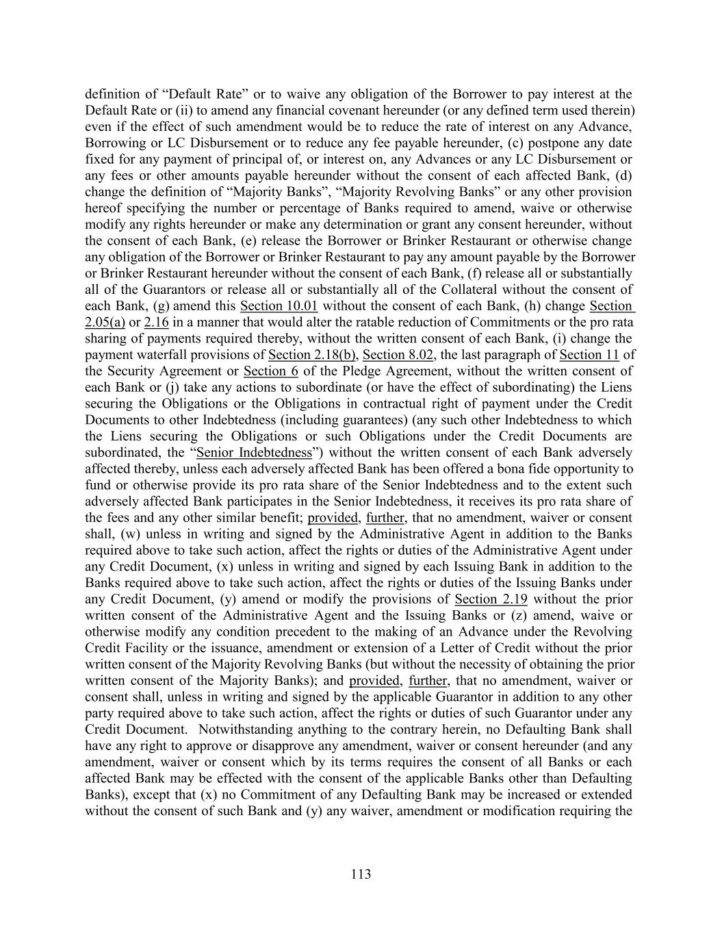 definition of “Default Rate” or to waive any obligation of the Borrower to pay interest at the Default Rate or (ii) to amend any financial covenant hereunder (or any defined term used therein) even if the effect of such amendment would be to reduce the rate of interest on any Advance, Borrowing or LC Disbursement or to reduce any fee payable hereunder, (c) postpone any date fixed for any payment of principal of, or interest on, any Advances or any LC Disbursement or any fees or other amounts payable hereunder without the consent of each affected Bank, (d) change the definition of “Majority Banks”, “Majority Revolving Banks” or any other provision hereof specifying the number or percentage of Banks required to amend, waive or otherwise modify any rights hereunder or make any determination or grant any consent hereunder, without the consent of each Bank, (e) release the Borrower or Brinker Restaurant or otherwise change any obligation of the Borrower or Brinker Restaurant to pay any amount payable by the Borrower or Brinker Restaurant hereunder without the consent of each Bank, (f) release all or substantially all of the Guarantors or release all or substantially all of the Collateral without the consent of each Bank, (g) amend this Section 10.01 without the consent of each Bank, (h) change Section 2.05(a) or 2.16 in a manner that would alter the ratable reduction of Commitments or the pro rata sharing of payments required thereby, without the written consent of each Bank, (i) change the payment waterfall provisions of Section 2.18(b), Section 8.02, the last paragraph of Section 11 of the Security Agreement or Section 6 of the Pledge Agreement, without the written consent of each Bank or (j) take any actions to subordinate (or have the effect of subordinating) the Liens securing the Obligations or the Obligations in contractual right of payment under the Credit Documents to other Indebtedness (including guarantees) (any such other Indebtedness to which the Liens securing the Obligations or such Obligations under the Credit Documents are subordinated, the “Senior Indebtedness”) without the written consent of each Bank adversely affected thereby, unless each adversely affected Bank has been offered a bona fide opportunity to fund or otherwise provide its pro rata share of the Senior Indebtedness and to the extent such adversely affected Bank participates in the Senior Indebtedness, it receives its pro rata share of the fees and any other similar benefit; provided, further, that no amendment, waiver or consent shall, (w) unless in writing and signed by the Administrative Agent in addition to the Banks required above to take such action, affect the rights or duties of the Administrative Agent under any Credit Document, (x) unless in writing and signed by each Issuing Bank in addition to the Banks required above to take such action, affect the rights or duties of the Issuing Banks under any Credit Document, (y) amend or modify the provisions of Section 2.19 without the prior written consent of the Administrative Agent and the Issuing Banks or (z) amend, waive or otherwise modify any condition precedent to the making of an Advance under the Revolving Credit Facility or the issuance, amendment or extension of a Letter of Credit without the prior written consent of the Majority Revolving Banks (but without the necessity of obtaining the prior written consent of the Majority Banks); and provided, further, that no amendment, waiver or consent shall, unless in writing and signed by the applicable Guarantor in addition to any other party required above to take such action, affect the rights or duties of such Guarantor under any Credit Document. Notwithstanding anything to the contrary herein, no Defaulting Bank shall have any right to approve or disapprove any amendment, waiver or consent hereunder (and any amendment, waiver or consent which by its terms requires the consent of all Banks or each affected Bank may be effected with the consent of the applicable Banks other than Defaulting Banks), except that (x) no Commitment of any Defaulting Bank may be increased or extended without the consent of such Bank and (y) any waiver, amendment or modification requiring the 113